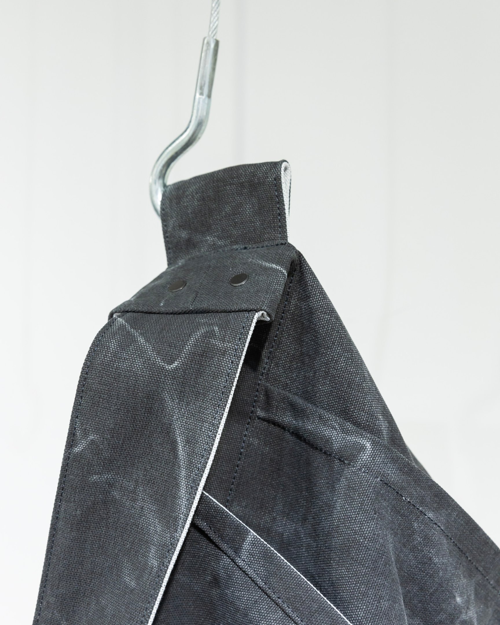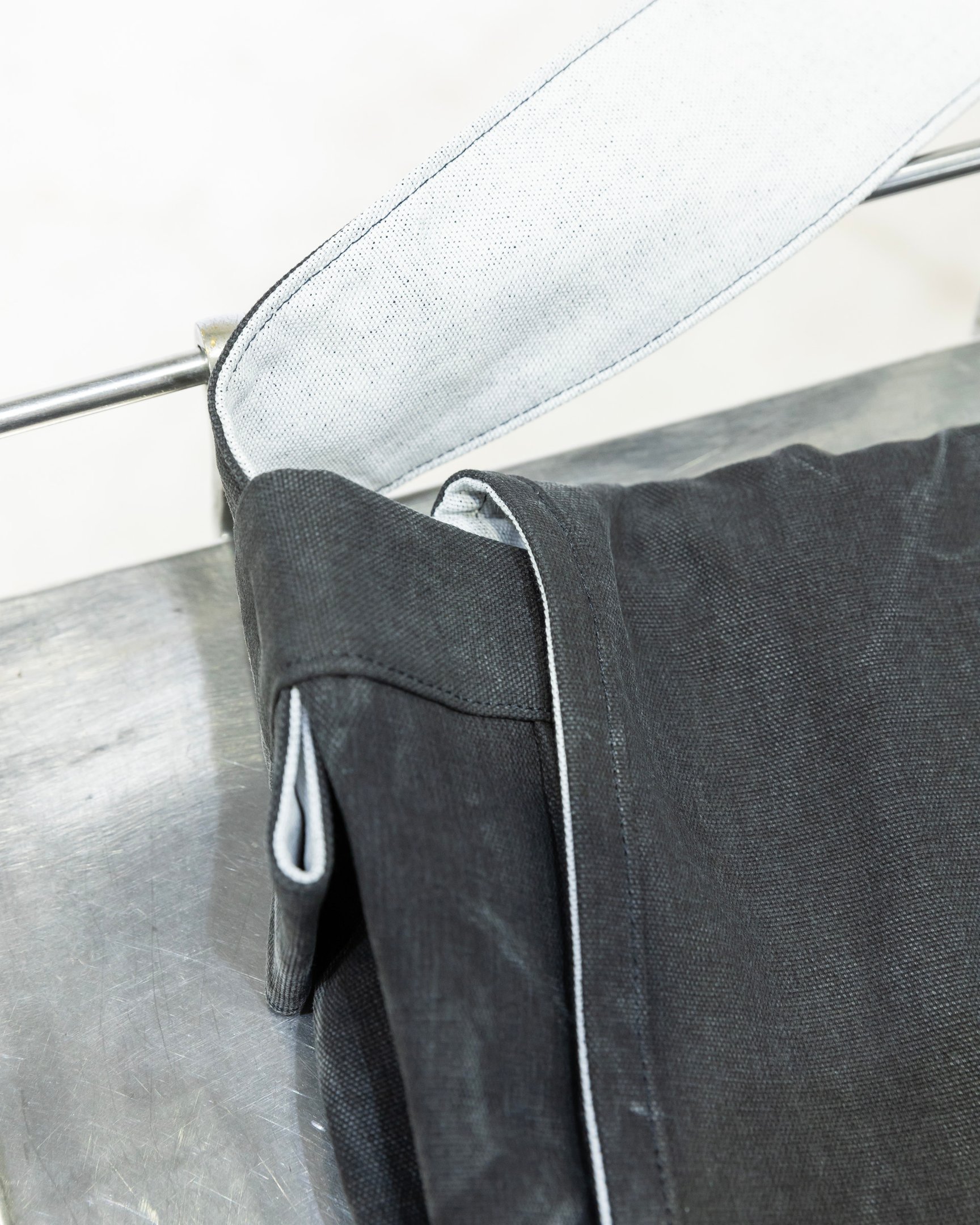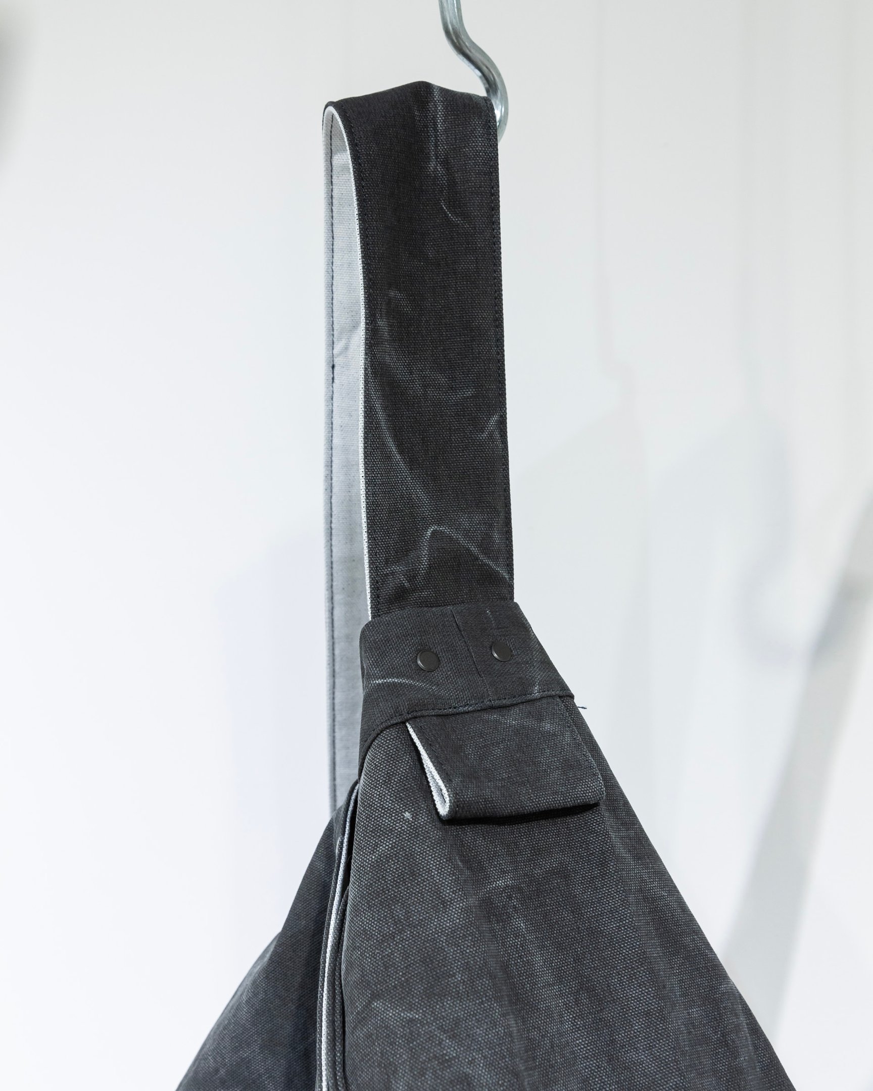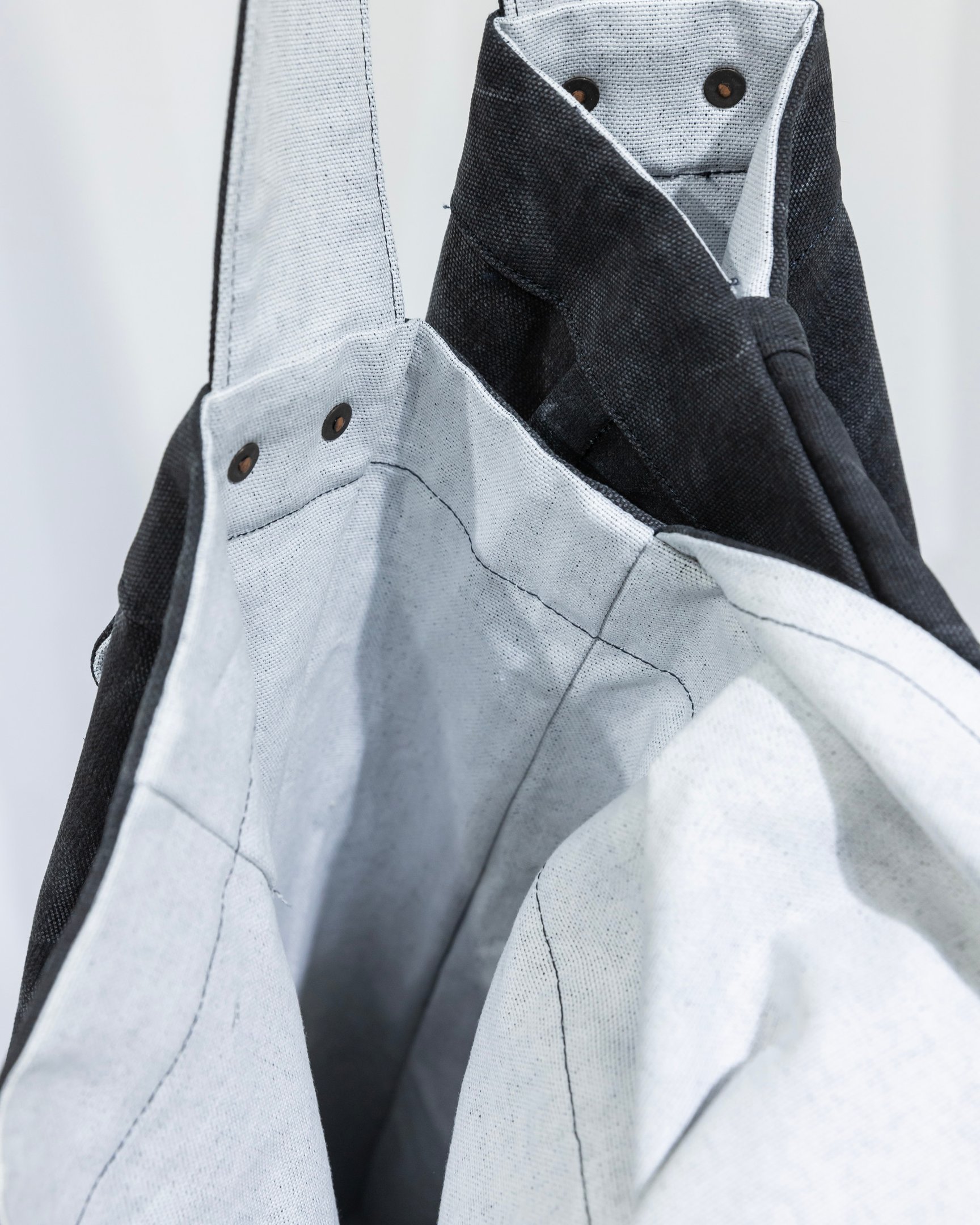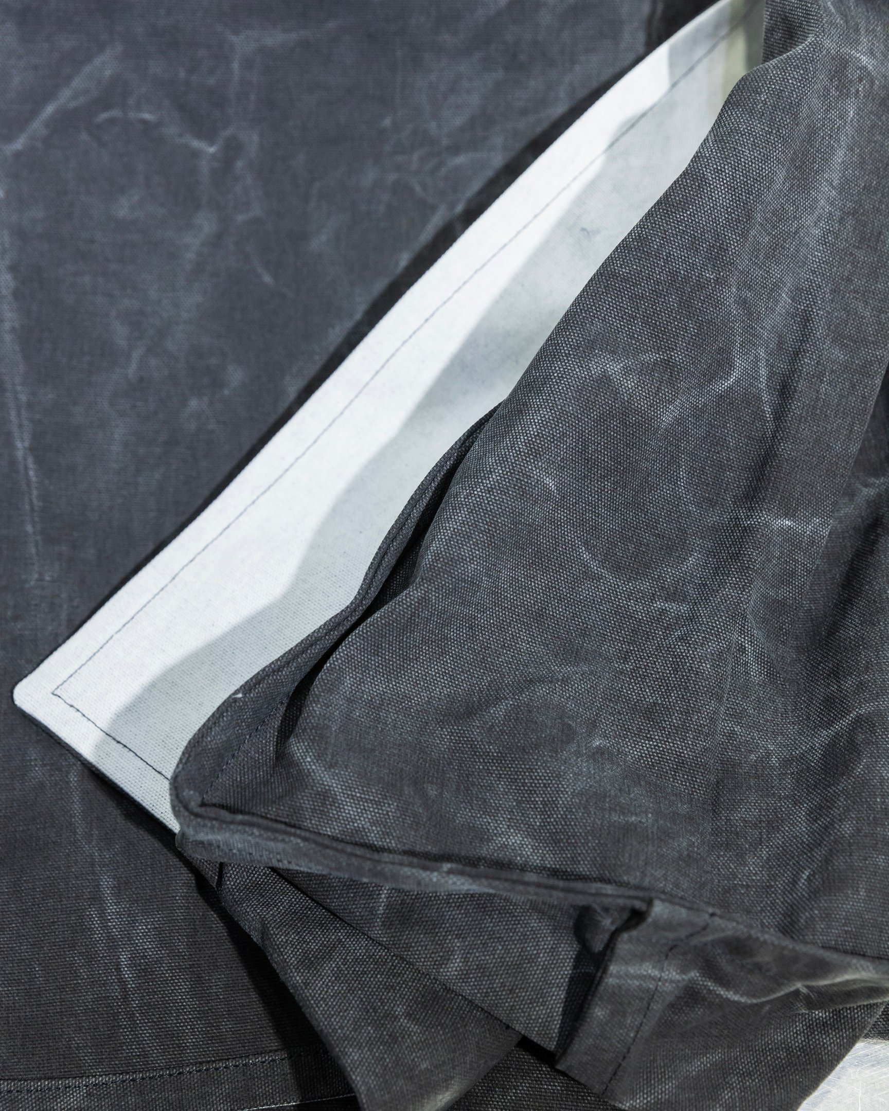 「コントール(kontor)と作った今作には洋服で展開されていた生地を使わせてもらいました。特殊な顔料を吹きつけたコットン100%のキャンバス地で、洗うことによって次第に表面がひび割れていきます。そのさまや、気楽にも扱える材質が、当時使用していたニュースペーパーバッグとリンクするように感じられたからです」
