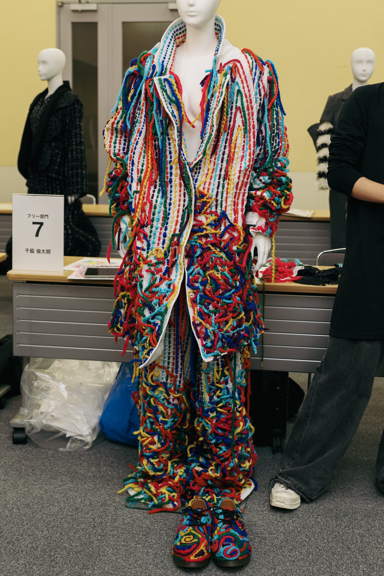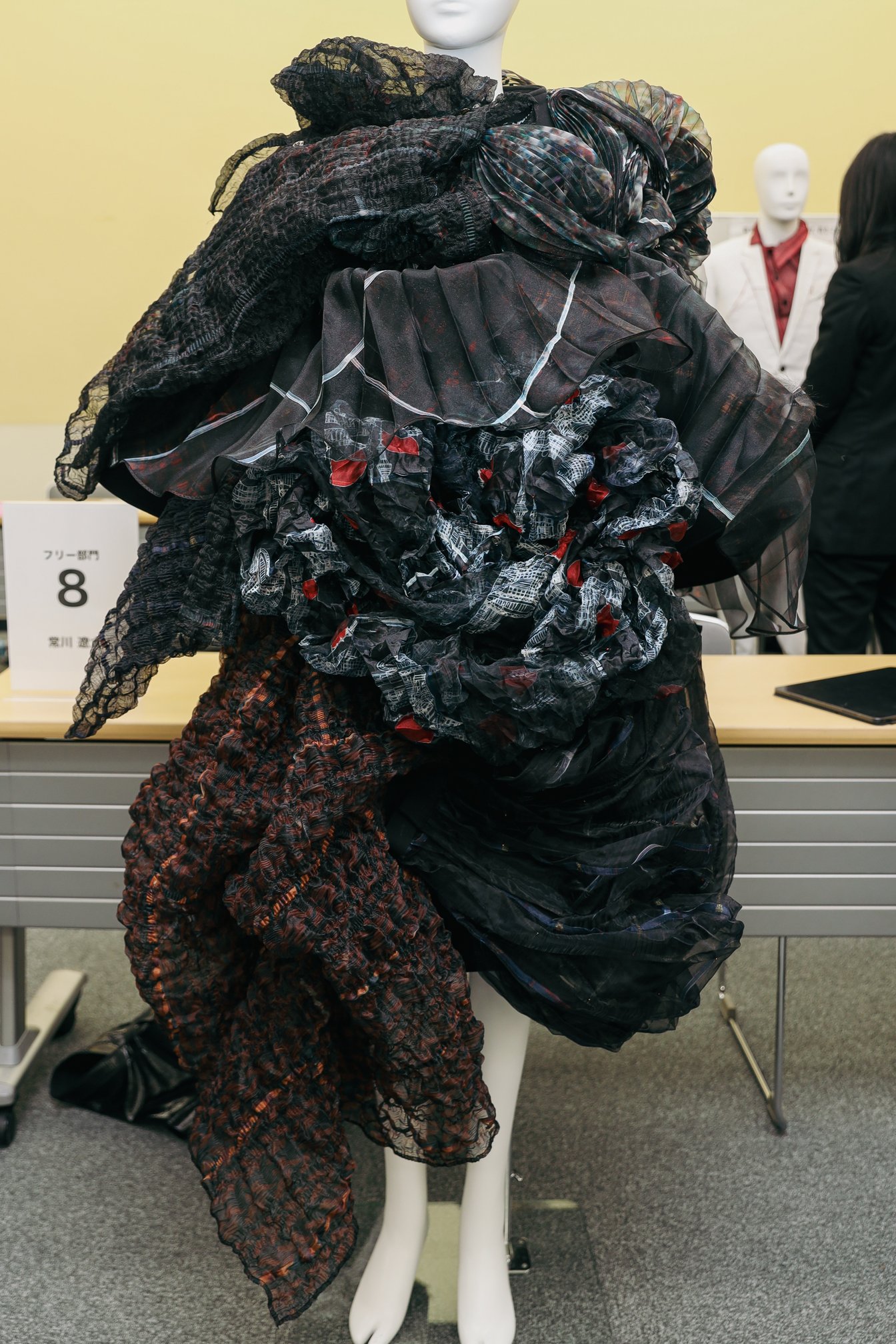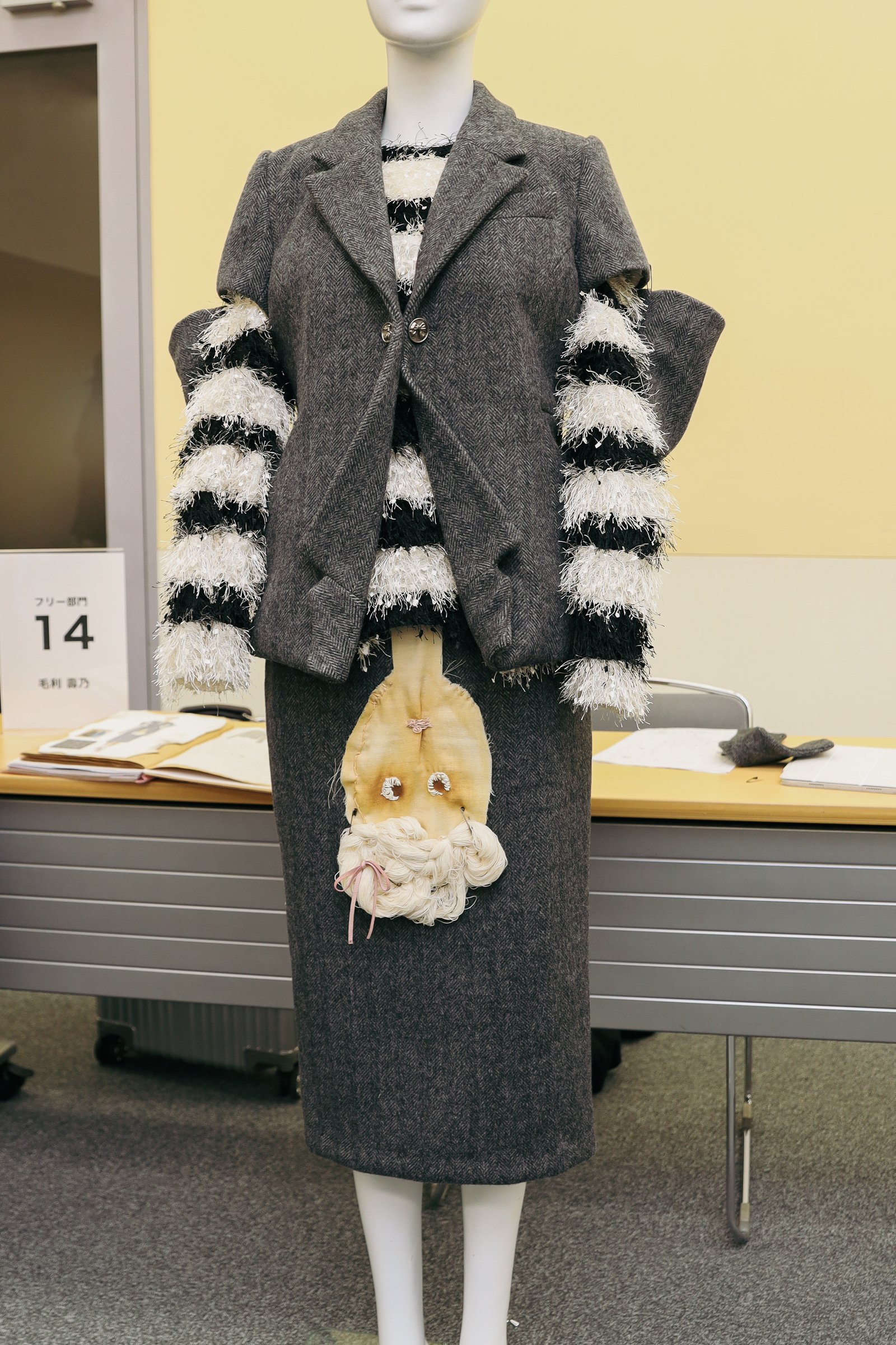 また、パターンやトワル組立に着目した東京モード学園の常川遼太の作品について「一着のつくり方が従来と違う方法であることがポイント。一見すると混沌としただけの物体にみえ、結果として生まれてきたような一着にみえてしまうが、よく考え、よく練られて、作られており、新たな形に到達していると思う」と言及した。
