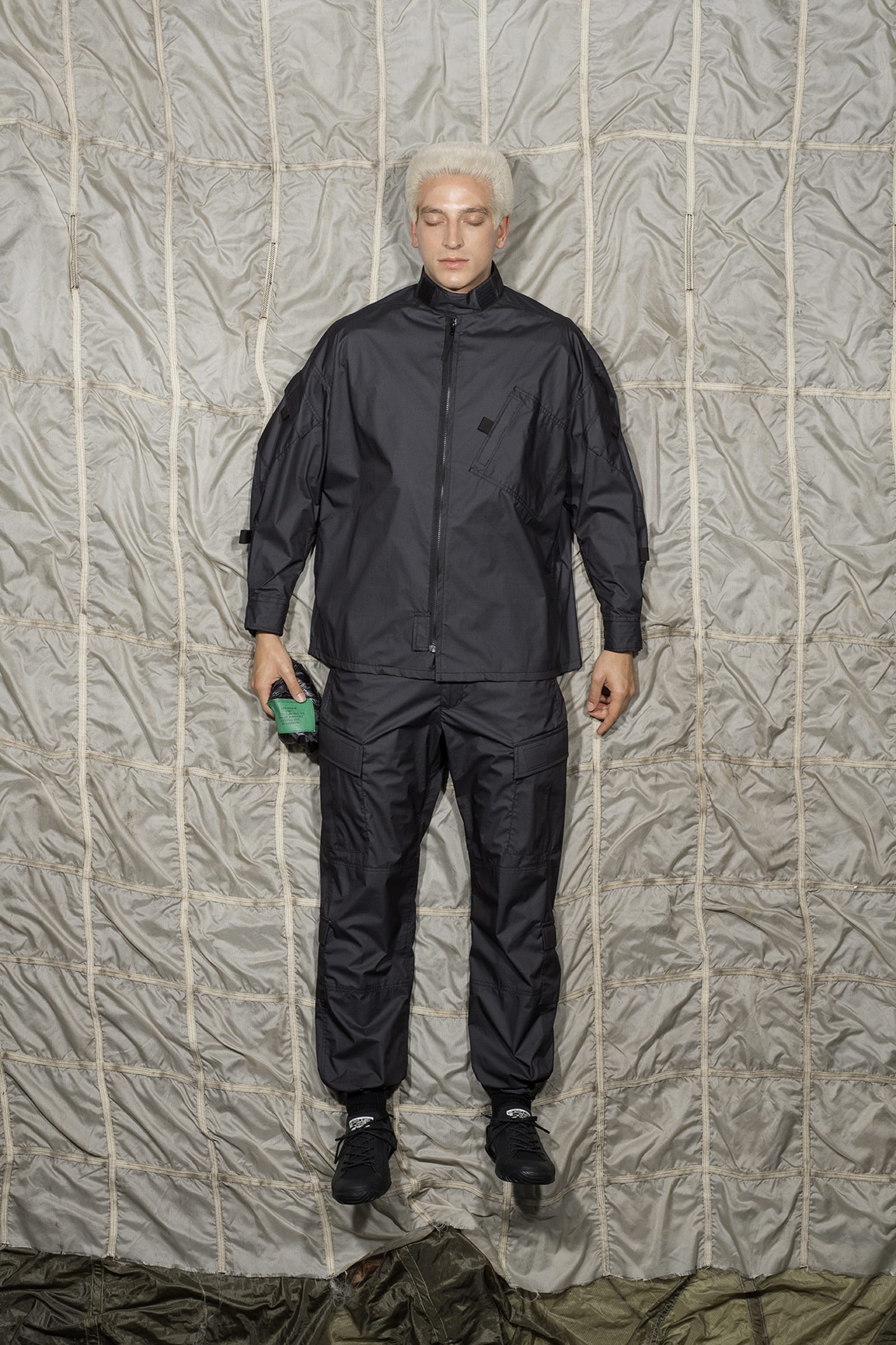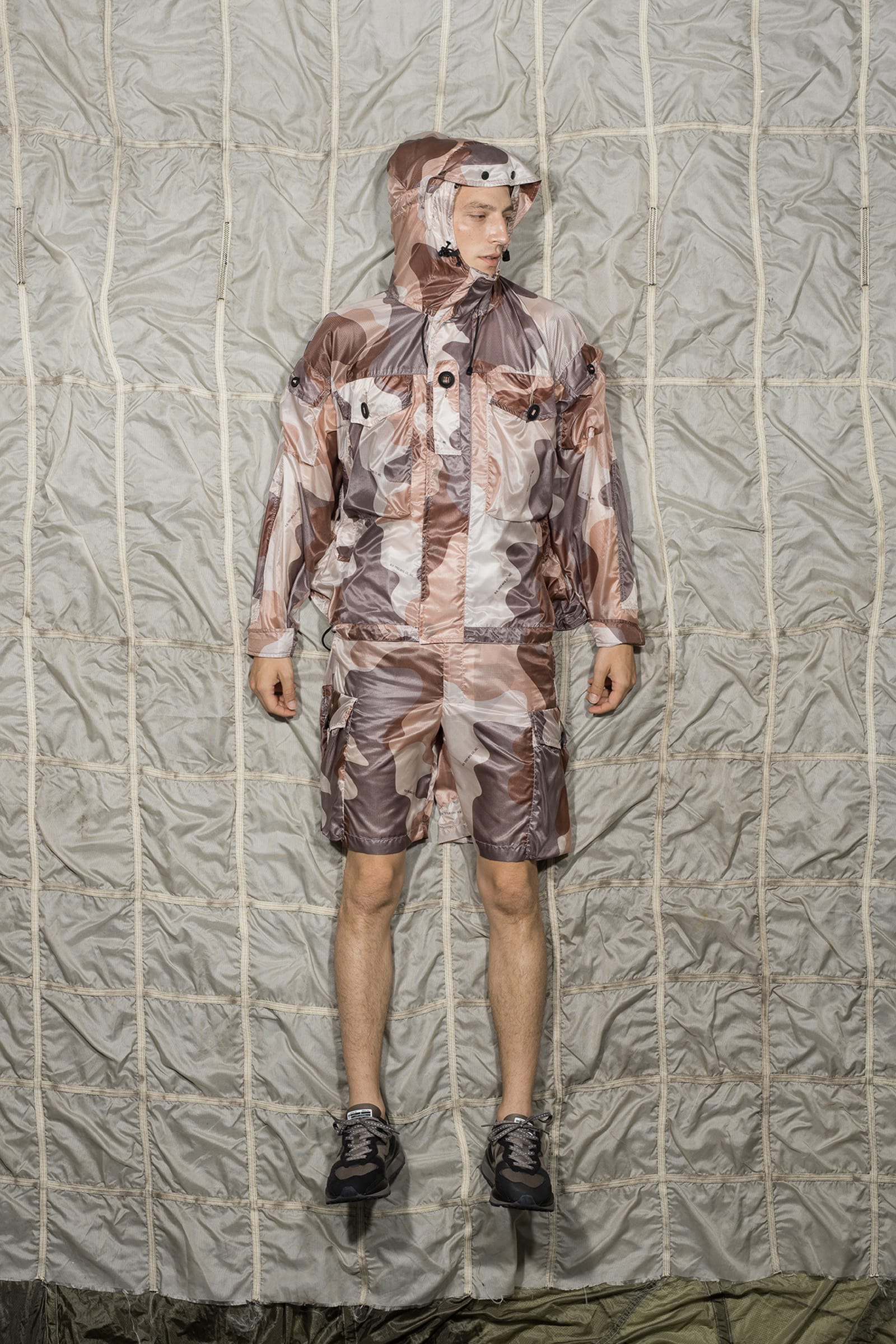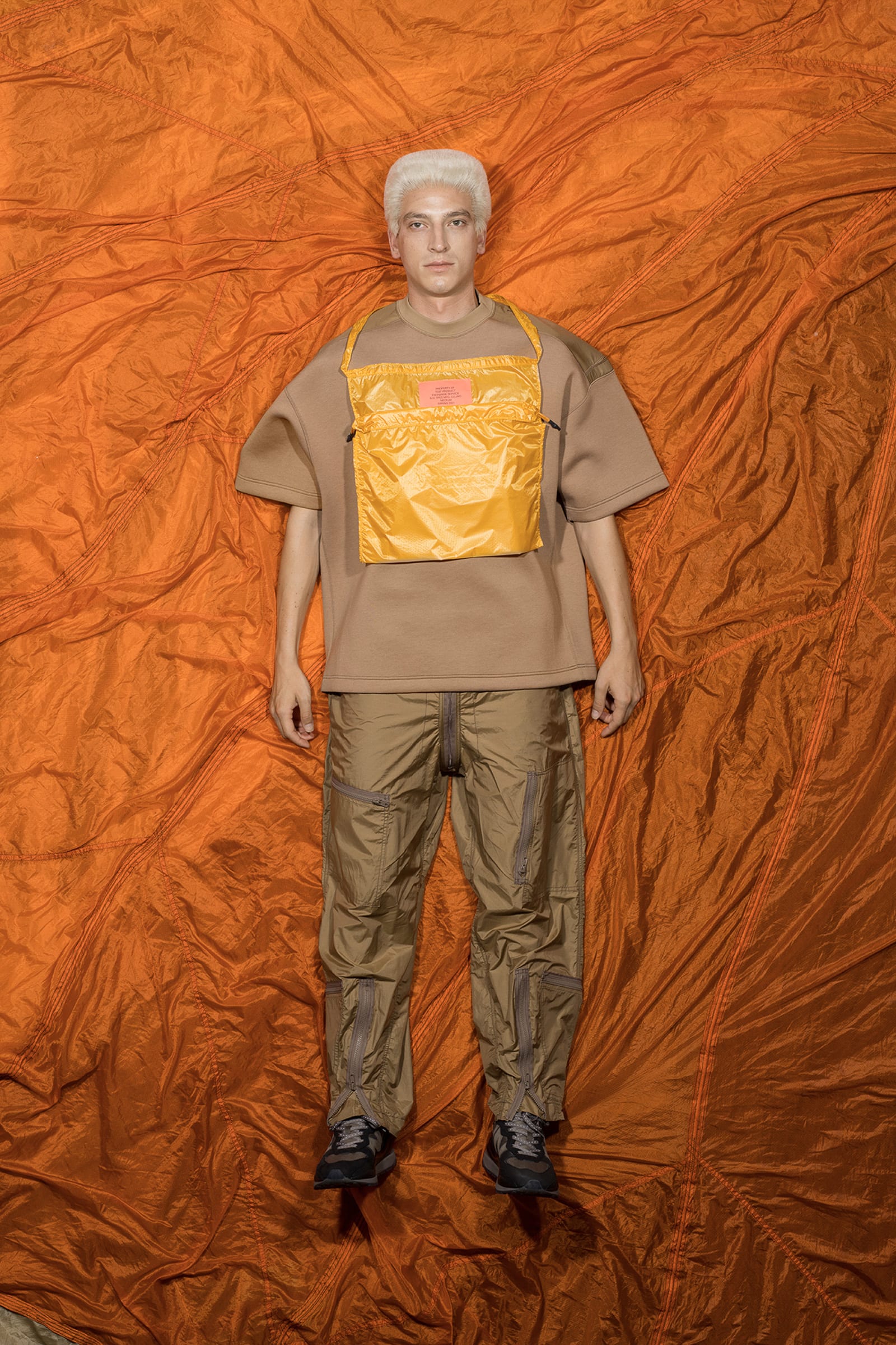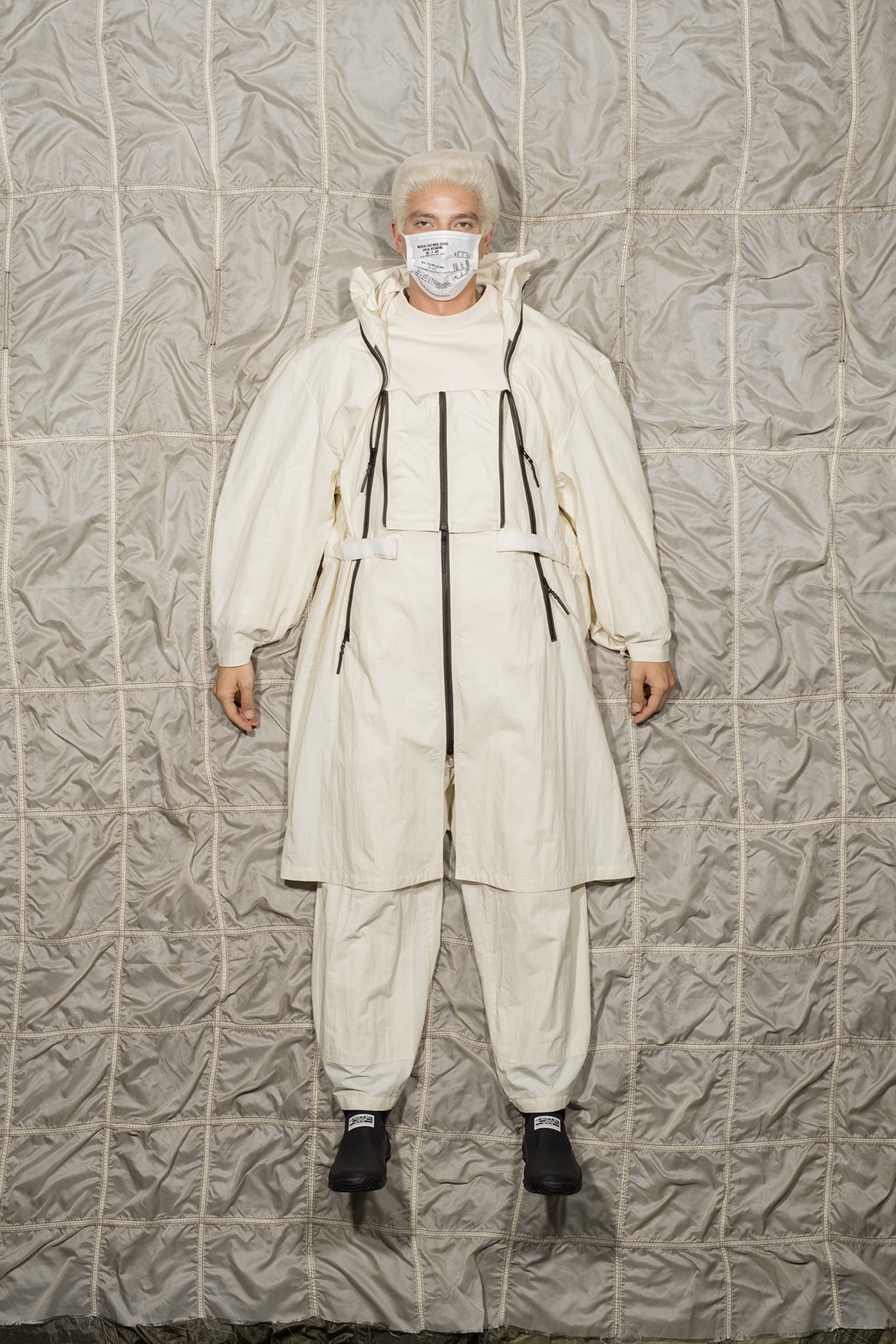 宇宙空間に浮遊しているような構図のルックは、ミリタリーの土臭さとは無縁で、軽やかな素材感と現代的なフォルムで構成されている。コットンチノのシャツとパンツに少しだけ色味の違うコートを合わせたベージュの変則スリーピースは、丸みを帯びたシルエットにすることで土臭さを解消。武器を収納するためのベストは、現代の武器=ガジェットを収納できるバッグいらずのビッグサイズのベストにアレンジしている。フードレスのモッズコートや光沢のあるパーカーに使われた迷彩柄は、1940年代の英国軍の特殊迷彩をコラージュしたもの。「USSC」のロゴが入ったトレーニングウェアは、今年発足した米宇宙軍のオマージュで、今は叶わぬ"旅"への究極の願望を形にしたとも解釈できる。