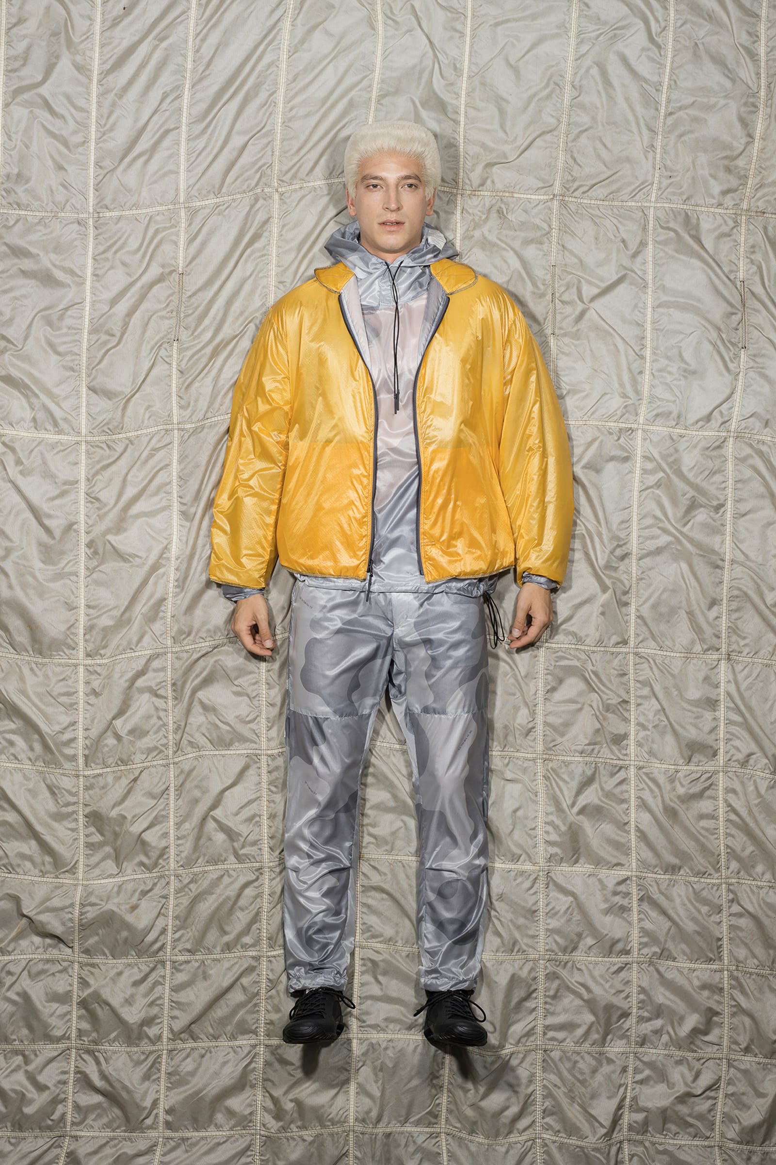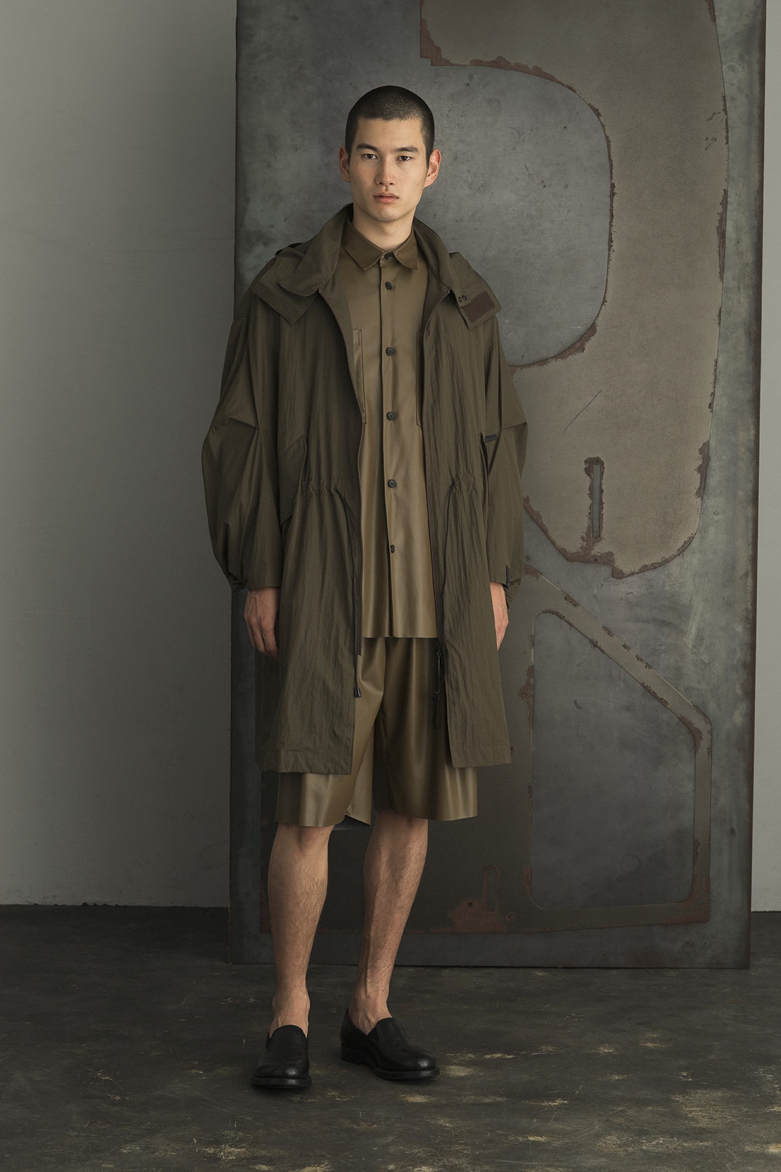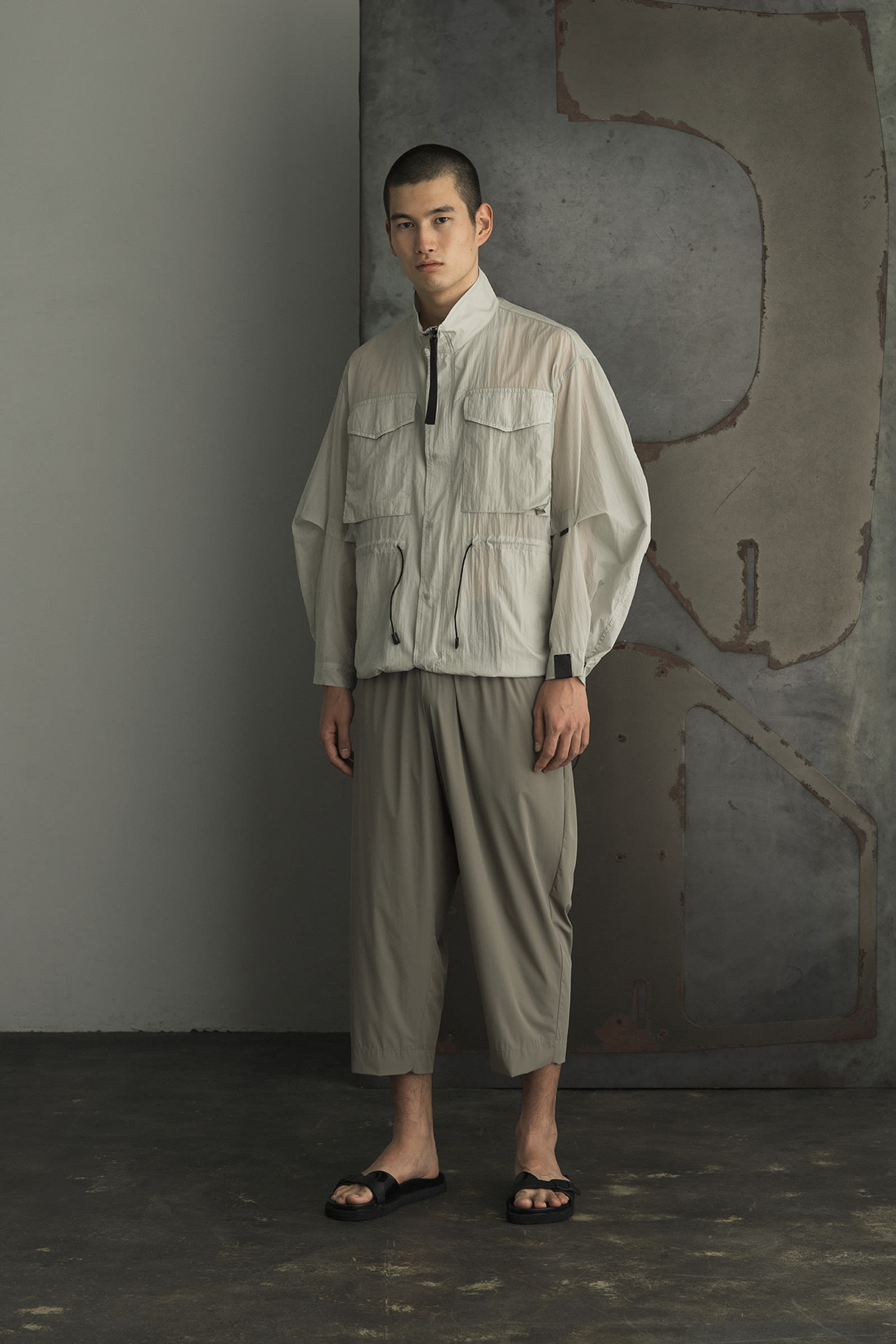 宇宙空間に浮遊しているような構図のルックは、ミリタリーの土臭さとは無縁で、軽やかな素材感と現代的なフォルムで構成されている。コットンチノのシャツとパンツに少しだけ色味の違うコートを合わせたベージュの変則スリーピースは、丸みを帯びたシルエットにすることで土臭さを解消。武器を収納するためのベストは、現代の武器=ガジェットを収納できるバッグいらずのビッグサイズのベストにアレンジしている。フードレスのモッズコートや光沢のあるパーカーに使われた迷彩柄は、1940年代の英国軍の特殊迷彩をコラージュしたもの。「USSC」のロゴが入ったトレーニングウェアは、今年発足した米宇宙軍のオマージュで、今は叶わぬ"旅"への究極の願望を形にしたとも解釈できる。