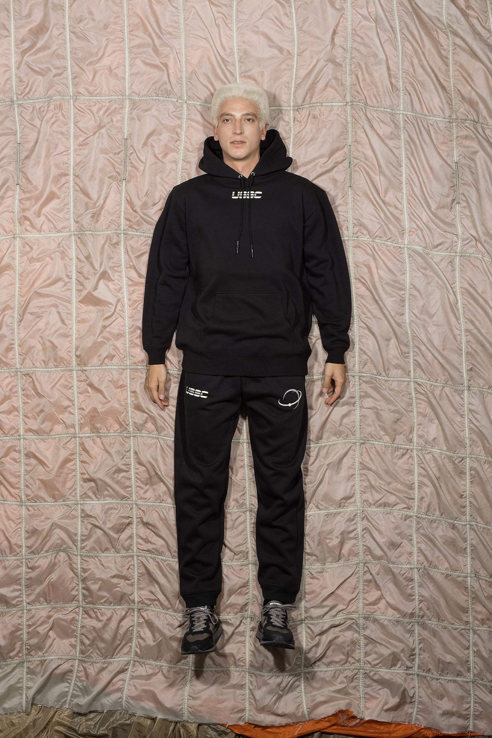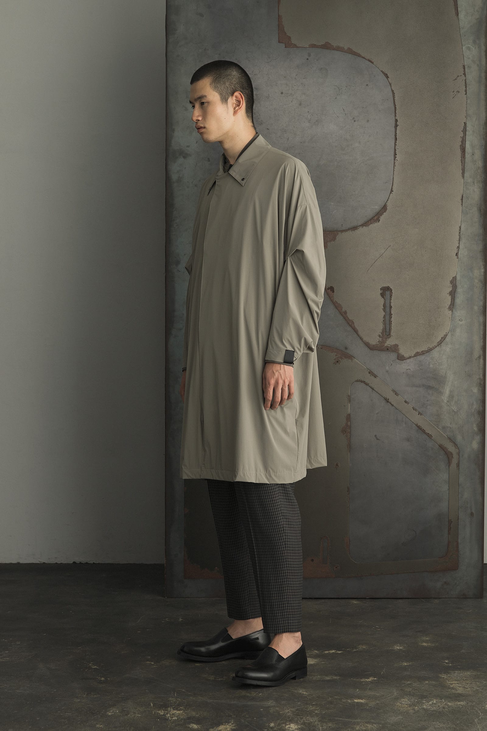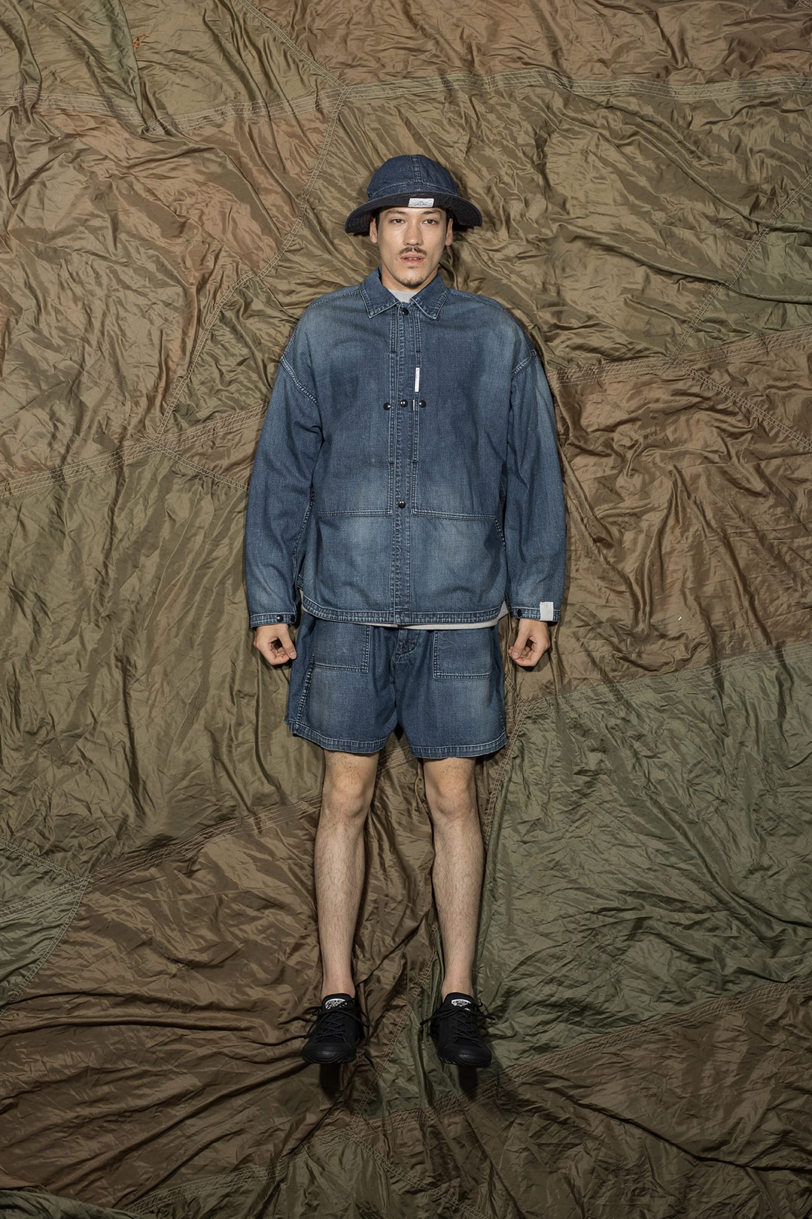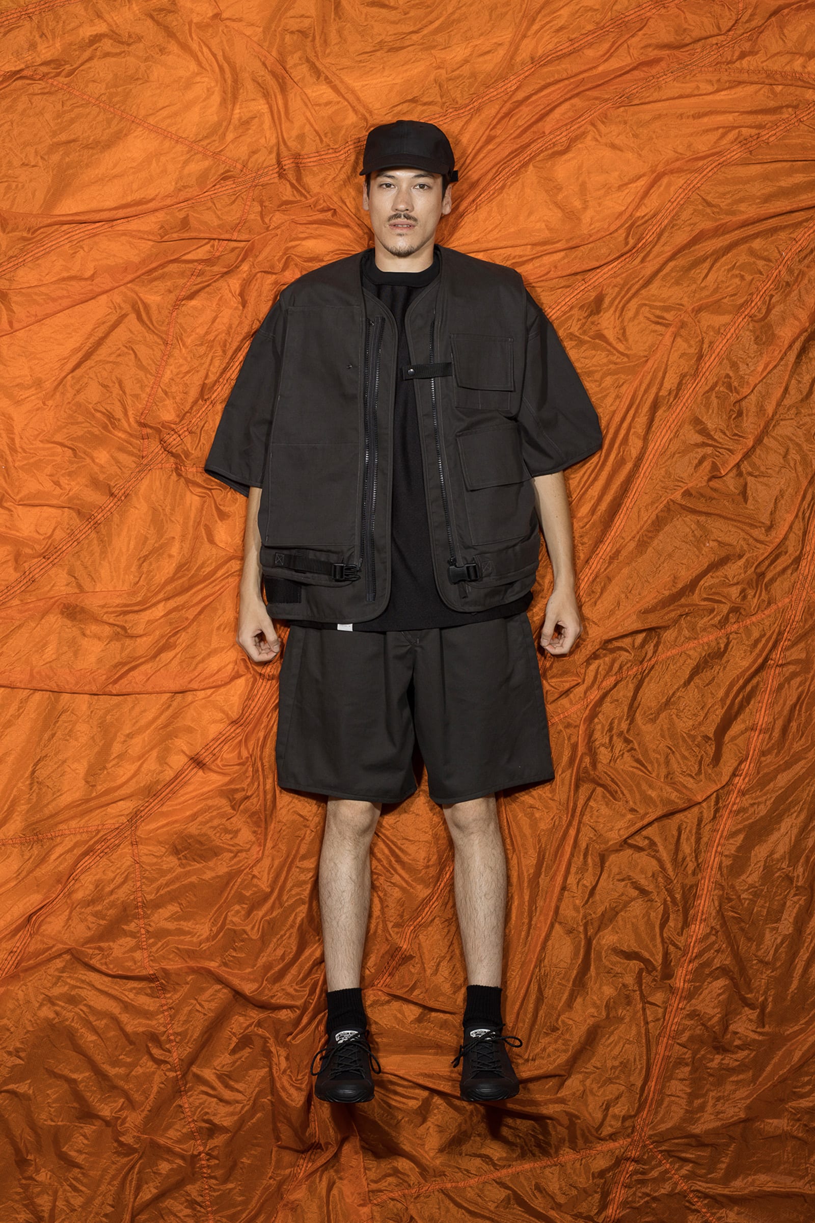 宇宙空間に浮遊しているような構図のルックは、ミリタリーの土臭さとは無縁で、軽やかな素材感と現代的なフォルムで構成されている。コットンチノのシャツとパンツに少しだけ色味の違うコートを合わせたベージュの変則スリーピースは、丸みを帯びたシルエットにすることで土臭さを解消。武器を収納するためのベストは、現代の武器=ガジェットを収納できるバッグいらずのビッグサイズのベストにアレンジしている。フードレスのモッズコートや光沢のあるパーカーに使われた迷彩柄は、1940年代の英国軍の特殊迷彩をコラージュしたもの。「USSC」のロゴが入ったトレーニングウェアは、今年発足した米宇宙軍のオマージュで、今は叶わぬ"旅"への究極の願望を形にしたとも解釈できる。