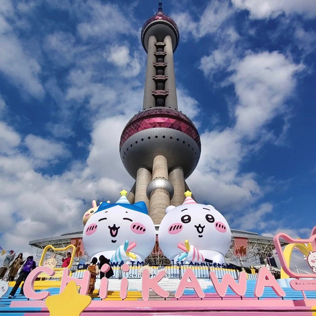 空に突き刺さるみたいな塔の根元で、巨大なちいかわとその仲間たちがあまりにも無邪気な笑顔を浮かべている。パステルカラーのやわらかさと、無機質なコンクリートの冷たさ。その落差が、現実の輪郭を少しずつ曖昧にしていく。見慣れたはずの上海という都市の象徴そのものが、カワイイという世界観に塗り替えられていくように見えた。