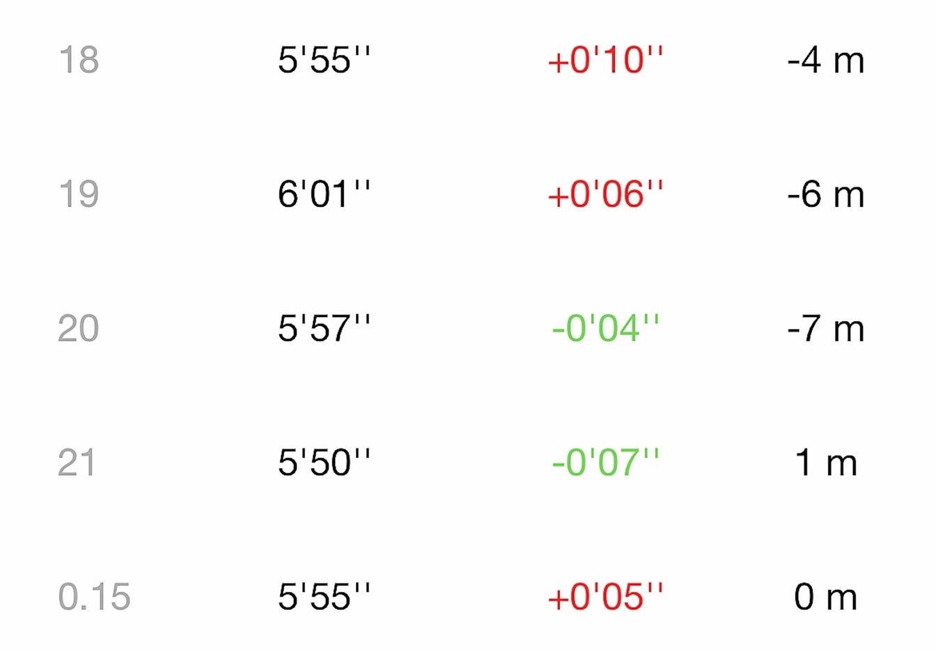 ハーフマラソン挑戦時のタイムを記録したアプリ「Nike Run Club」。1〜5kmまでの記録。