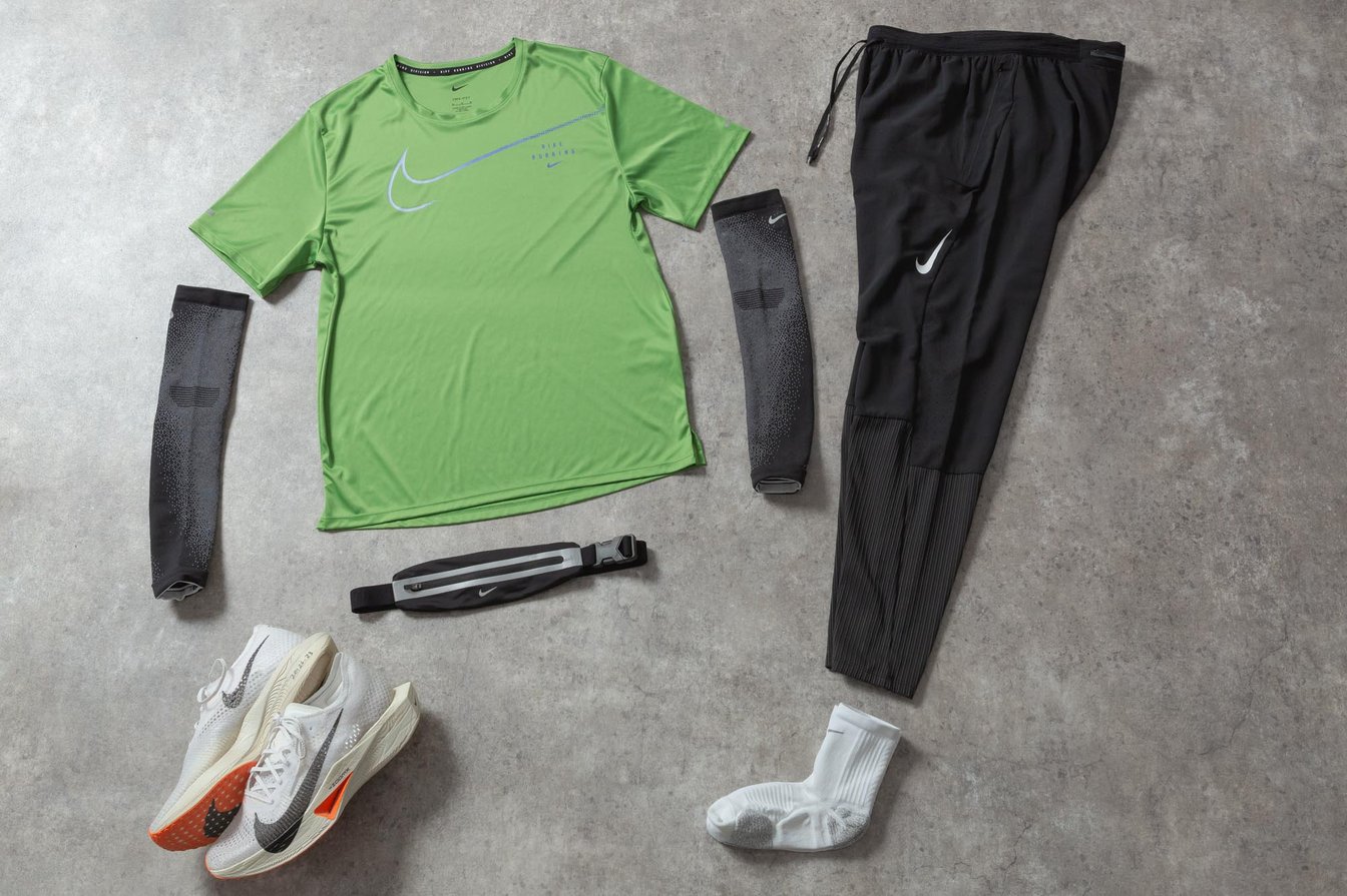 汗をかいてもサラリとした状態をキープする快適な着用感が特徴のNike Dri-FITテクノロジーを搭載したTシャツとパンツ。走行中に揺れにくく邪魔にならないのに、伸縮性があって収納力がある便利アイテムのウエストポーチ。通気性に優れたエンジニアードメッシュのランニングスリーブ。そして、シューズはこれまで本連載の第1回シューズ編で紹介した“怪我の予防”を目指し、安定性を高めた「インヴィンシブル 3」を中心に練習を重ねてきましたが、今回は本番ということでトップアスリートも国内外のさまざまなレースで着用している「ヴェイパーフライ 3」をチョイスしました。