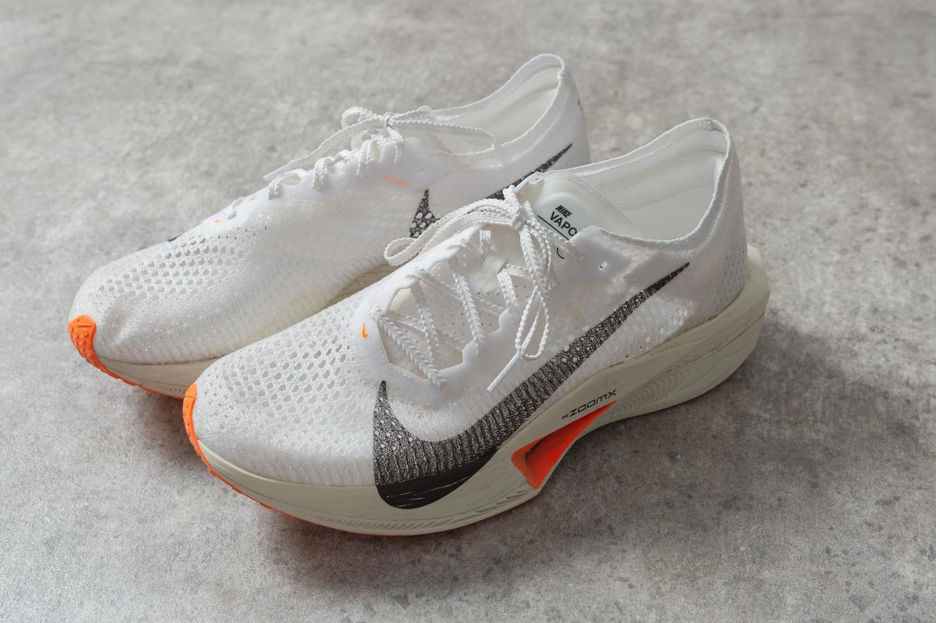 「ヴェイパーフライ」は、初代モデルがマラソングランドチャンピオンシップ(MGC)や2020年の箱根駅伝で「ピンクの厚底シューズ」として話題を集め、第2弾モデルでは東京オリンピックの陸上男子マラソンで表彰台に立った3人が着用していたシリーズ。第3弾となる「ヴェイパーフライ 3」は、前作から安定性とエネルギーリターン率の向上を実現し、「より汎用性が高くなった」と様々なアスリートから支持されています。世界陸連によって「ソールの厚さは40mm以内」と規定が設けられていることから、アウトソールのラバー部分を薄くして分量を増やしたミッドソールの「ズームX フォーム」や、ミッドソールに搭載されているカーボンプレート、部分ごとに編み方を変えて必要な箇所をサポートするフライニットアッパー、曲線を描いて地面との設置面積を増やした前足部などが特徴で、“速さ”と“安定性”を追求したデザインに仕上げられています。