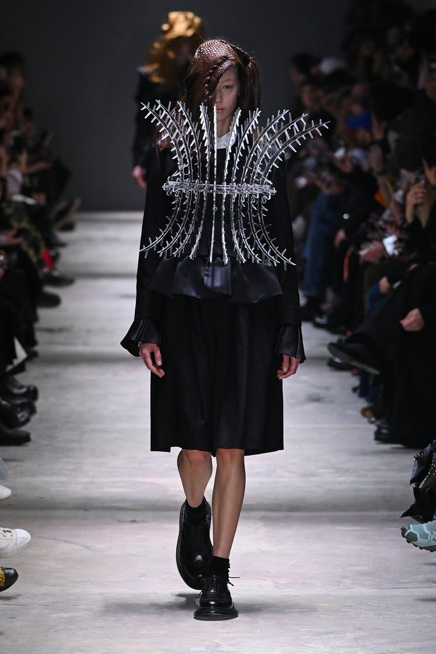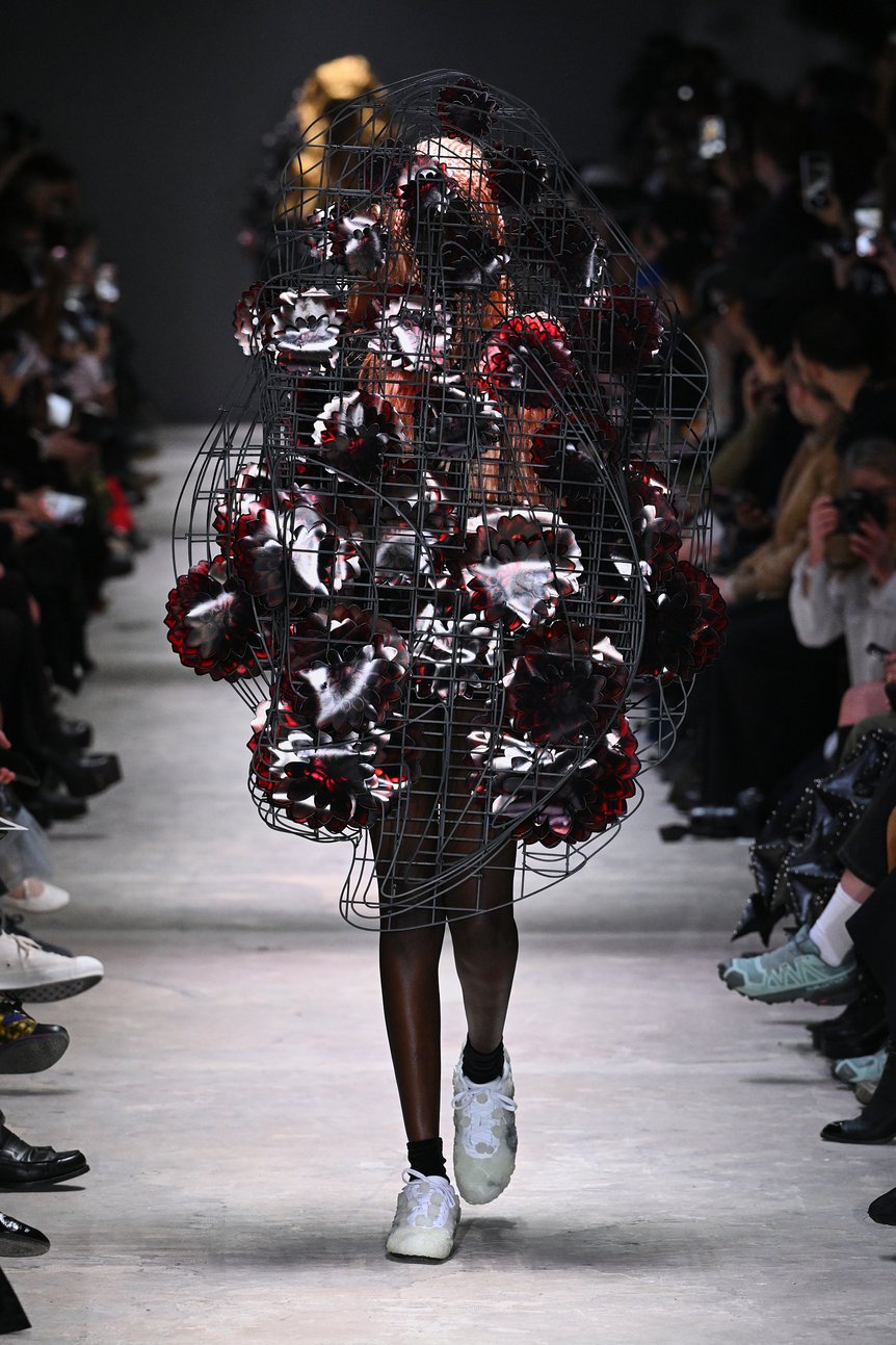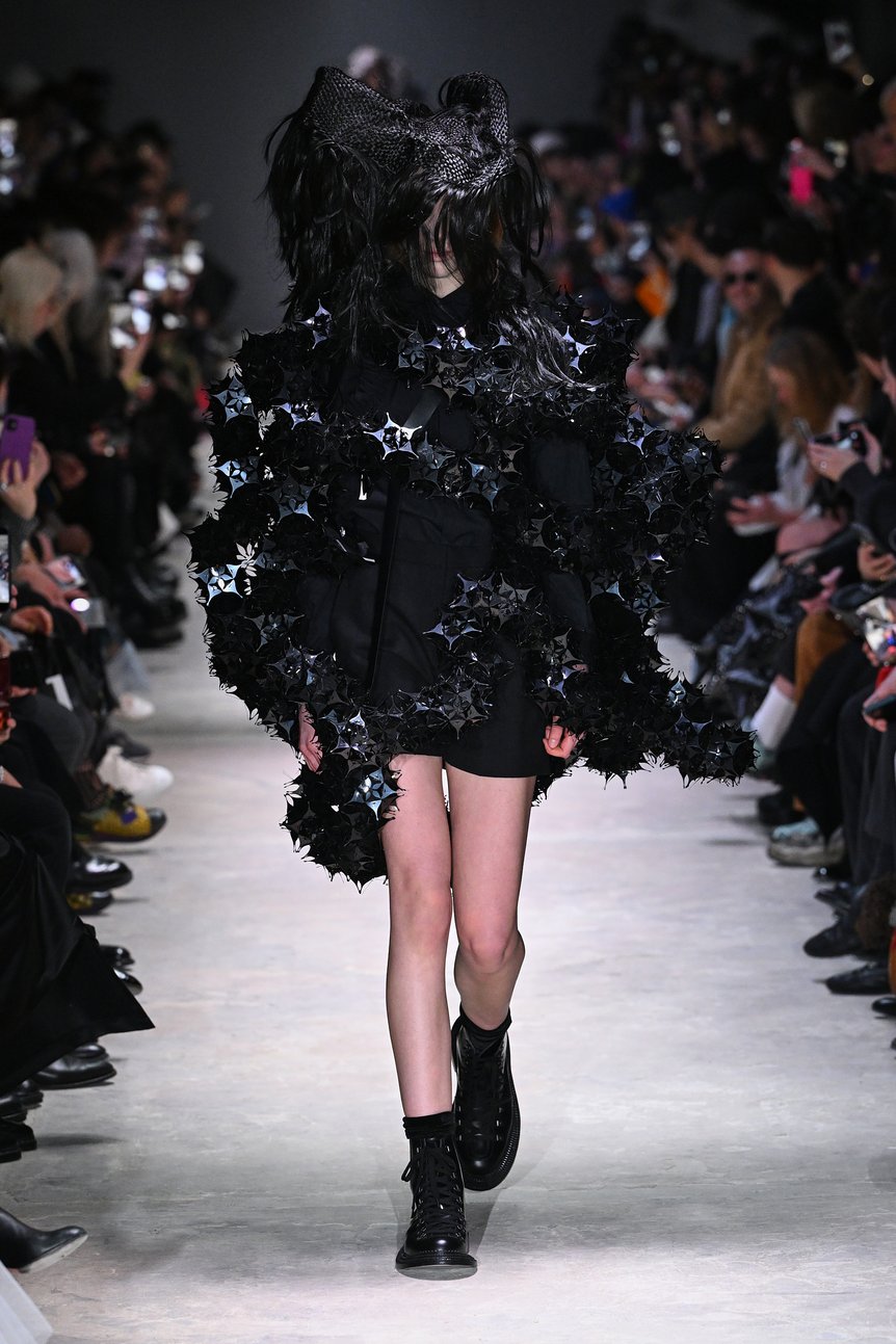 ショーは黒を基調としたルックから始まる。身体を覆うようにパーツを組み上げた構築的なシルエットが続き、ブランドらしい立体的なフォルムがランウェイに現れた。