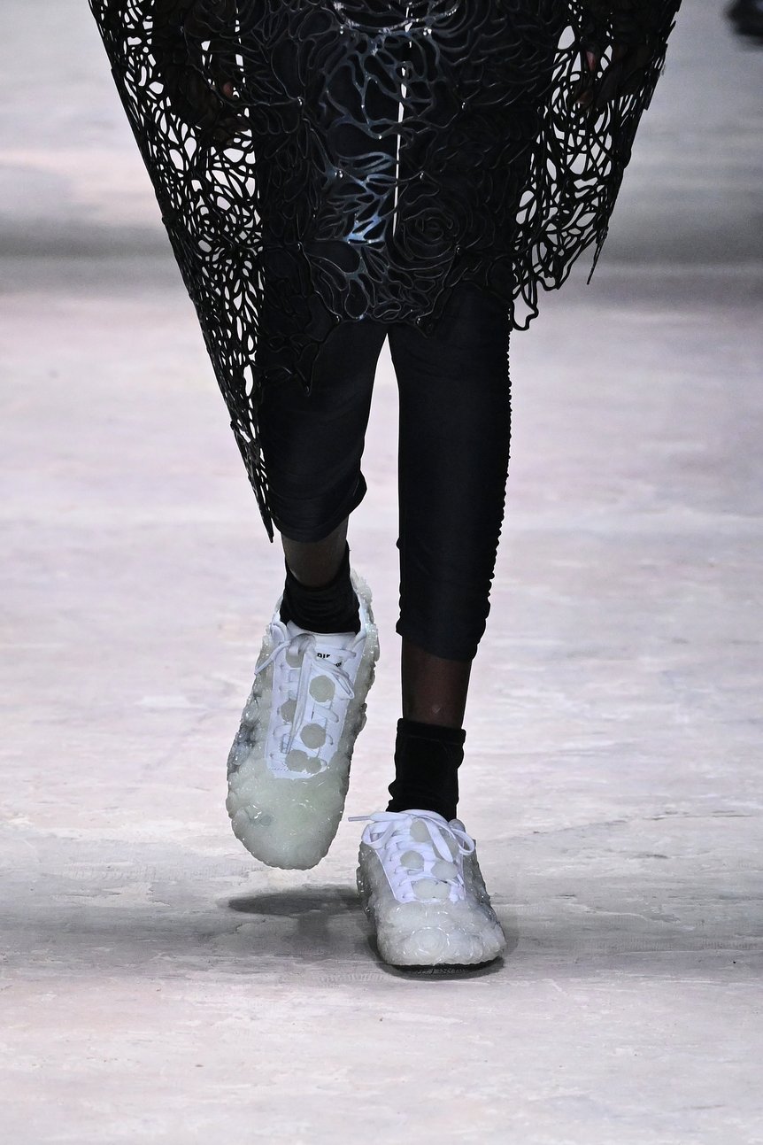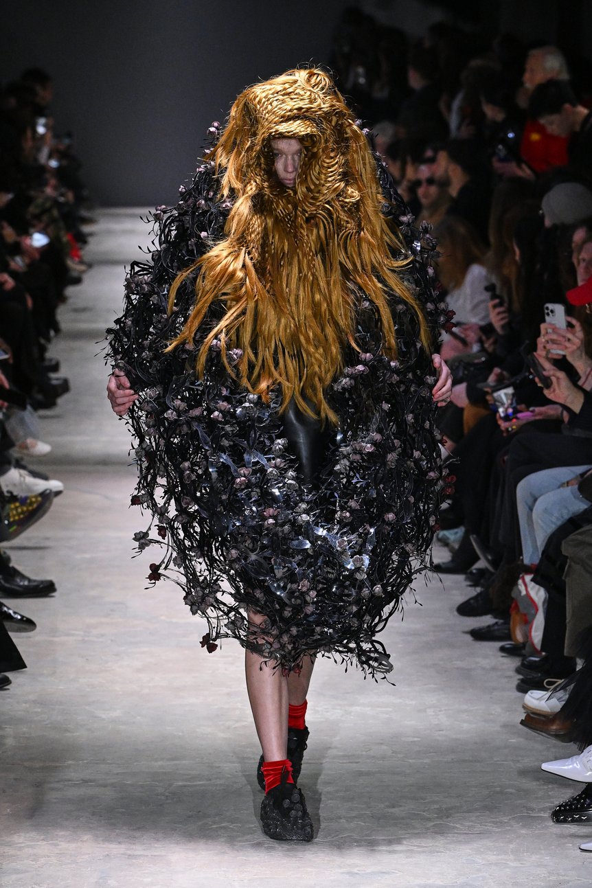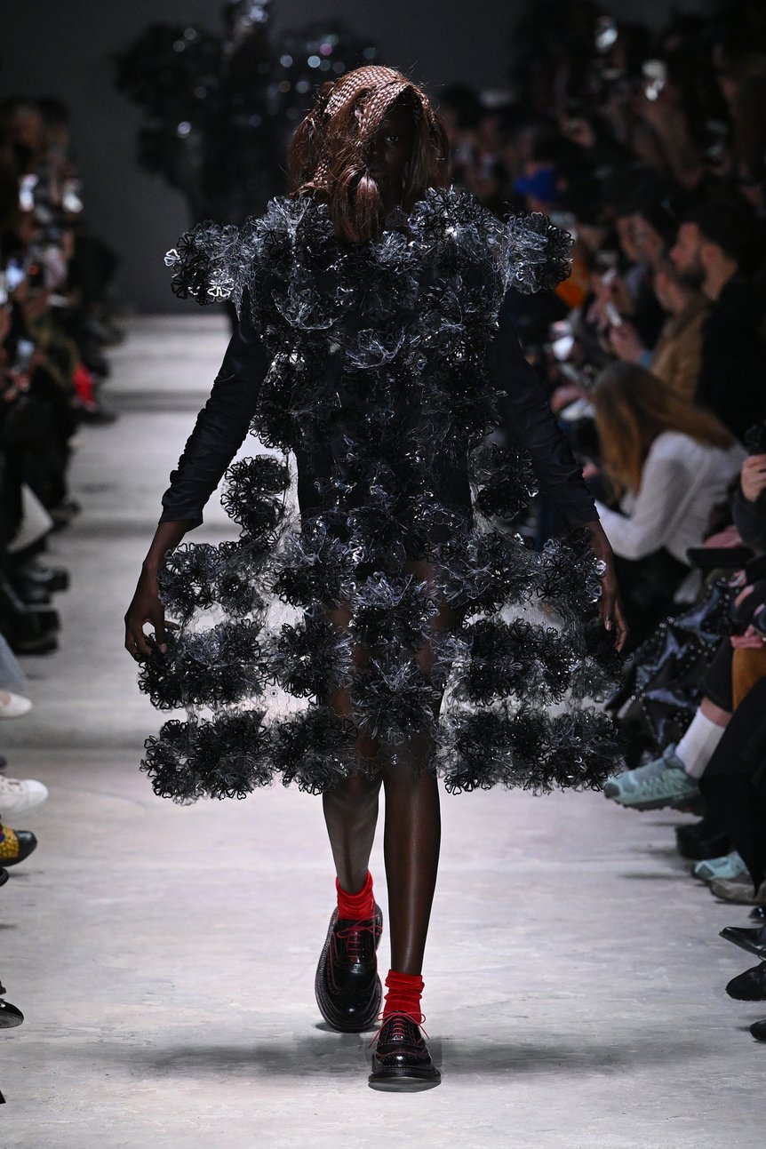ショーは黒を基調としたルックから始まる。身体を覆うようにパーツを組み上げた構築的なシルエットが続き、ブランドらしい立体的なフォルムがランウェイに現れた。