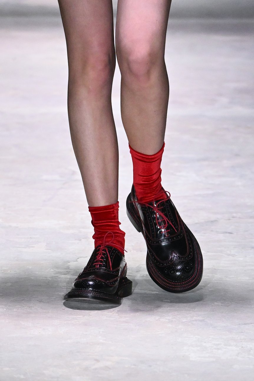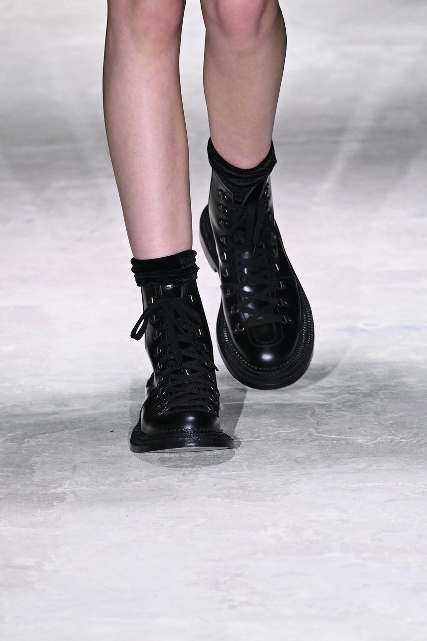 さらに英国の老舗シューズメーカー「グレンソン(GRENSON)」とのブーツが登場。重厚なレザーシューズが構築的なシルエットを足元から支えていた。