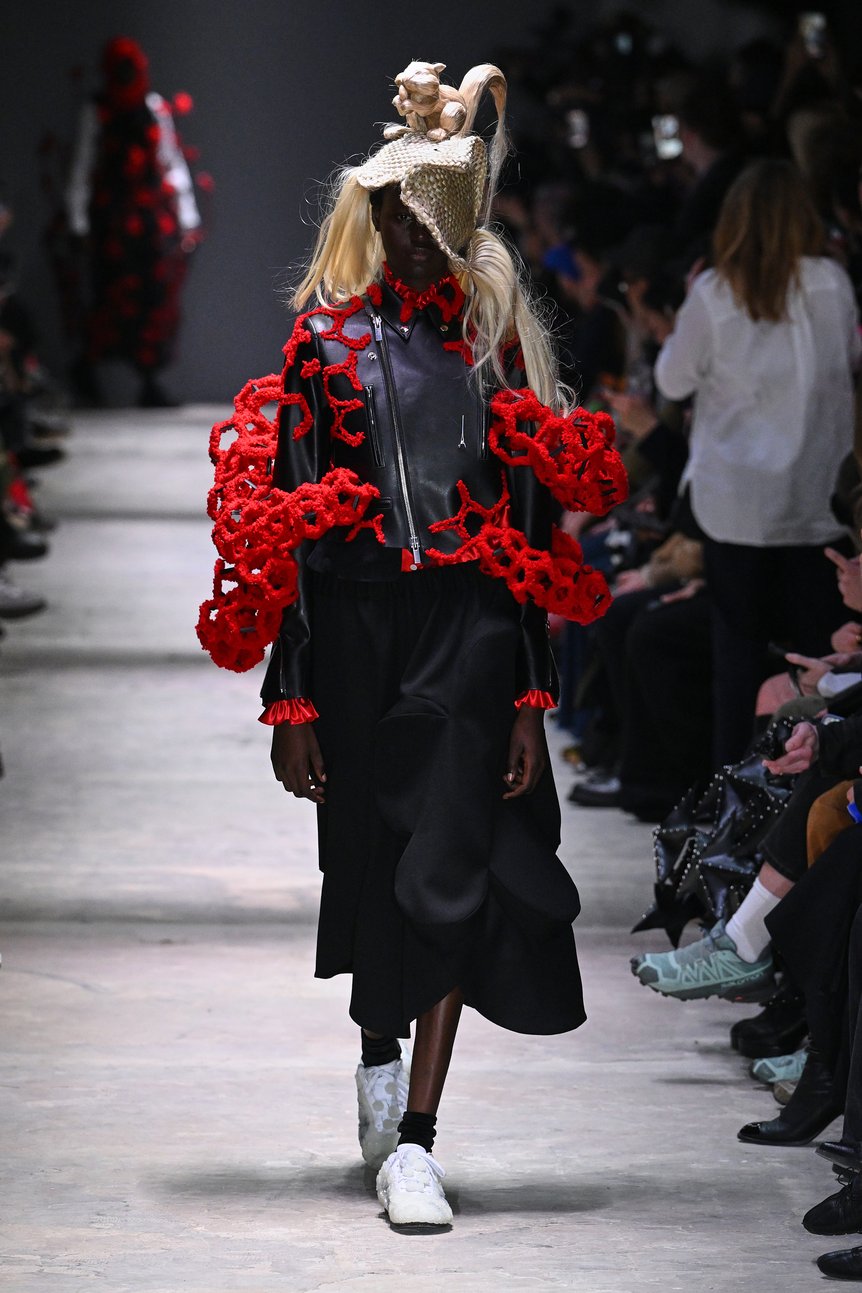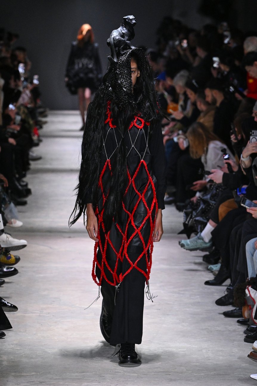 やがて、その黒の世界の中に印象的な赤が現れる。装飾は徐々に増え、赤のモチーフが絡みつくようにあしらわれていく。巨大なウィッグをドクロのごとく刈り込んだ巨大なピースなど、ランウェイに強いコントラストが生まれた。