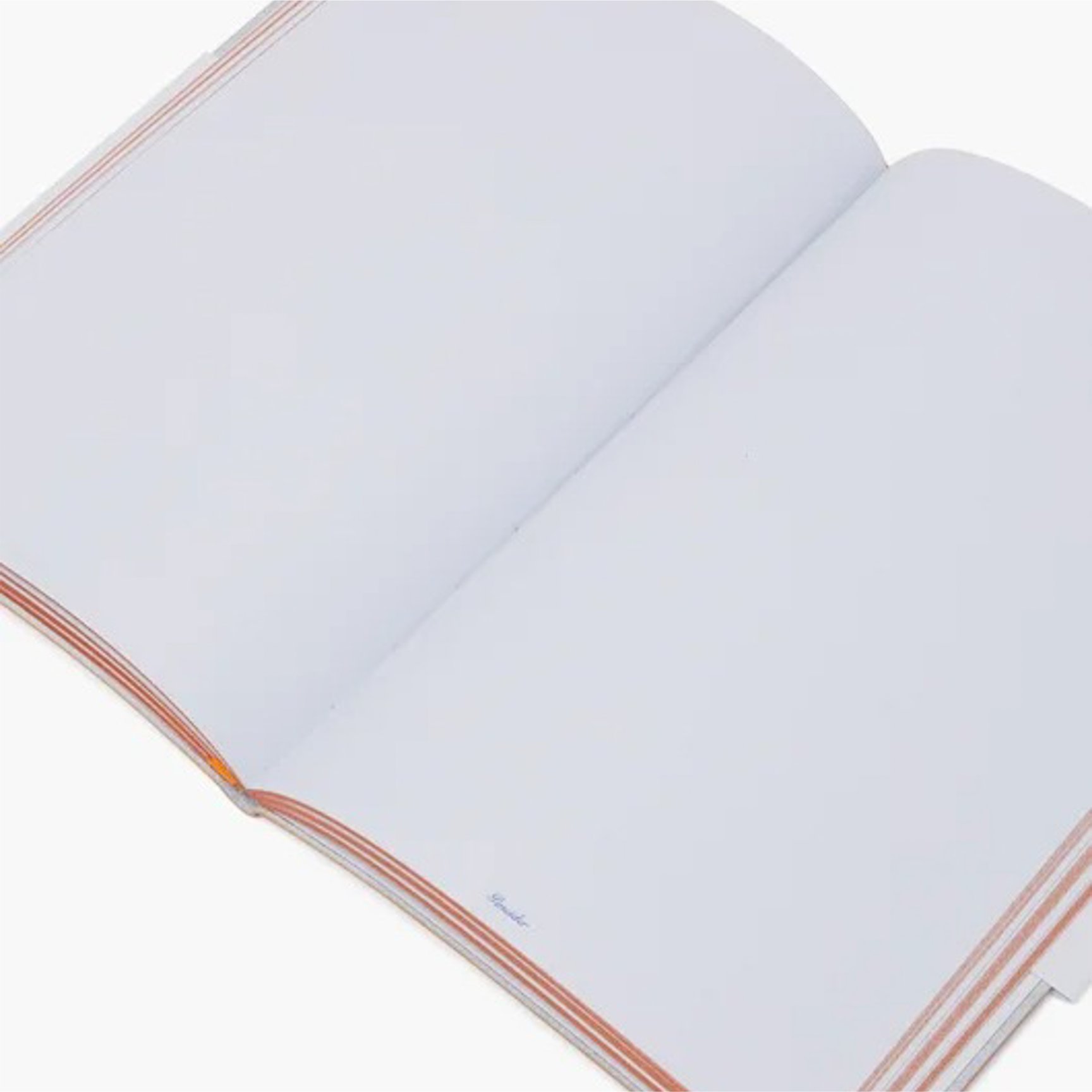 手に取るたびに、気分をポジティブに彩る「ピナイダー(Pineider)」のノート。オレンジのスムースレザーにメタリックロゴがパッチされた、伝統と気品を感じる一冊。無地の軽量紙に施された、ウォーターマークや小口のカラーリングにブランドのこだわりを感じます。大きさは、約15 cm x 21.3 cm(サイズ感 A5)。
