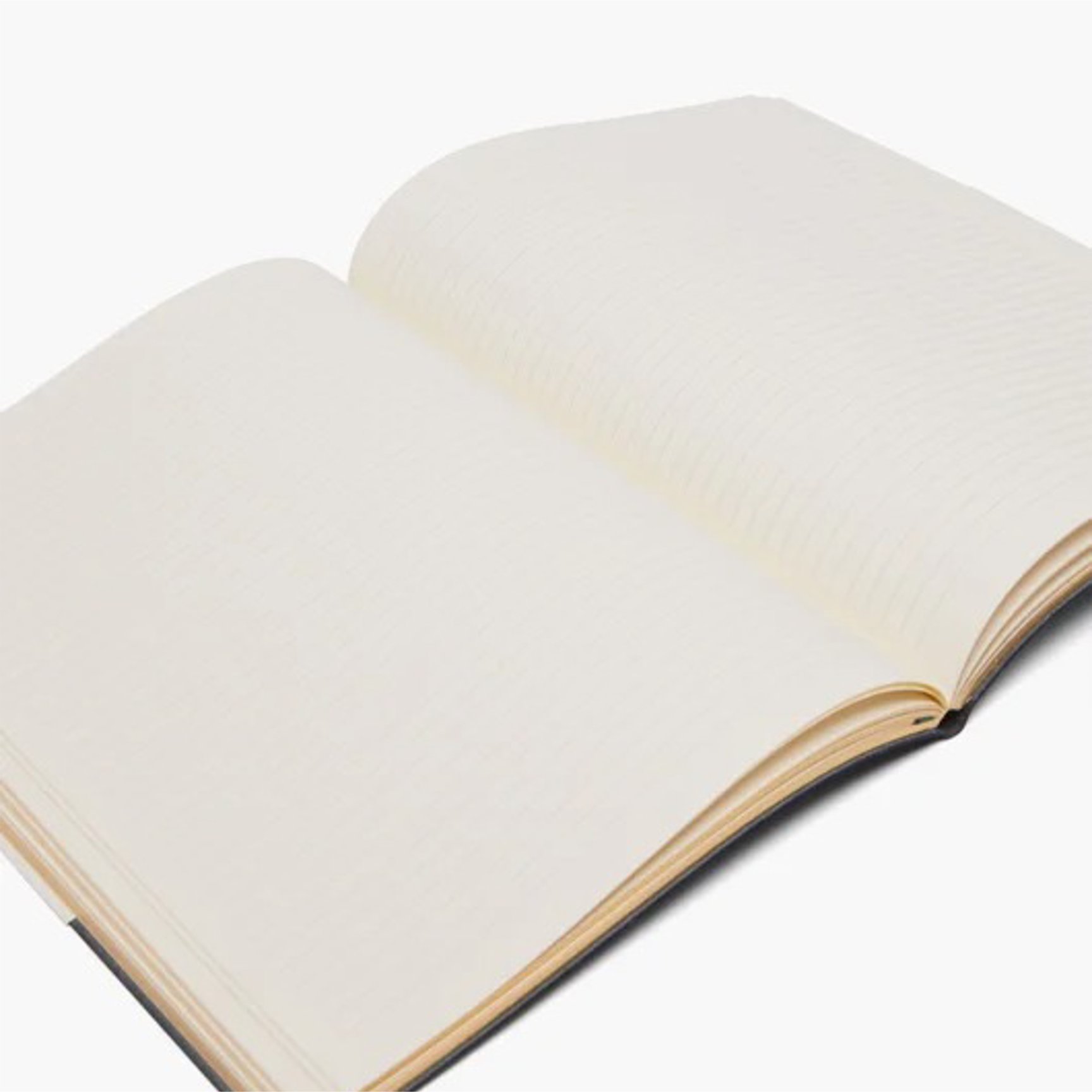 罫線入りの「ピナイダー(Pineider)」の"ミラノ"ノートは、シグネチャーの万年筆のために生まれた一冊。なめらかな書き心地を誇るアイボリーペーパーに、きっと魅了されるはず。ジェントルなブルーのサフィアーノレザーのカバーには、キズ防止加工が施されています。大きさは、約19.5 cm x 25.3 cm(サイズ感 B5)。
