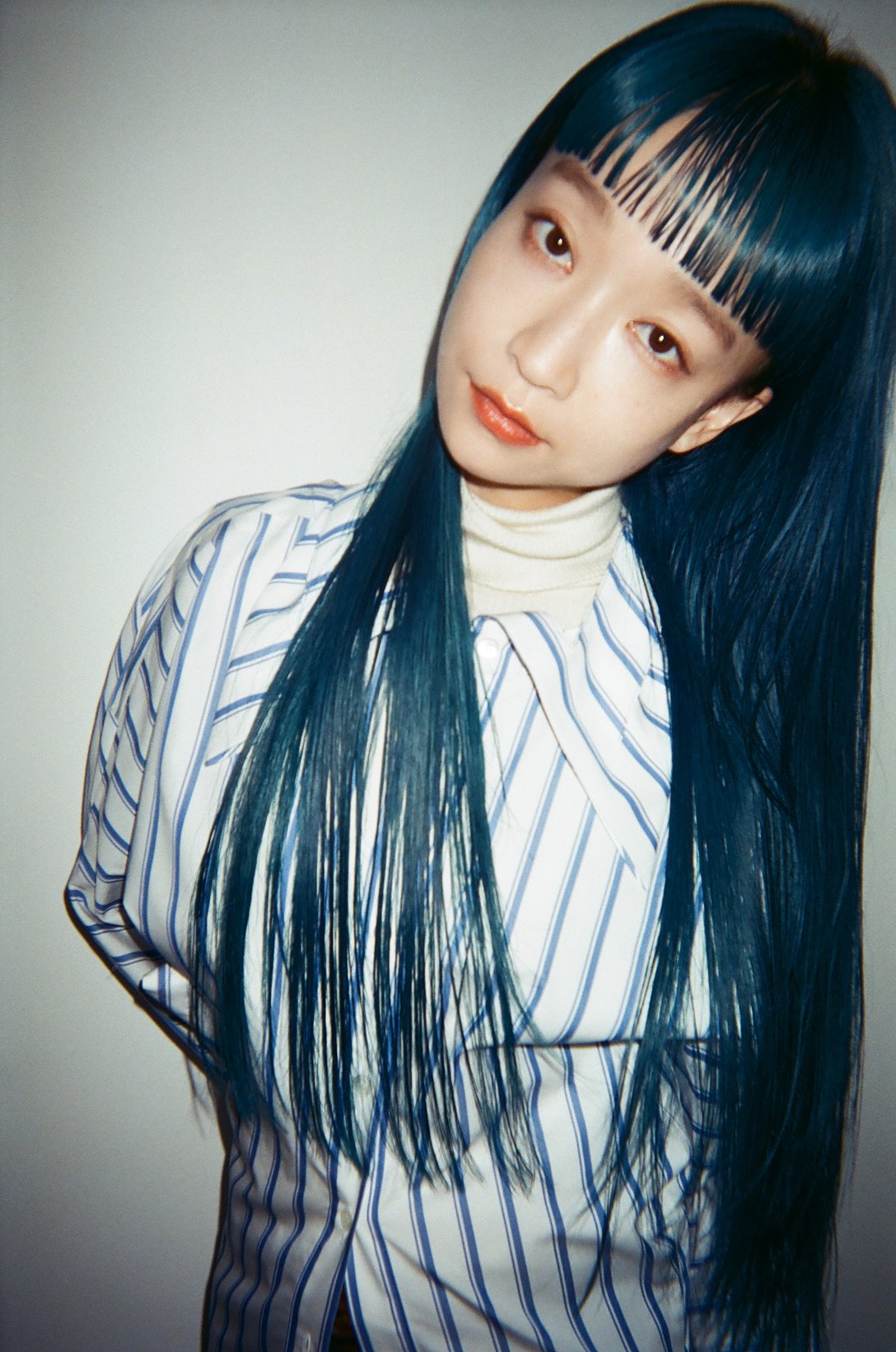 “一推しヘア”ハッとするような青髪のスーパーロングヘア。前髪の画一なラインと毛先のブラントな切り口がモードな一体感をもたらす。「作品でつくるデザインもサロンワークでつくるデザインも僕はあまり変わりません。なんならお客さまのほうが派手な場合があるくらい」(沢井)