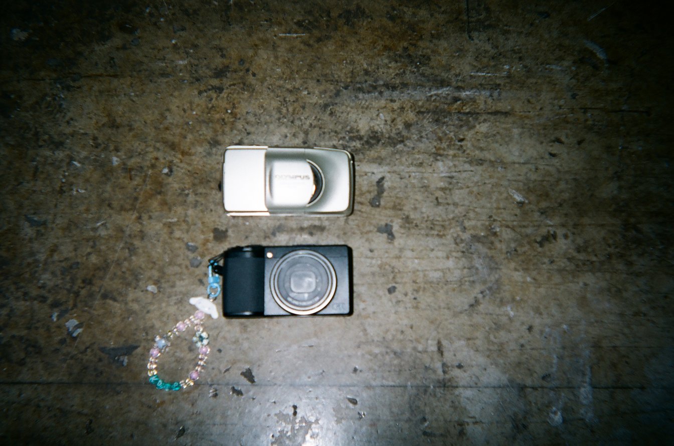 これは自前のデジカメとフィルムカメラです。フィルム写真が好きで、よく写真は撮っていたのですが、ヘアスタイルの写真を撮るときにふと、iPhoneは多くの人が「いい!」と思える色味やバランスで写真が撮れるなと気付いたことがあって。しっかり撮影をしたいと思っていたから、iPhoneで撮るだけでは美容師として作品撮りのスキルが上がらないかもと思い、RICOHのGRを購入しました。作品撮りやInstagramの写真もこのカメラで撮影しているんですよ。