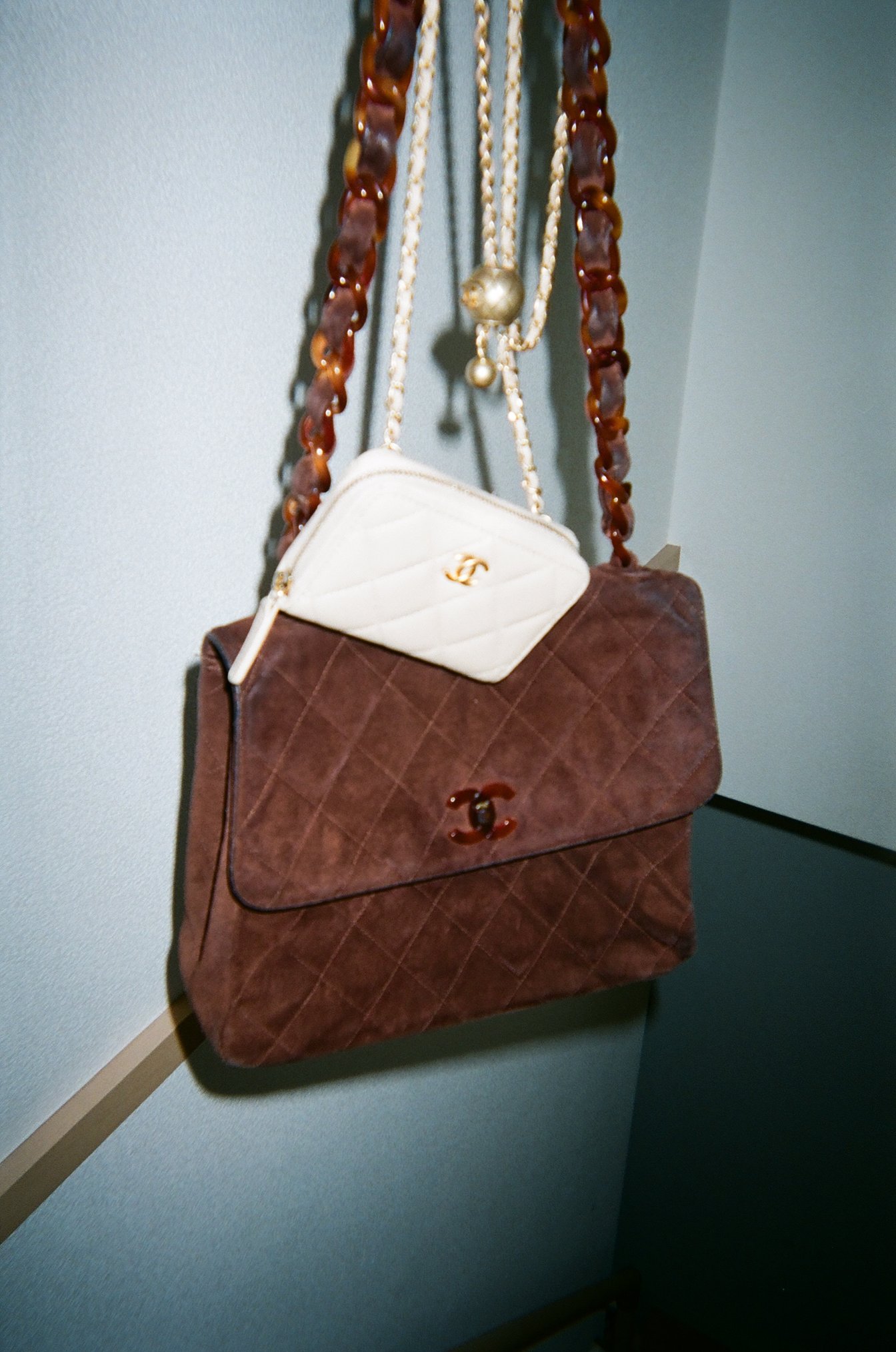 下のブラウンのバッグは20歳のときに「美容師、がんばるぞ!」とお金をかき集め、思い切って買ったシャネルです。とても思い入れがあります。ホワイトのバッグは1年前に購入したシャネルの財布です。