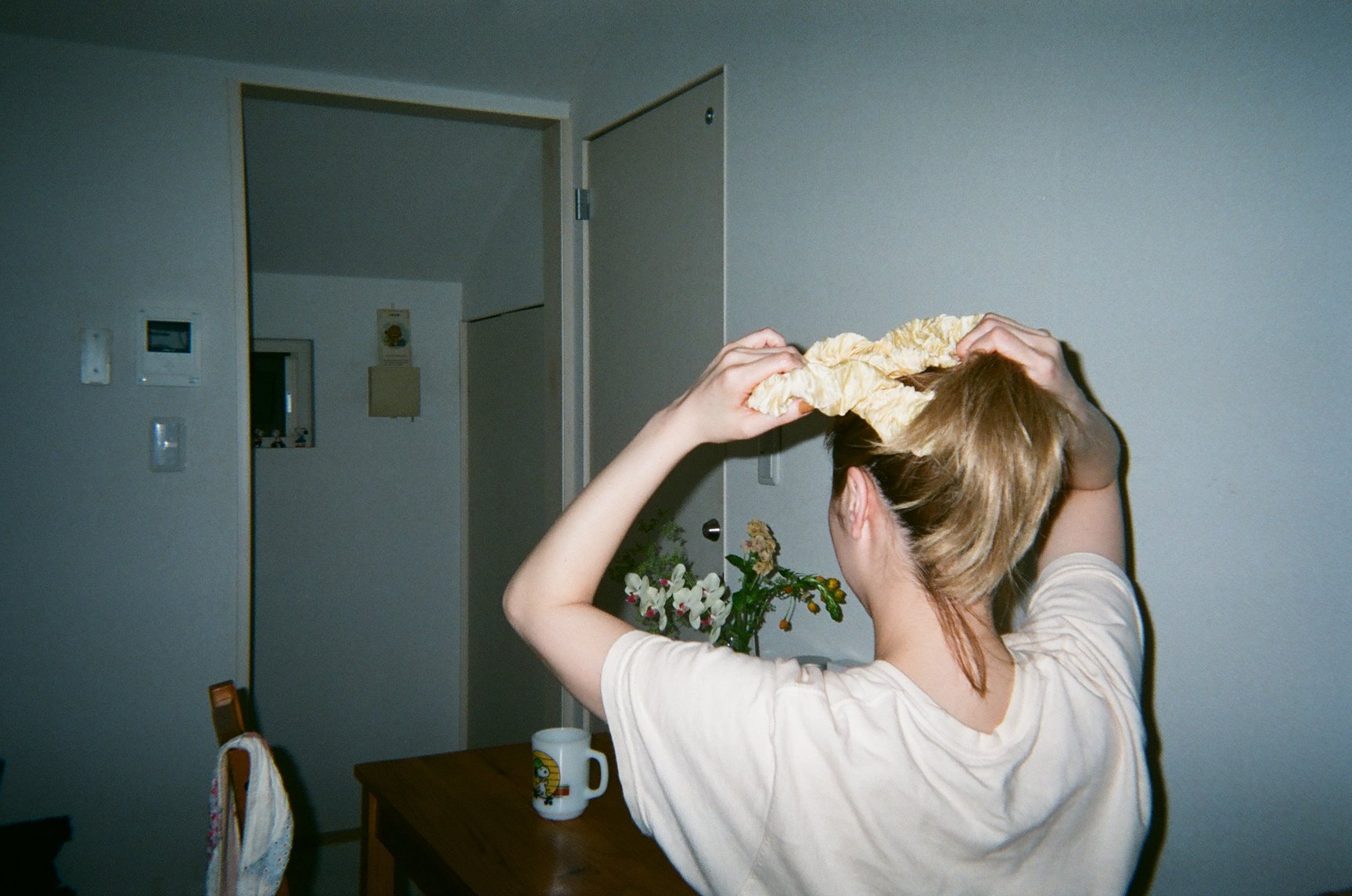 自宅で支度中のKOBUKIさん。この日は、大きめのシュシュでおだんごに