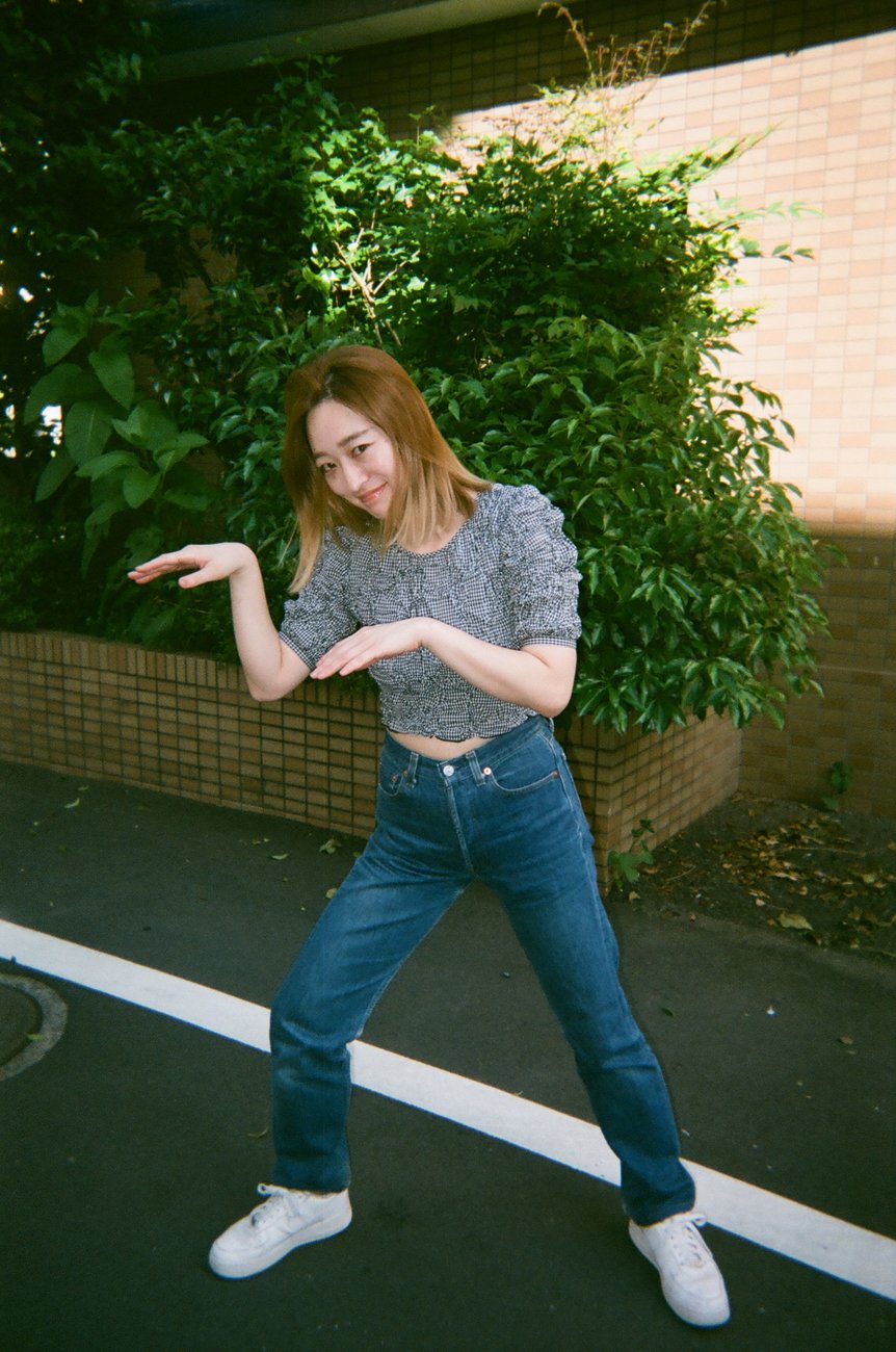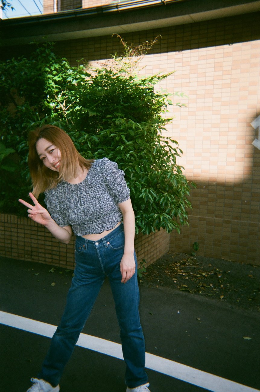 捨てちゃったりもしてるんですけど、今あるのは20本くらい。好きなのは好きでたくさん履いているし、履いていないものはあんまり履いてなかったりします。この写真の日は、デニムにギンガムチェックのトップスを合わせました。スタッフ写真を撮るついでだったので、ちょっとふざけていますね(笑)。ブランドだとやっぱり「リーバイス(Levi’s®)」が特に好きです。あとスタイルをよく見せてくれるのは、「シシクイ(THE SHISHIKUI)」かな。履くとみんなが褒めてくれるし、脚をきれいな形に見せてくれます。