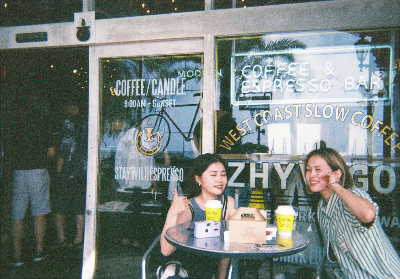 沖縄のカフェにて、銀座店の江口瑞穂さん(左)と木原さん。「同い年ですごく気が合うんですよ。仕事でもプライベートでも仲がいいです」