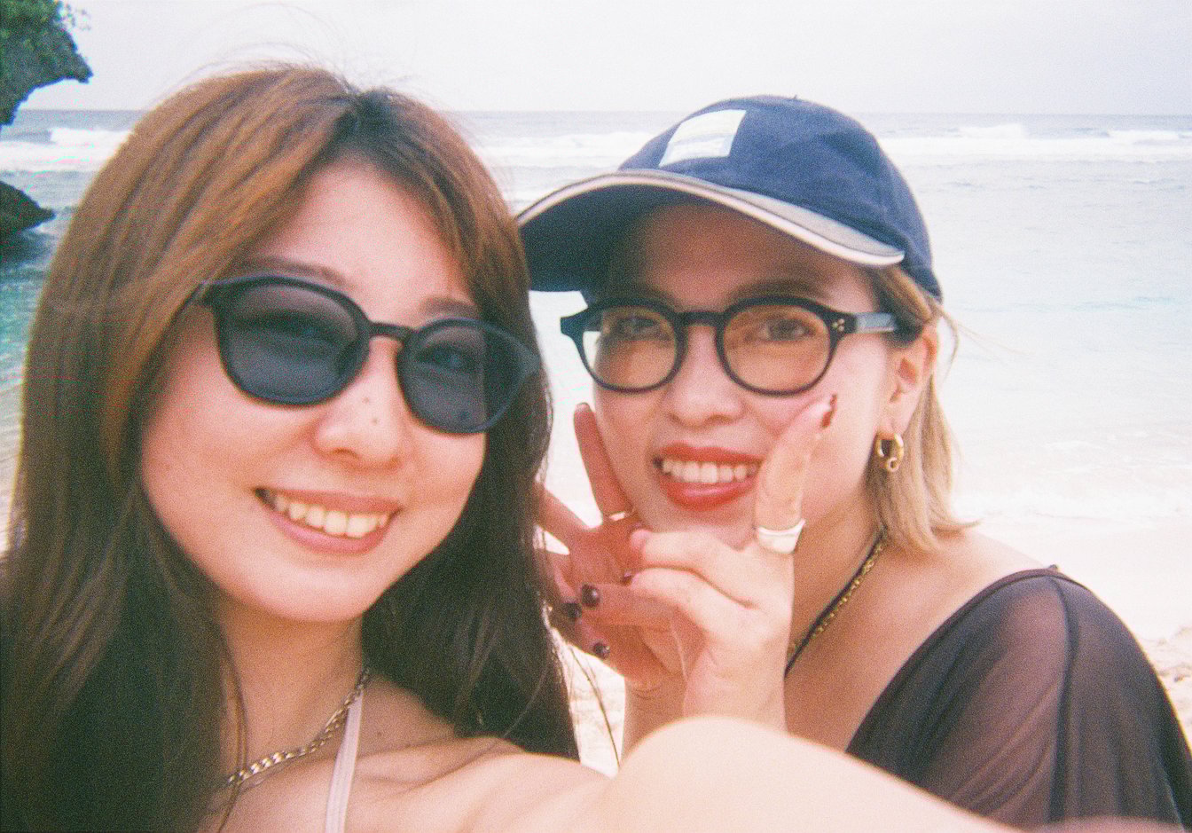 グアム旅行。一緒に行った、ヘアサロン「K-two」の宮久真子さん(左)とビーチでツーショット。「20代前半の、よく飲んでいた時期に出会った先輩なのですが、たまたま同席した飲み会で意気投合して、そこからずっと仲良くしてもらっています」