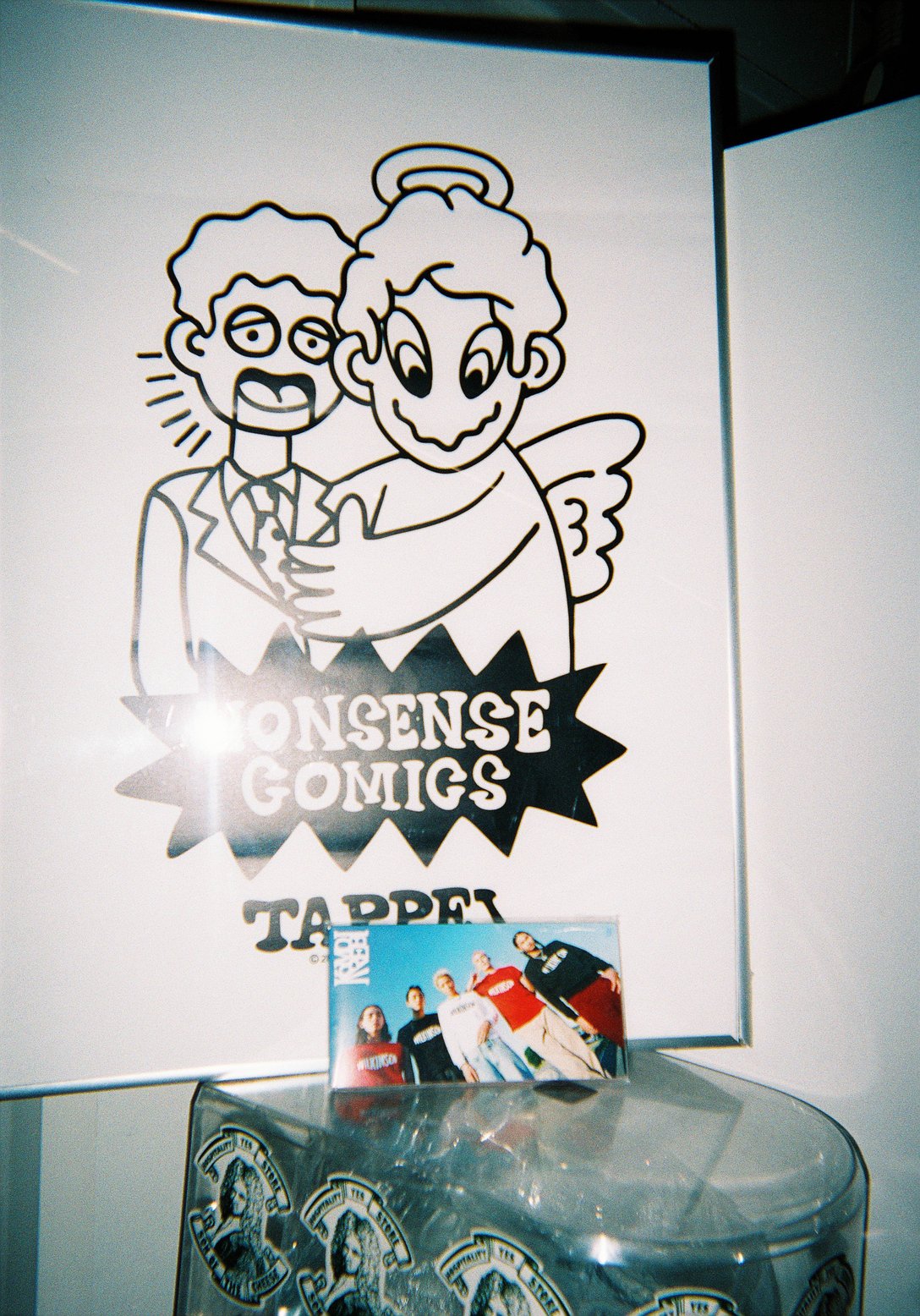 ネオンの看板はストリートコンセプトに沿ったもので、この雰囲気も気に入っています。アート作品の手前に写っている青の背景の写真は、今「ギリhappy」のフレーズで人気のアーティスト KOMOREBIさんのもので。実は、何年も前からNORAの撮影やコレクションにモデルとして出てくれているOTAくんがKOMOREBIのメンバー。「昔からモデルとして関わっている人が楽曲デビューするなんて、すごいね!」とみんなで話しているんですよ。これも縁ですよね。
