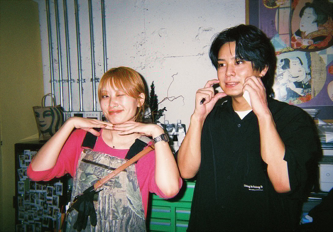 2人で写っているの写真は今一緒に働いている渋谷店のスタッフです。左が渋谷店のアシスタント3年目のIKEDA MAYAちゃん。すごく明るい性格でラブ&ピースという言葉がよく似合うタイプです。右が今年入社した中村龍志くんで、10月から渋谷店の本配属になりました。彼、夏休みにやることがないからって休みなのにお店に来て、毛束を使ってカラー剤の実験をしていたんです(笑)。マニアックというか、“変態”というか、これからが楽しみな後輩です。