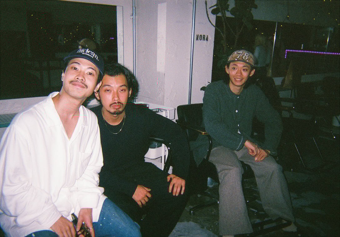 3人で写っている写真は9月末に退社した先輩の送別会で、渋谷店でパーティーをしていたときのものです。いろんな店舗からたくさんの人が見送りに来てくれたんですよ。白い服を着ているのは、NORA JourneyとNORA CYNDYを兼務している増井歩夢。真ん中は、NORA吉祥寺店の佐藤リョウです。増井と佐藤は、NORAにとってのキャラクター的存在で、自然と人に好かれるようなムードーメーカーですね。奥にいるのは、NORA本店にいる石川元です。とても尊敬する先輩のひとりですね。