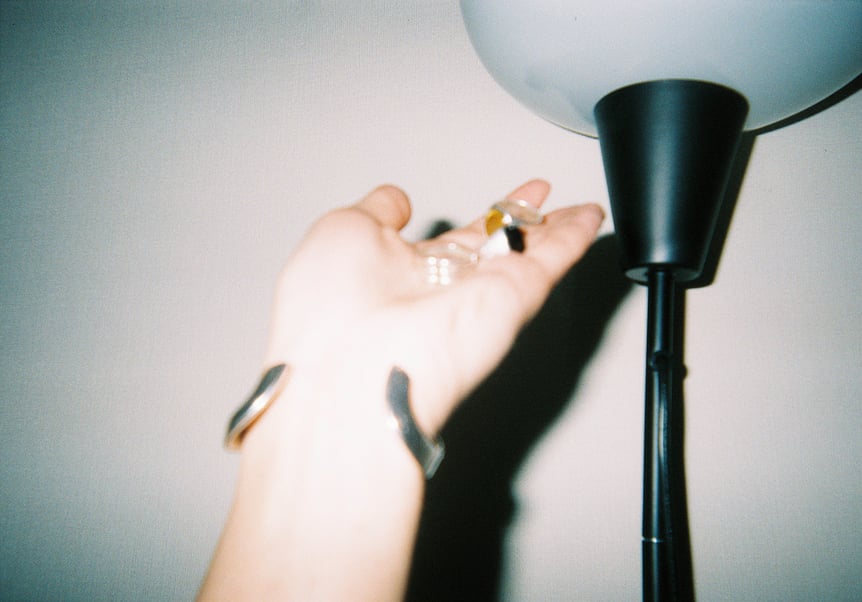 アクセサリーも好きなのですが、金属アレルギーで肌荒れしてしまうので、身につけるものはアレルギー対応のものを選ぶようにしています。左の写真に写っているのは、「トムウッド(Tom Wood)」のものと、母からもらったリングです。トムウッド、好きなんです。とても肌になじみやすいというか、ストレスがまったくなく、つけているのを忘れてしまうくらい快適で。あと、ストーン一つひとつに意味があったり、つける場所でも意味が変わってきたり、そういうのもおしゃれだなと思って楽しんでいます。