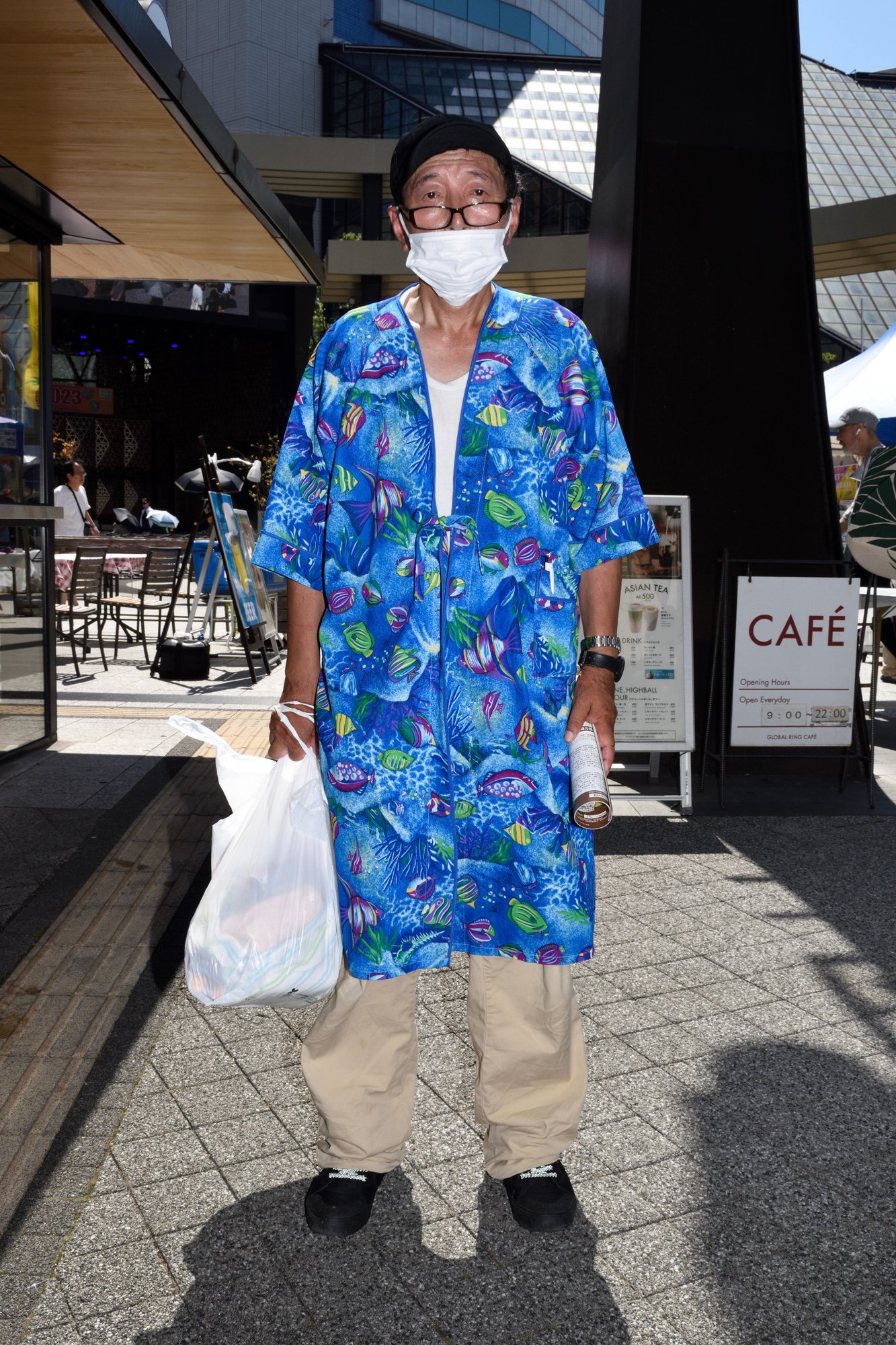 と、懐かしい思ひでに浸り、灼熱の炎天下、意識も朦朧としてきたところで、妙な服装のおじいさんを発見した。そのおじいさんは、ハワイでも見たことがないような、ガウンのように丈の長いアロハ柄のシャツを着ている。真っ青な色合いが、まるで灼熱の池袋に現れたオアシスのようだ。さながら水を発見したサハラの遭難者のように駆け足でおじいさんに近寄る。