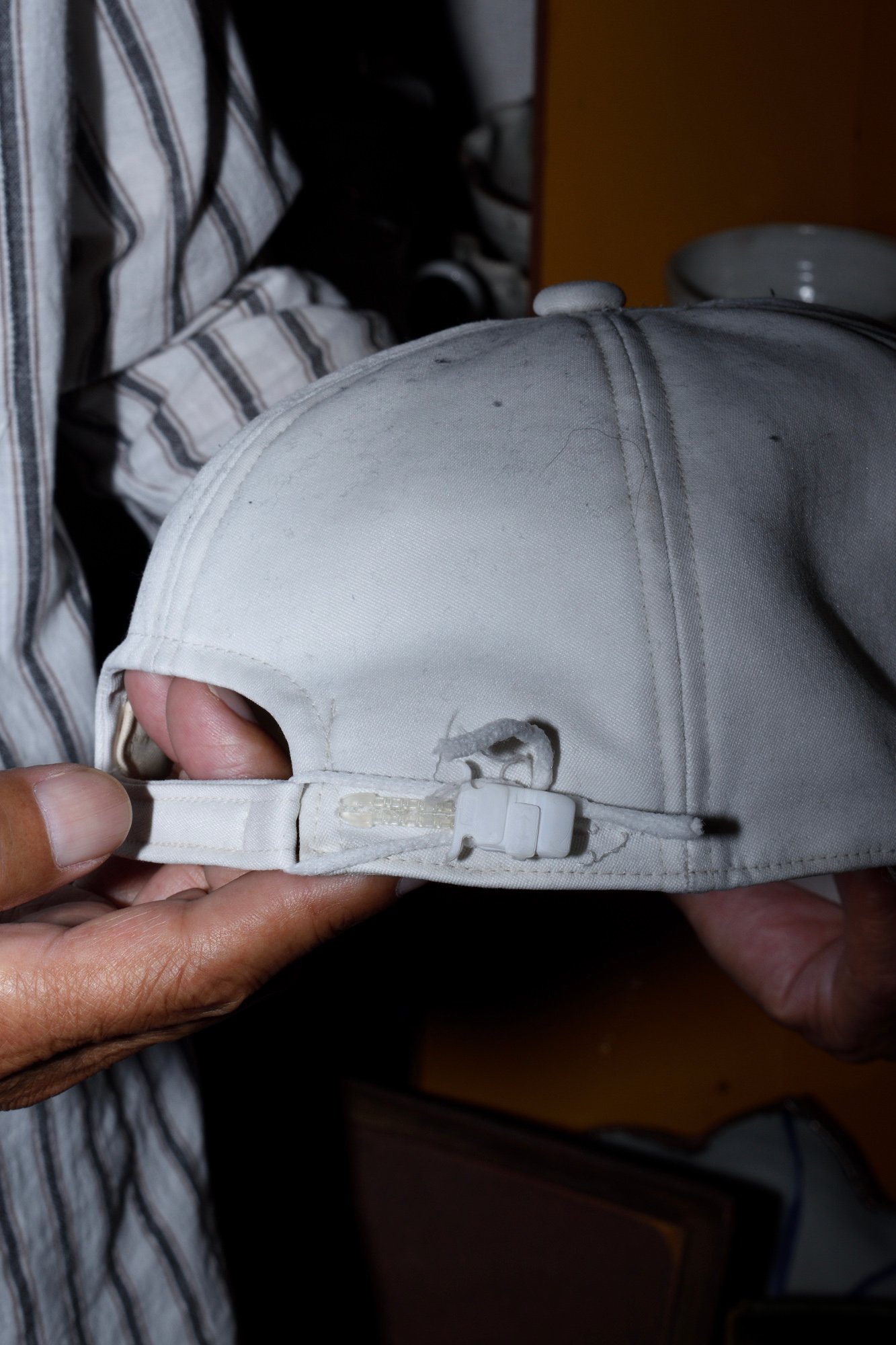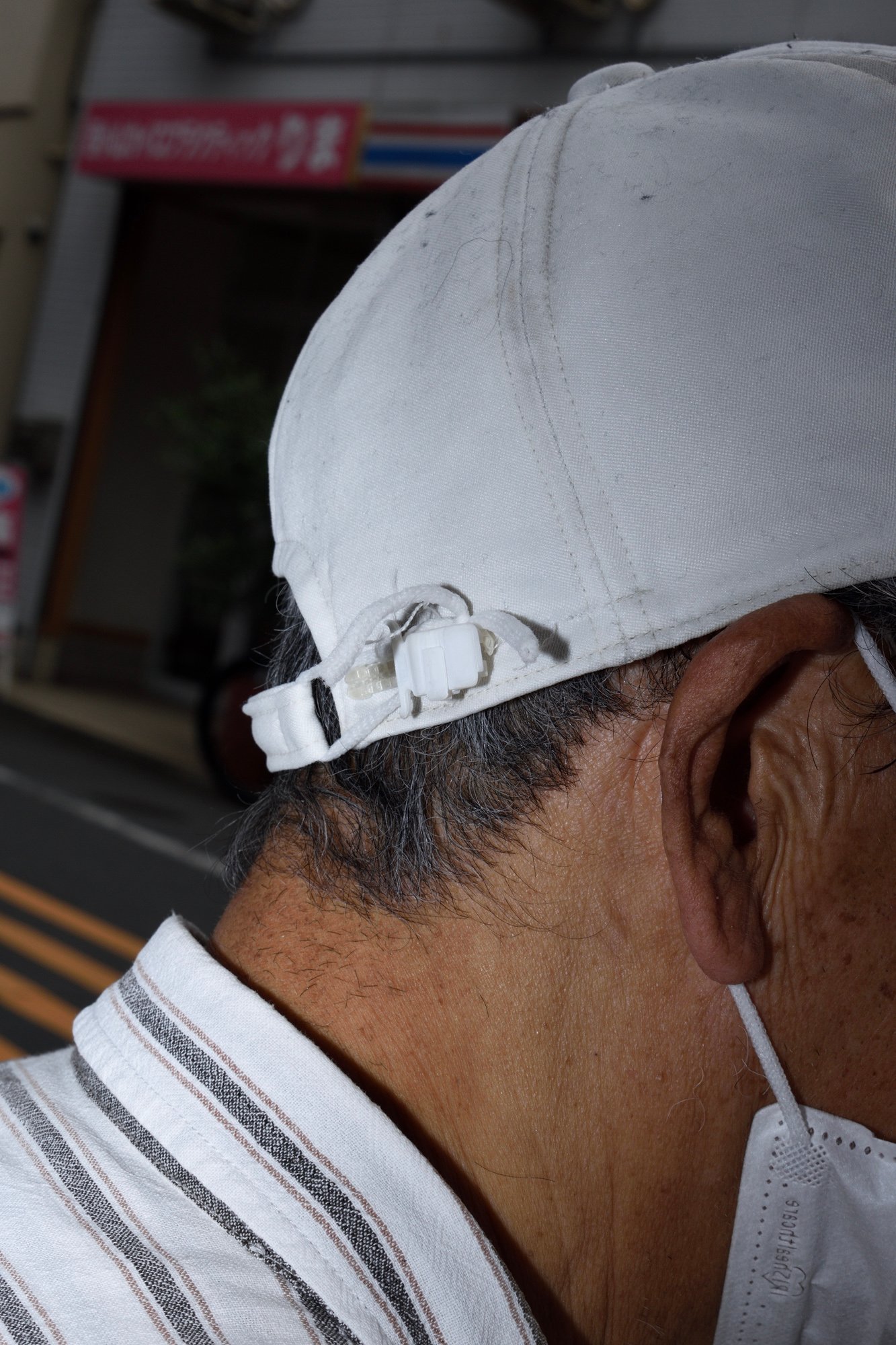 ええやん、めっちゃええやん。装いと愛着の狭間に揺れるユーモア。素敵やん。さらにこのキャップ、後ろにサイズ調整のプラスチック製アジャスターが付いているのだが、17年間酷使したためかパーツが欠損してしまっている。このままではブカブカで被れないのだが、おじいさんはなんと、紐を無理くり括り付けることで壊れたアジャスターをアジャストしたのだった。ダメージ加工や見せかけのリペアなんて糞食らえと言わんばかりのリアル生活。画面の向こうのそこの君、キミのダチにも言っといてよ、真のヒップホッパーは西小山にいるって。