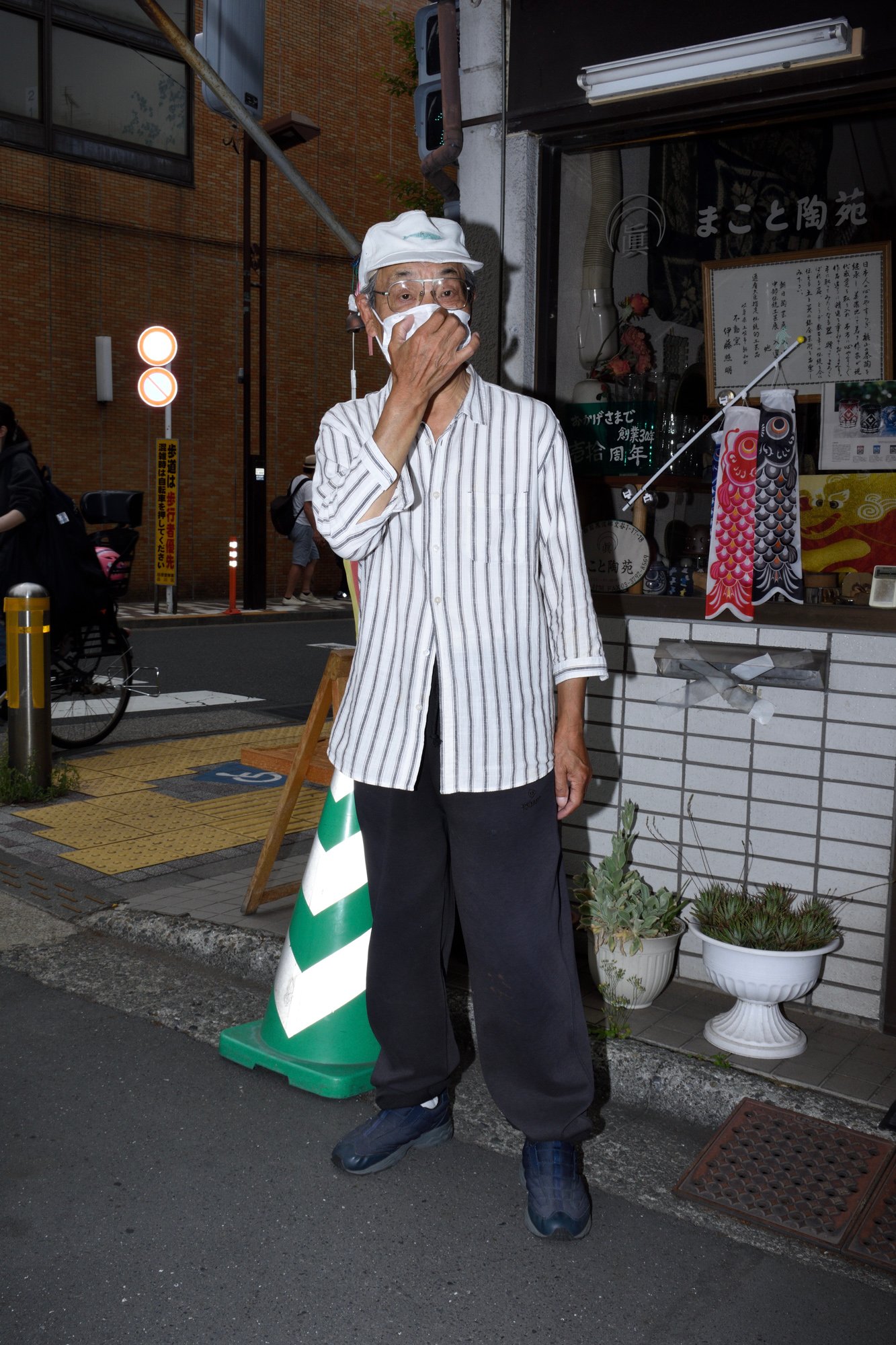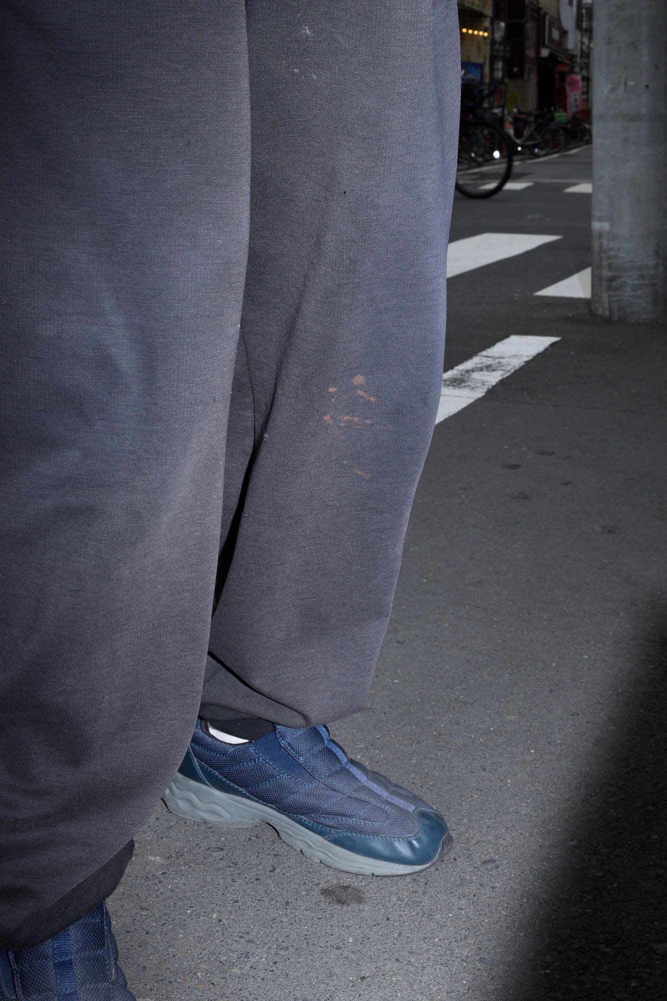 なるほど。確かに一理ある。商い歴40年の日本一リアルな意見である。ちなみにスーツでバシッと挑んだ百貨店時代は、多い時で月商500万円の売り上げがあったとのことだ。昔はお祝いの返礼品として陶器が山ほど売れたらしいが、現在はそのような需要はほぼゼロらしい。今のおじいさんは、酸いも甘いも噛み分けた、道理のリラックススタイルというわけだ。それにしても、シャツの上下ボタン2連開け、袖のボタンも開けっぱなし。とっつぁん、ハワイアンだってアロハのボタンは留めるぜぃ?曇天の西小山にその着こなしは、ちと眩し過ぎるんじゃねいかぃ?しかしながら、このワイハーすぎるシャツも、シックなダンロップ製のスウェットパンツを合わせることで、全体のスタイリングとしては引き締まって見える。スウェットパンツから紐なしスニーカーへと連なる流線形のフォルムは、Yeことカニエ・ウェストのアパレルブランド「イージー(YEEZY)」を彷彿とさせる。ちなみにシャツもズボンももう10年くらい着ているらしい。スウェットパンツには、ところどころ汚れが見受けられる。