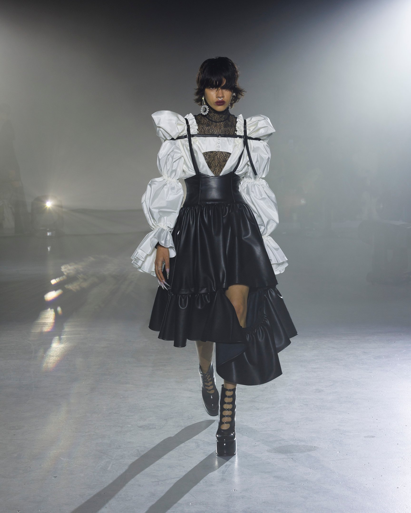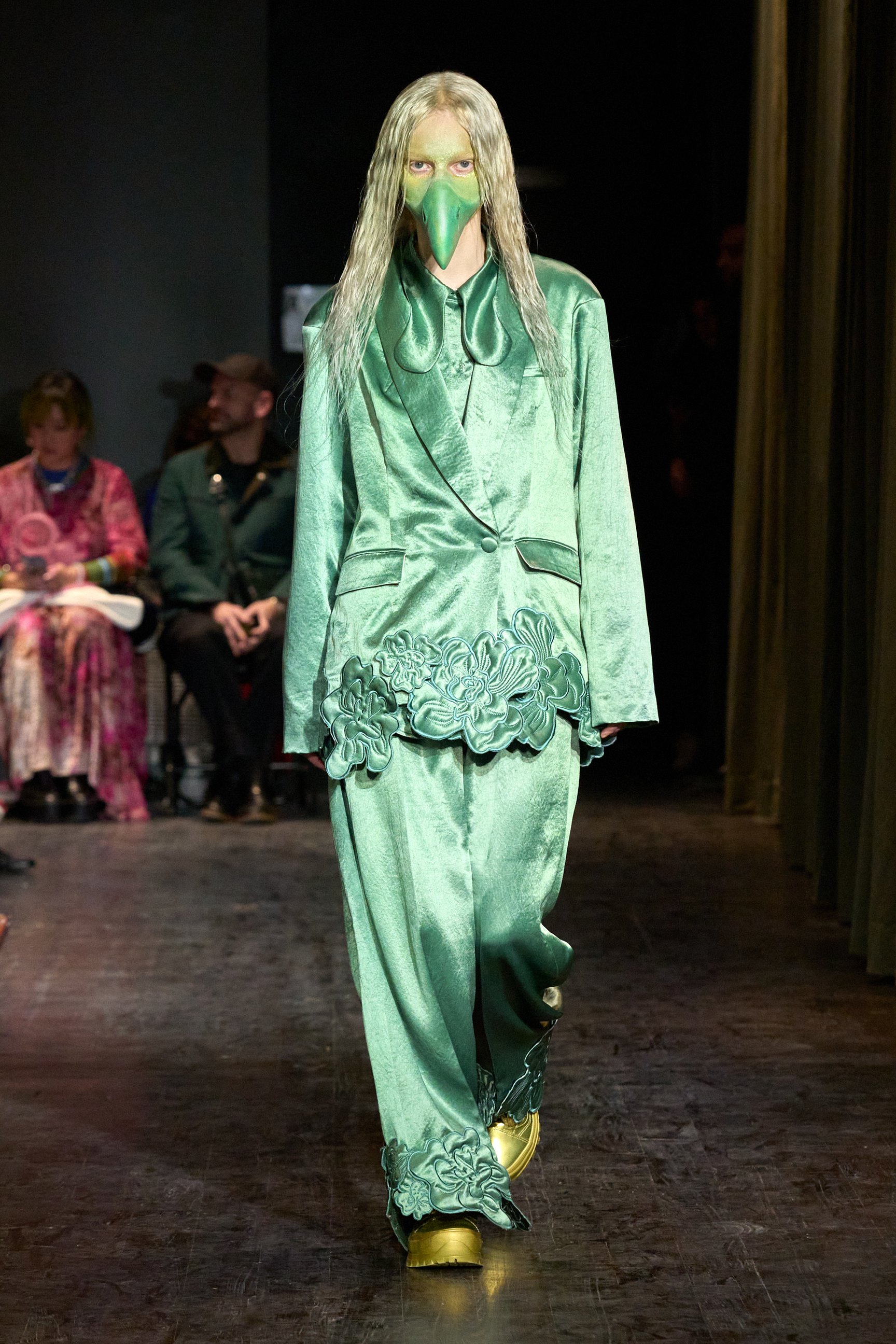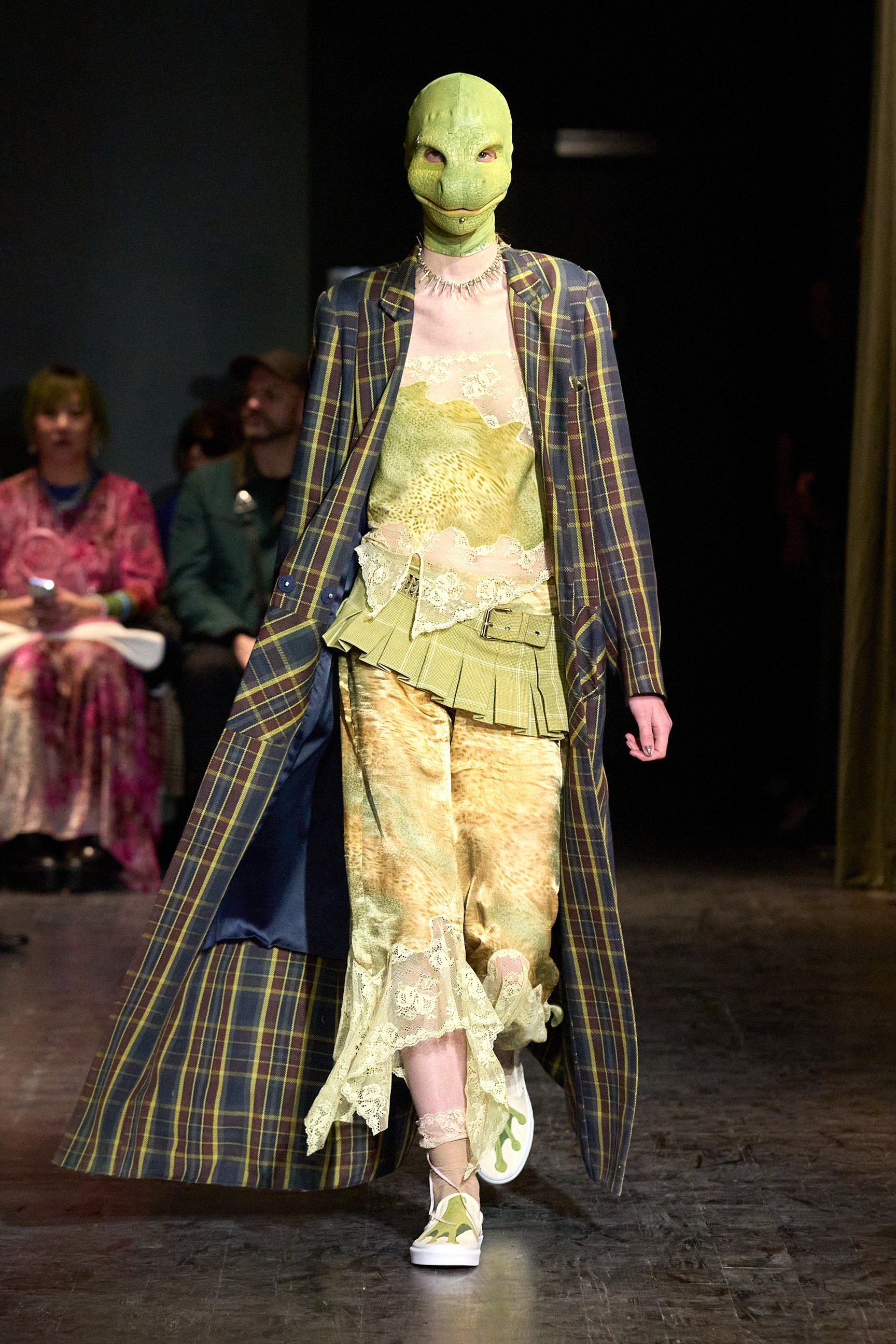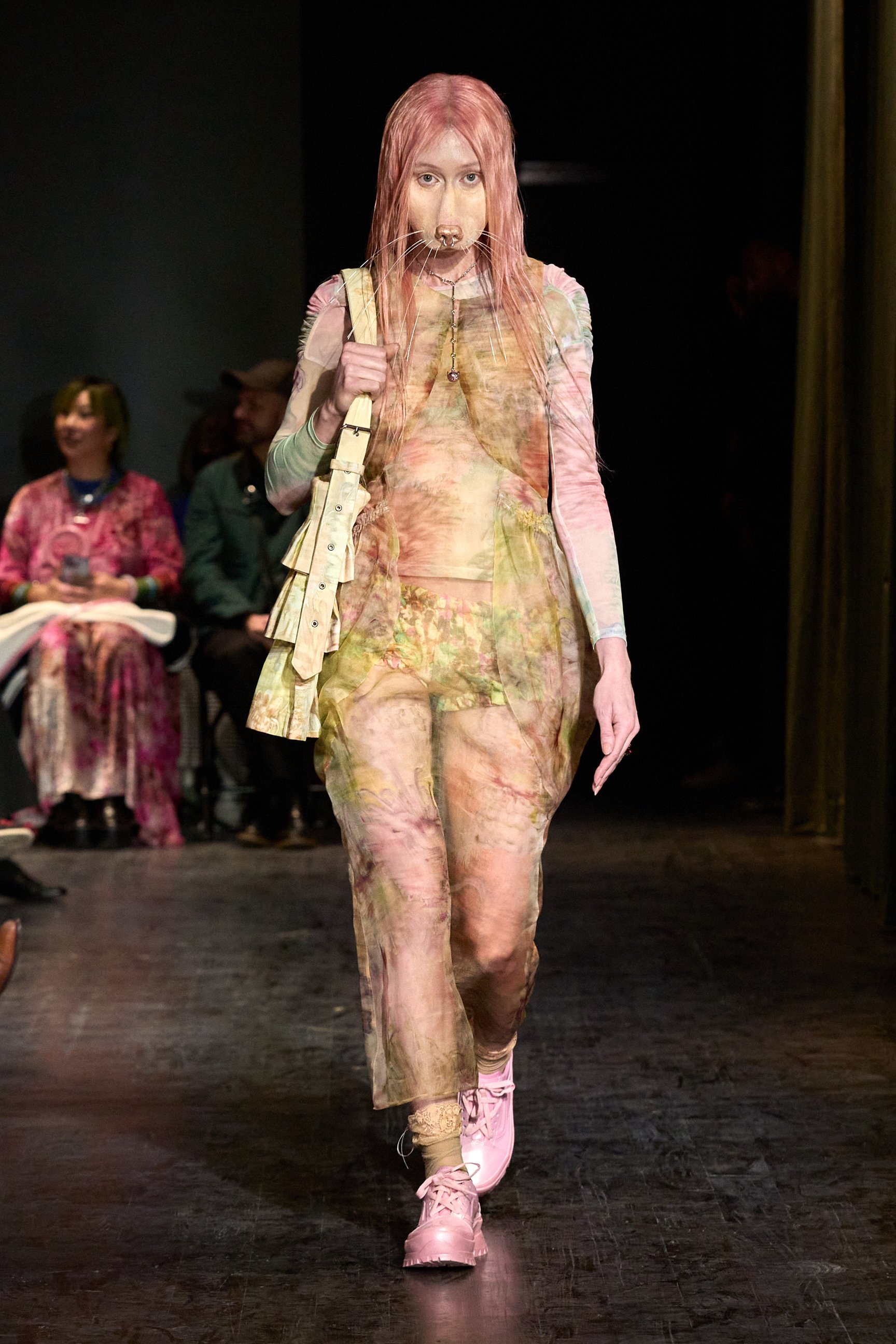 動物の毛並みをプリントで再現したルックなどは、動物由来の素材を極力使わず、エシカルコンシャスな服作りを心がけているブランドらしいアプローチ。デザイナー自身の愛犬もモデルとなり、ランウェイに登場した。ラストルックを飾ったのは、ドラマ「13の理由」でブレイクしたトランスジェンダー俳優のトミー・ドーフマン(Tommy Dorfman)。エルフのような耳と白のストラップドレスで、手にはウサギを模ったクラッチが握られていた。