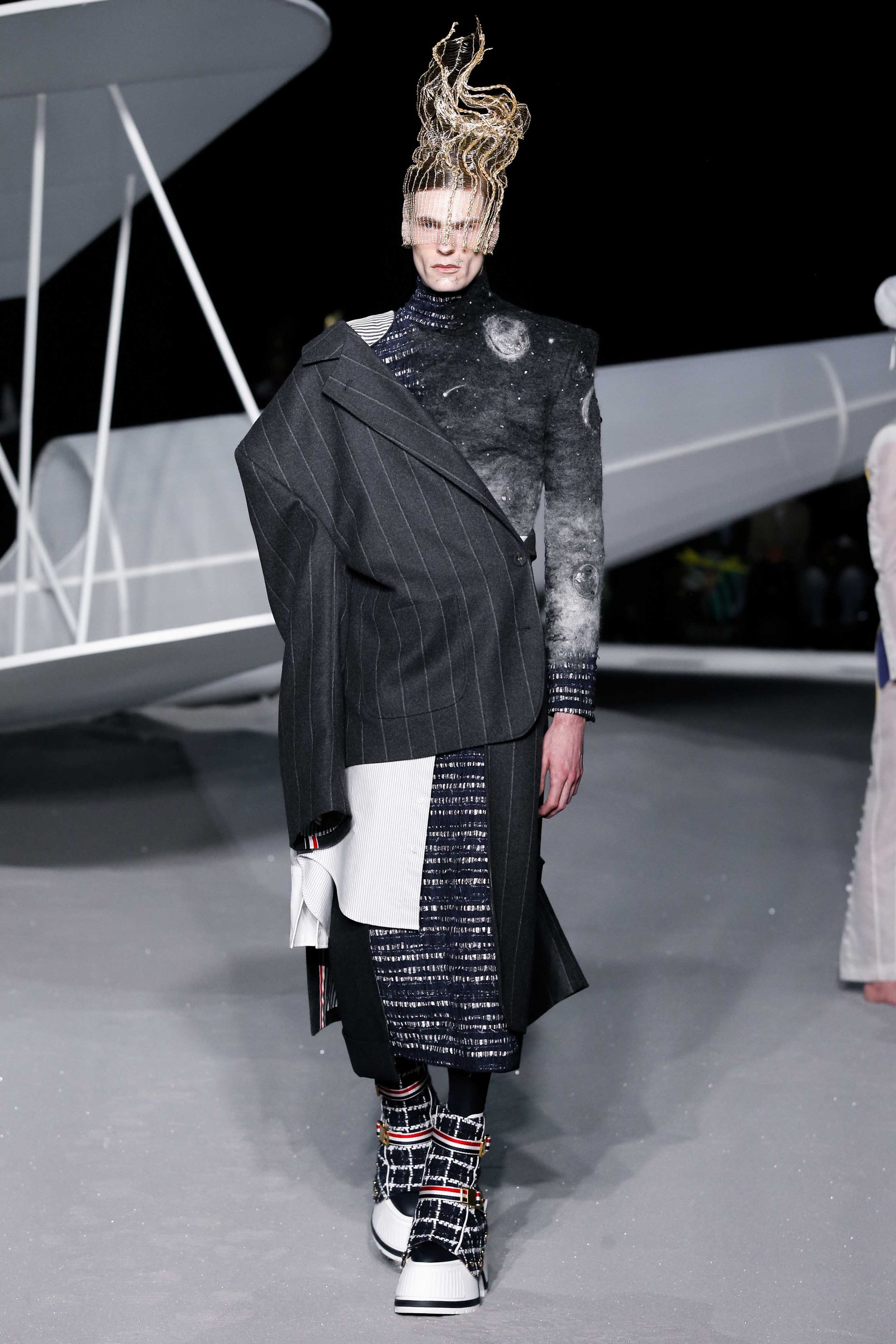 先シーズンは、シンデレラのオペラ戯曲「サンドリヨン」から着想を得た「トム ブラウン」が、今シーズンはサン=テグジュペリの「星の王子さま」をテーマに選んだ。円形の会場には、不時着した白い飛行機のセットが置かれ、天井からは星々のオブジェが吊るされている。足元には、物語の舞台であるサハラ砂漠を思わせる白い砂が敷かれていた。