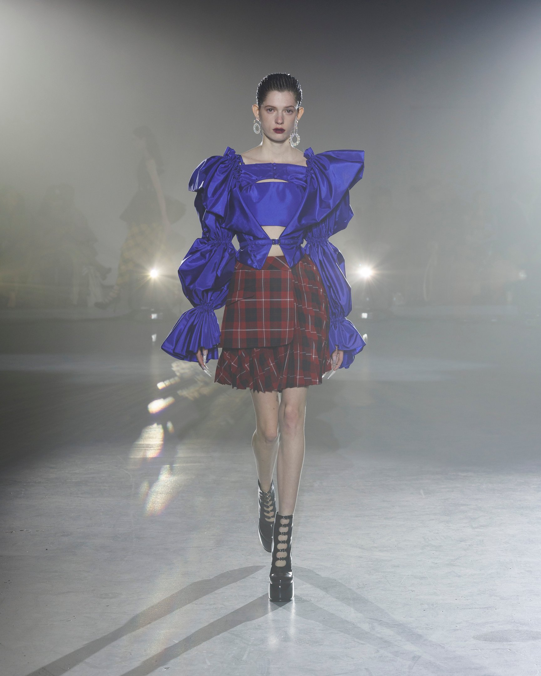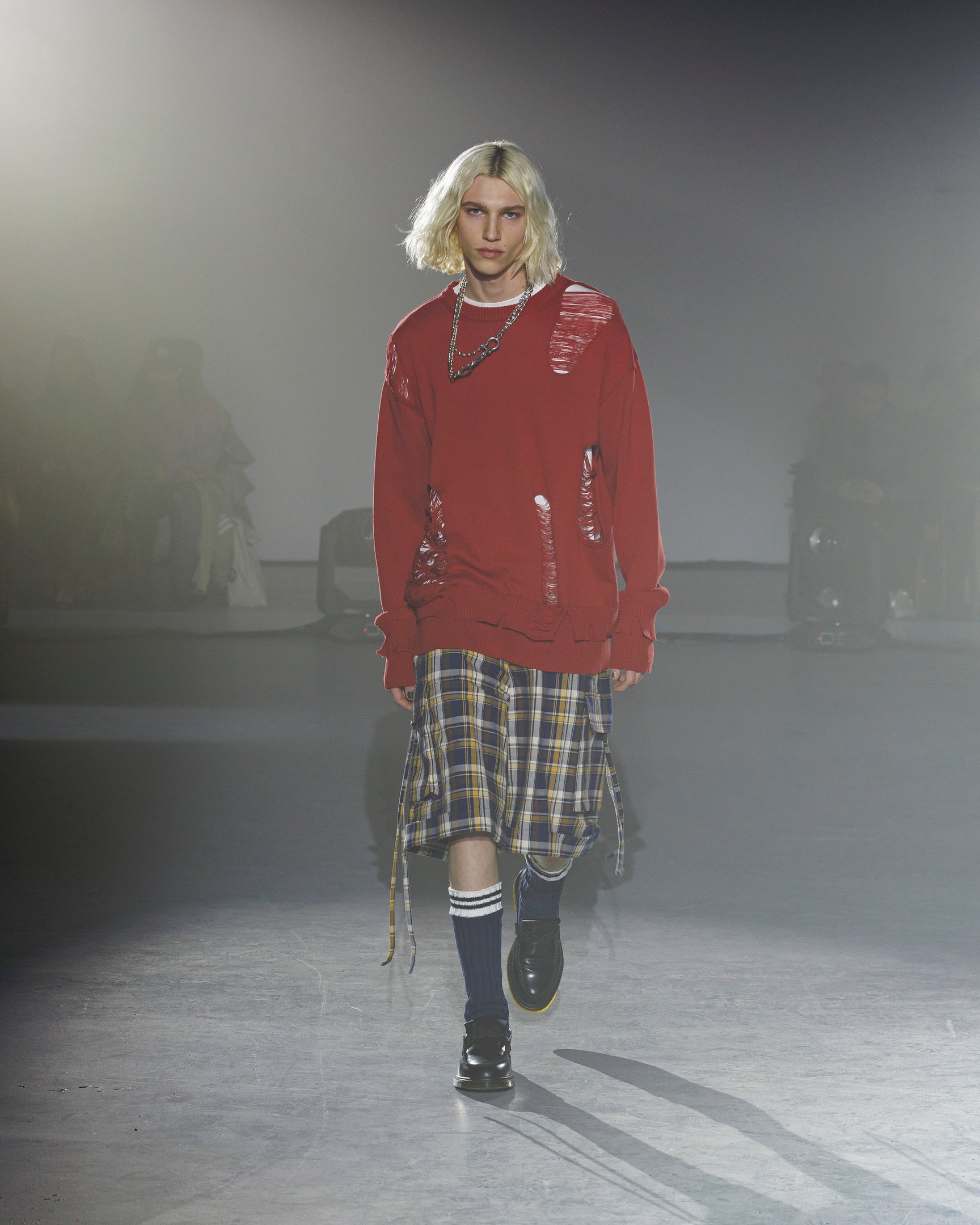 前田華子が手掛ける「アディアム」は、2023年秋冬ウィメンズコレクションとジェンダーニュートラルコレクション「アディアム イチ(ADEAM ICHI)」を発表。2021年にローンチされた「アディアム イチ」は今回が初のランウェイショーとなった。インスピレーション源となったのは、パンクロックやグランジ。「ドクターマーチン(Dr.Martens)」のブーツやチェック柄のボトムス、チェーン使いなどを取り入れ、エッジィなアクセントを効かせていた。