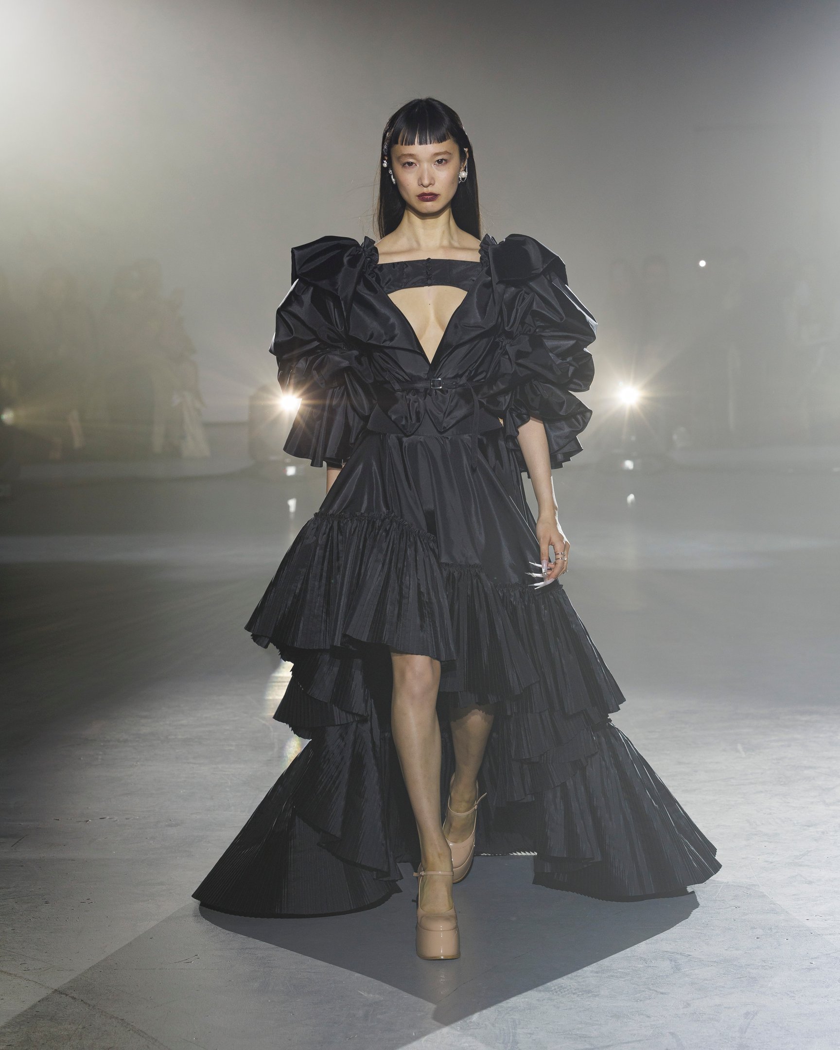「クリスチャン・シリアーノ」はカマラ・ハリス(Kamala Harris)米副大統領も愛用するブランド。今シーズンは「オードリー・ヘップバーン(Audrey Hepburn)の真夜中のバラ園」がテーマに。ランウェイは色とりどりのバラで装飾され、ドレスはモノトーンから華やかなジュエルトーンで彩られていった。