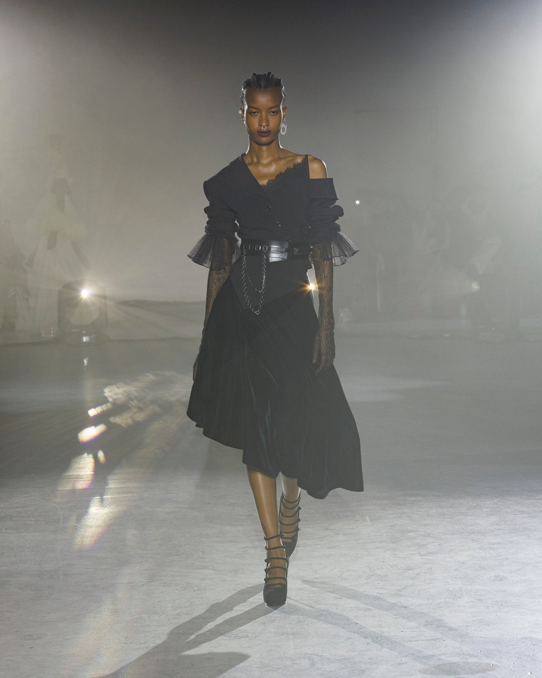 ローラ・マレヴィ(Laura Mulleavy)とケイト・マレヴィ(Kate Mulleavy)の姉妹デザイナーが手掛ける「ロダルテ」は、まるで童話のような世界観。会場に設置されたディナーテーブルや椅子はすべてメタリックに彩られ、薄暗い空間の中、燭台の火がゆらゆらと揺れている。ショー前半、モデルたちは魔女マレフィセントを思わせるようなゴシック風メイクで、黒一色のロングドレスで登場。また、花々のモチーフやリボン、レースといったロマンチックな要素がドレスを装飾した。