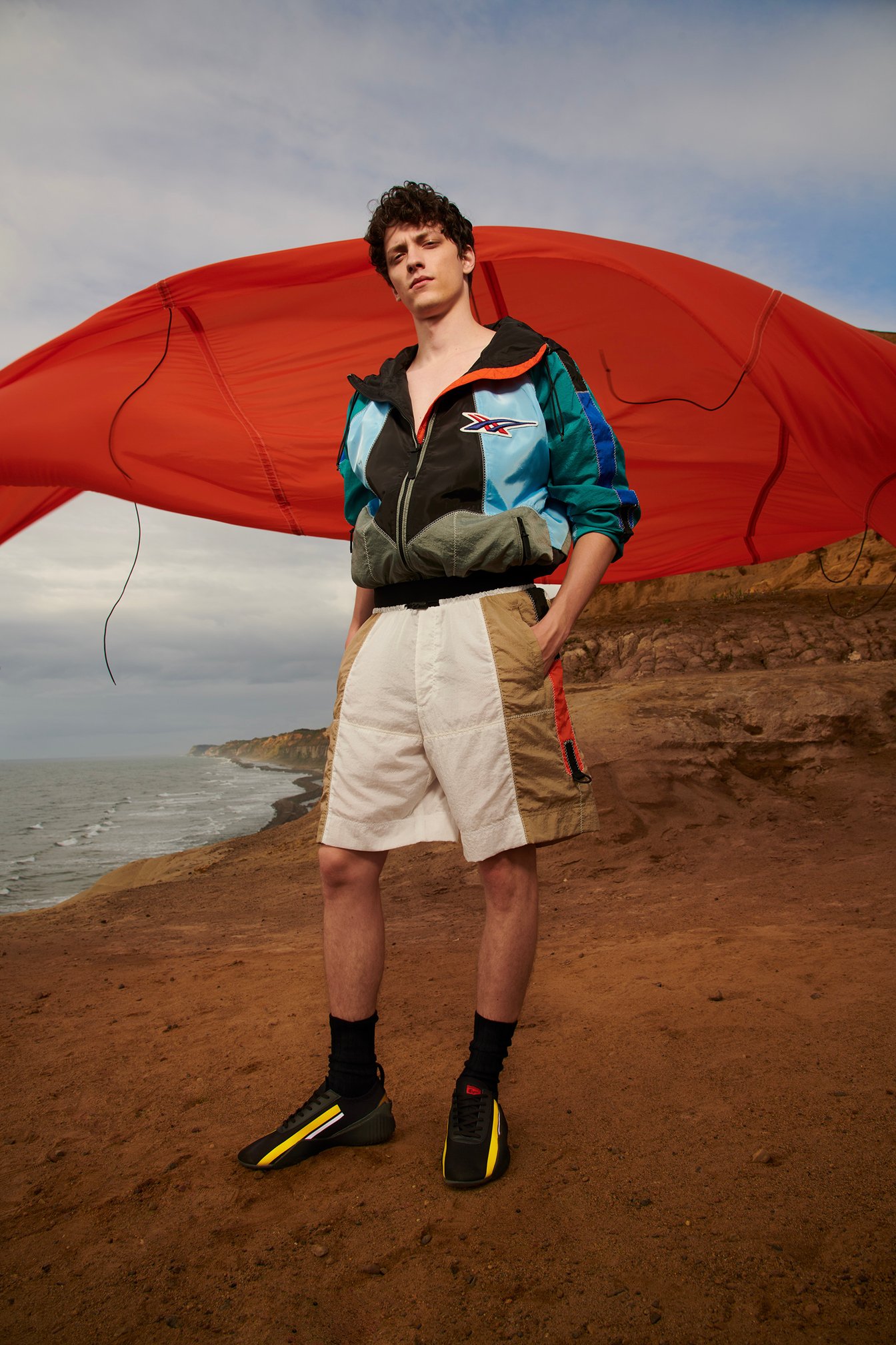 洗いっぱなしのようなワッシャー加工を施したナイロン素材を使用した「ブルゾンジャケット」。様々なカラーリングのパネルをジグザグステッチで繋ぎ合わせたデザインは、帆を彷彿とさせます。背面にはベンチレーションがデザインされており、通気性◎。ワッシャー加工やジグザグステッチのディテールは、ブルゾンジャケットのほか、ドレスやジップアップフーディーなど様々なアイテムに取り入れられています。