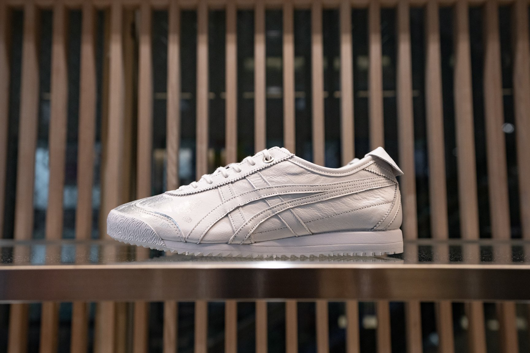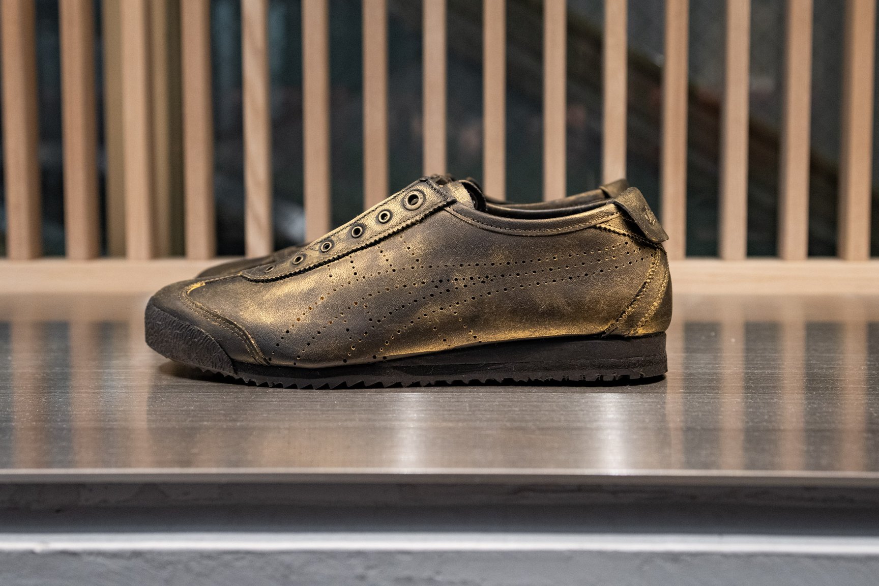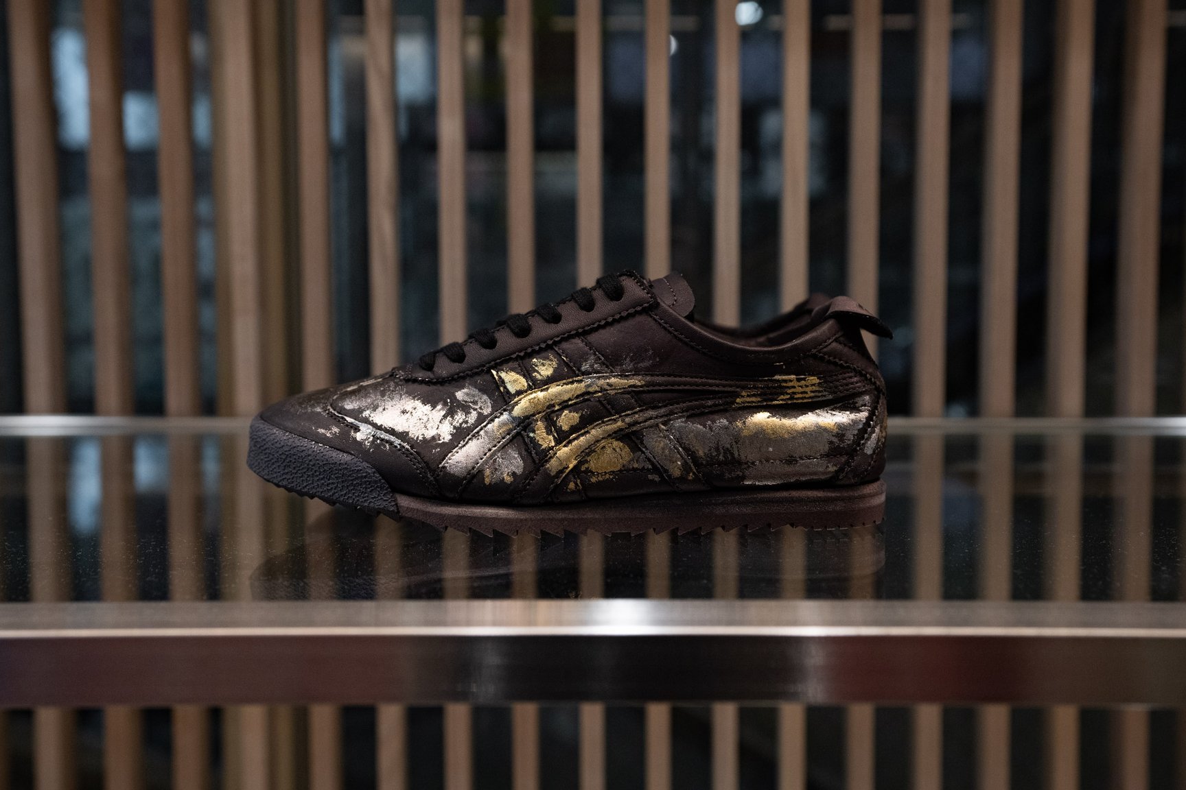 「オニツカタイガー 京都」でしか手に入らない5足の限定アイテムにも注目。上質な素材を使用したアッパーに、職人が手作業で染色と箔転写加工を施したデザインや、漆塗りの伝統技術から着想を得た漆風(うるしふう)加工を施したデザイン、つま先とかかと部分にエナメル加工を施したデザインなど、「MEXICO 66」をベースモデルにした唯一無二のスペシャルな仕様に。いずれも軽量かつ優れたクッション性を持ち、スマートな佇まいと快適な履き心地を実現した一足です。限定アイテムを履いて京都の街歩きを愉しむのも一興。