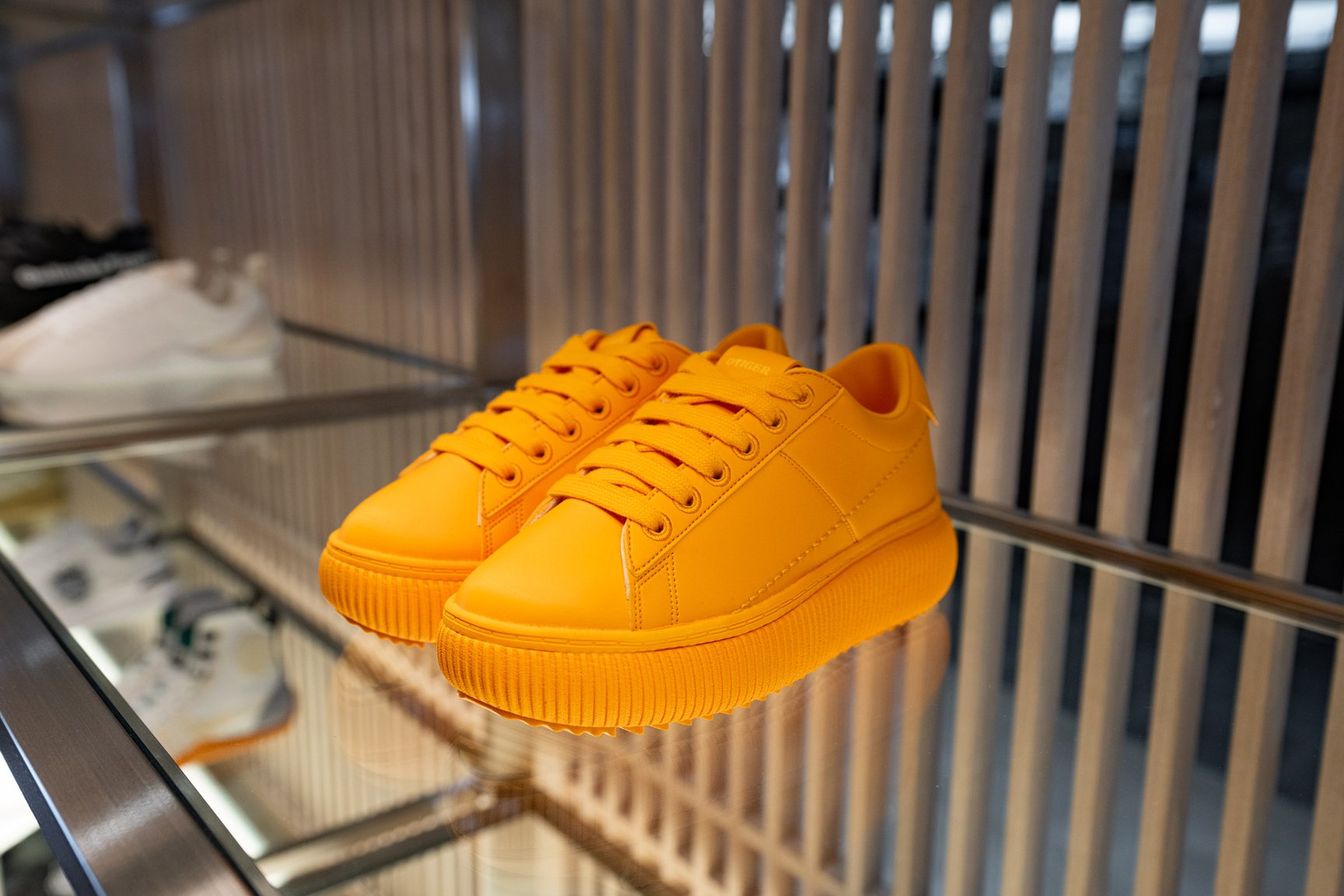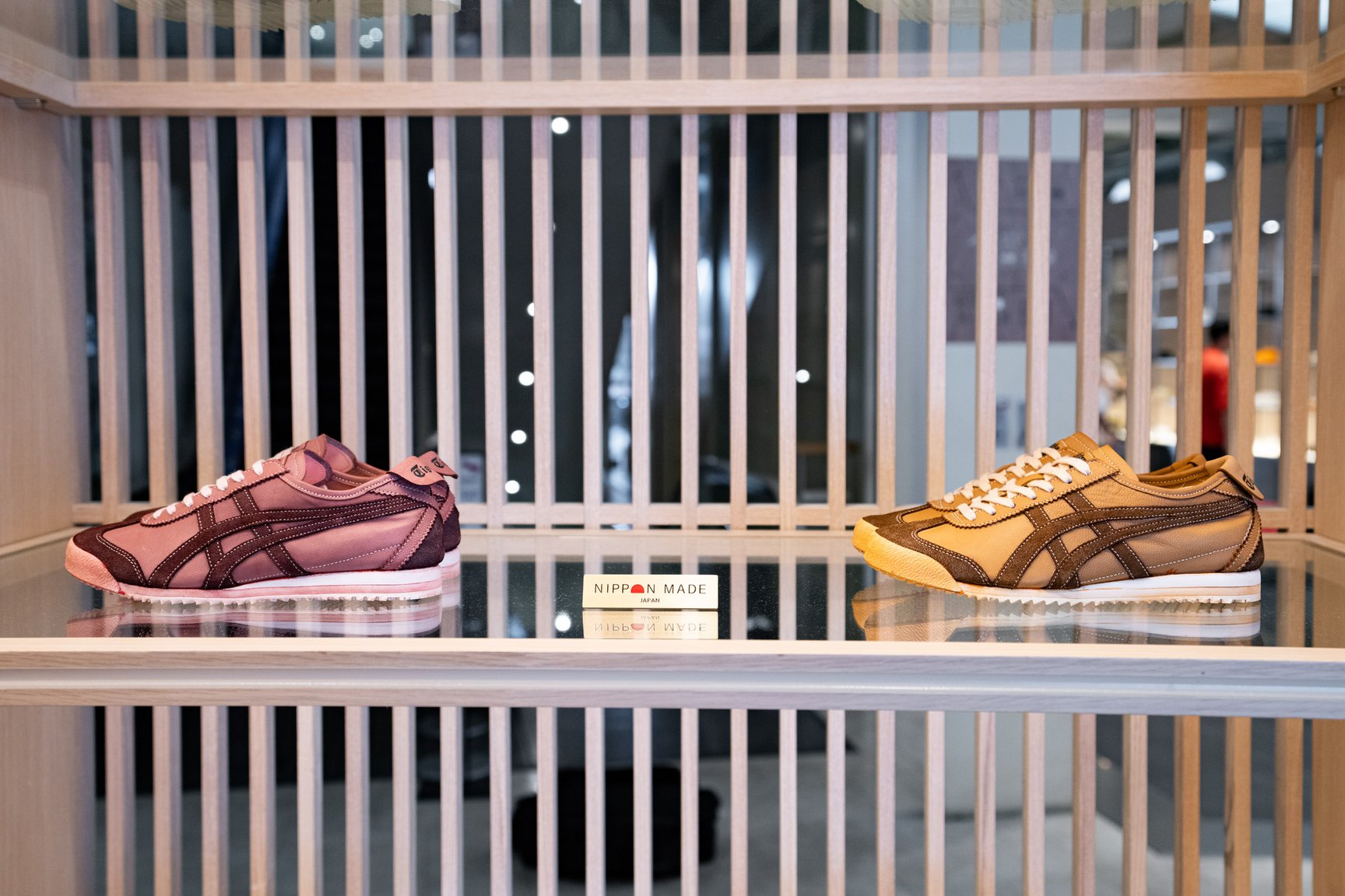 「MEXICO 66」が一面に陳列されたウォールや、チャンキーソールや異素材をMIXしたコンテンポラリーなモデルを集めたウォールが対面に配置されるなど、デザインのバリエーションも豊富です。つま先部とかかと部が特徴的な「OHBORI A50」はオニツカタイガー75周年アニバーサリーアイテムとして復刻発売。12月までの毎月、ブランド誕生のきっかけとなったモデルや時代のゲームチェンジャーとなったモデルが続々と登場するので要チェックです。