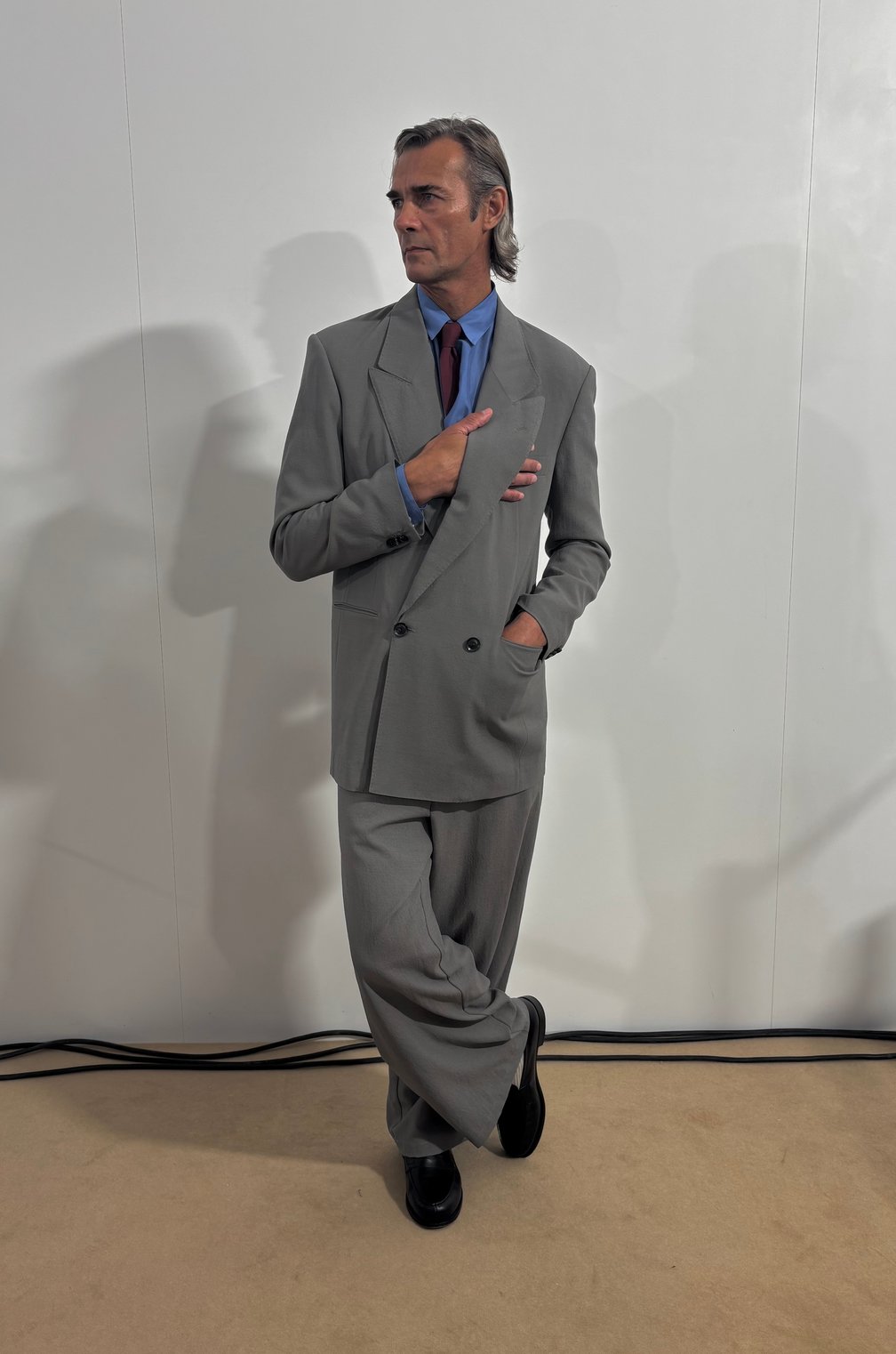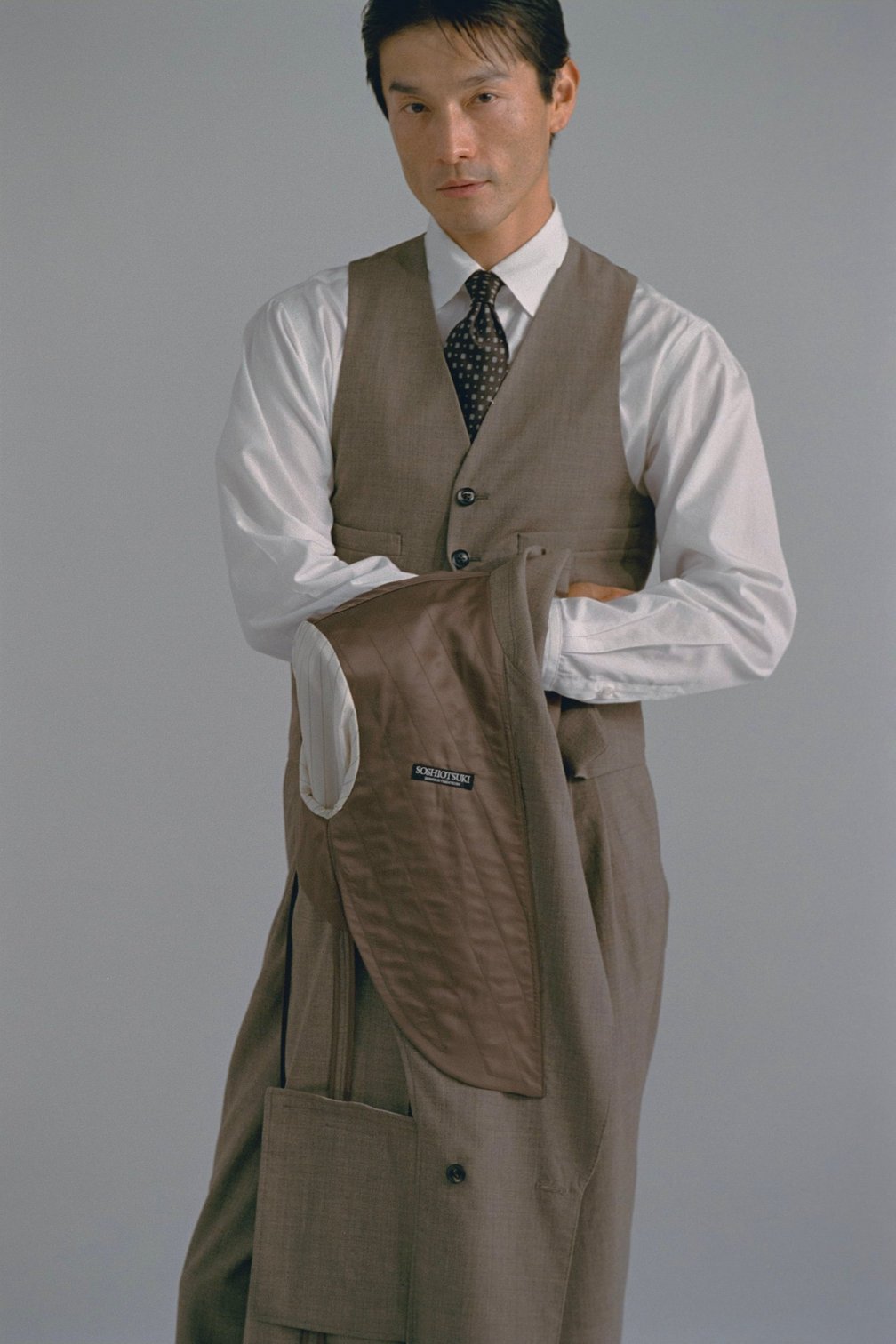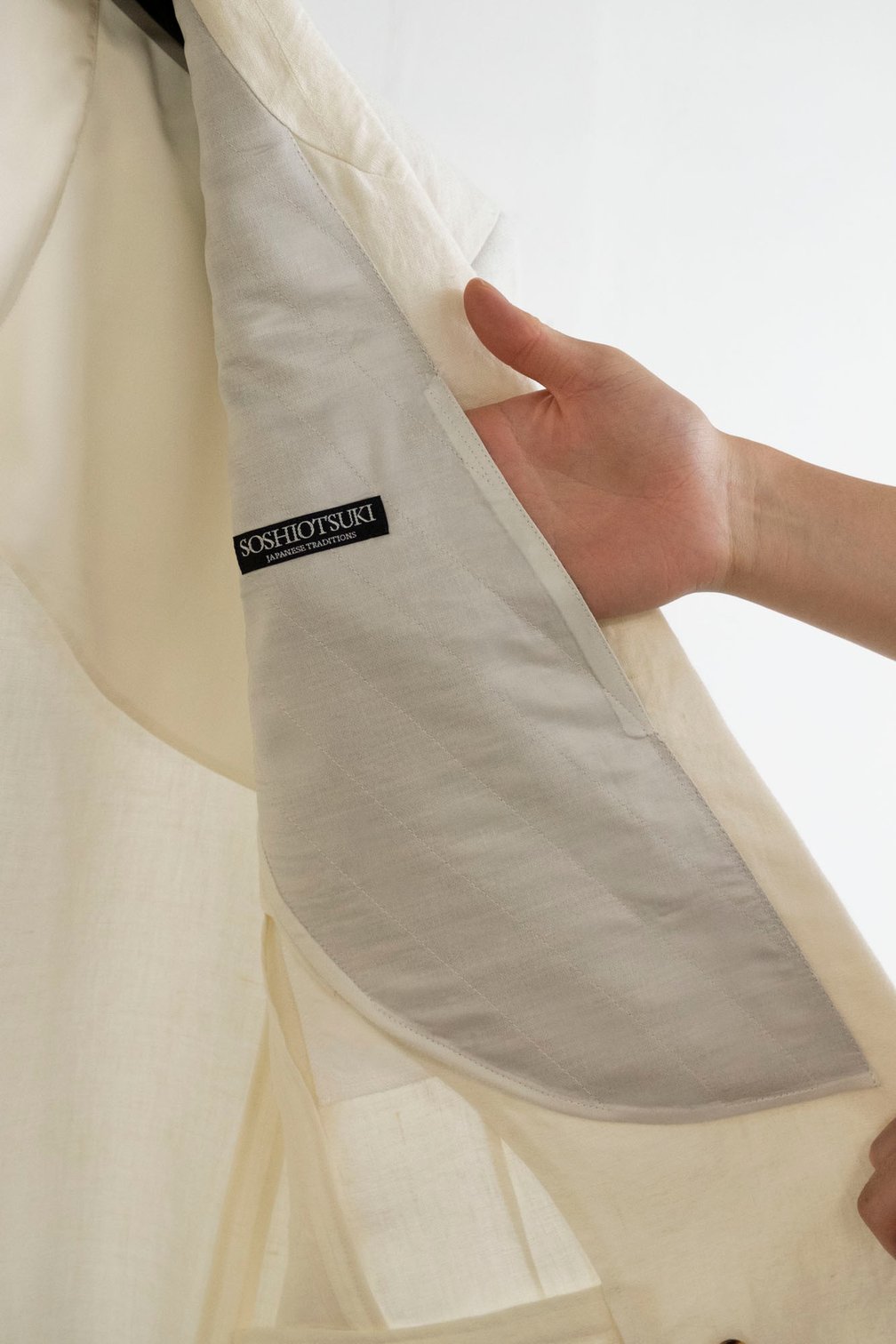 大月:これはFASHIONSNAPで行った津村さんとの対談がきっかけで生まれたアイデアなんですが「着物に見られる日本人の隙間活用の美意識を踏襲していますよ」と説明しても絶対に伝わらないから、手を入れて、ジェスチャーとして「着物なんですよ」というワンパンチで行った方がいい、と。「洋服が所作を与える、そしたらその所作が美しい」みたいなことを吉田が言っていて「さすがだな」と思った。