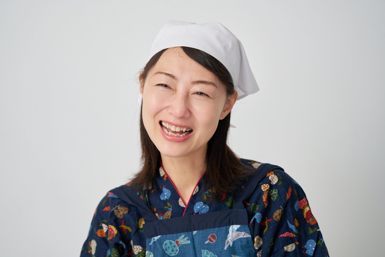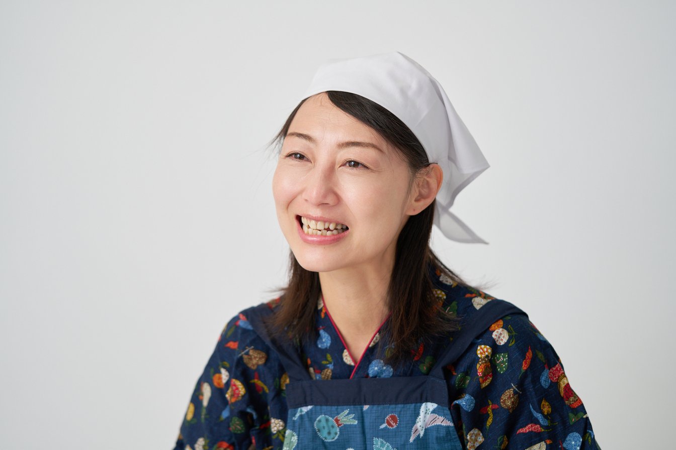 ワークショップでは割烹着を着用するという大湯さん