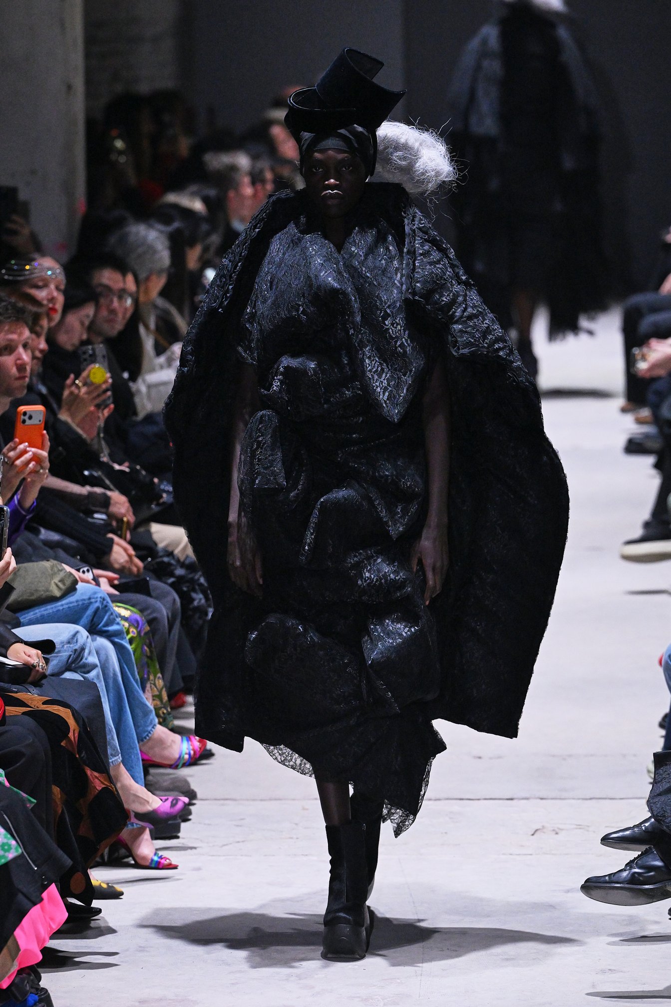 「コム デ ギャルソン (COMME des GARÇONS)」は、川久保玲が半世紀にわたり探求し続けてきた、ブランドの代名詞でもある「黒」をテーマに、ひとつの到達点となるコレクションを発表。幅広いテクスチャーやテクニックを通して探求された黒は、中盤に登場した同型のピンクのドレスによって対比的に際立たせられ、その色の持つ深みやさらなる可能性を感じさせた。