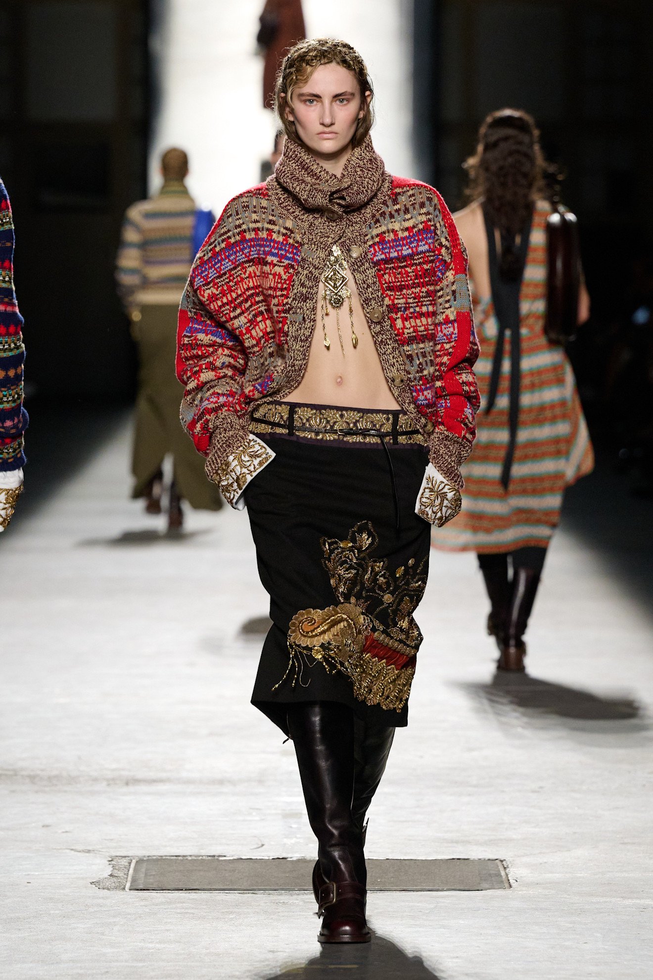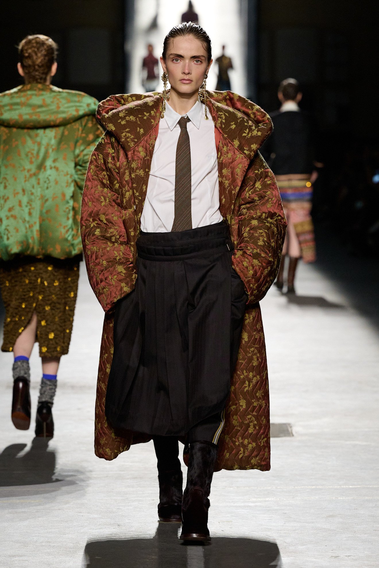 ジュリアン・クロスナー(Julian Klausner)による「ドリス ヴァン ノッテン(DRIES VAN NOTEN)」は、思春期の記憶を手がかりに、制服文化や学生時代の装いを再解釈しながら“自分らしいスタイル”を見つけていく過程を表現。ダッフルコートやシャツ、ネクタイ、プレッピーなブレザー、チェックシャツといった今シーズンのトレンドスクールテイストのアイテムは、ドリス ヴァン ノッテンならではのエキゾチックな刺繍や装飾によって自由な“着崩し”が加えられた。着込んだ風合いのニットや布団のようなボリュームのあるパファージャケット、レトロなフローラル柄のアイテムも登場。「服」がもたらす自信や安心感が打ち出された。