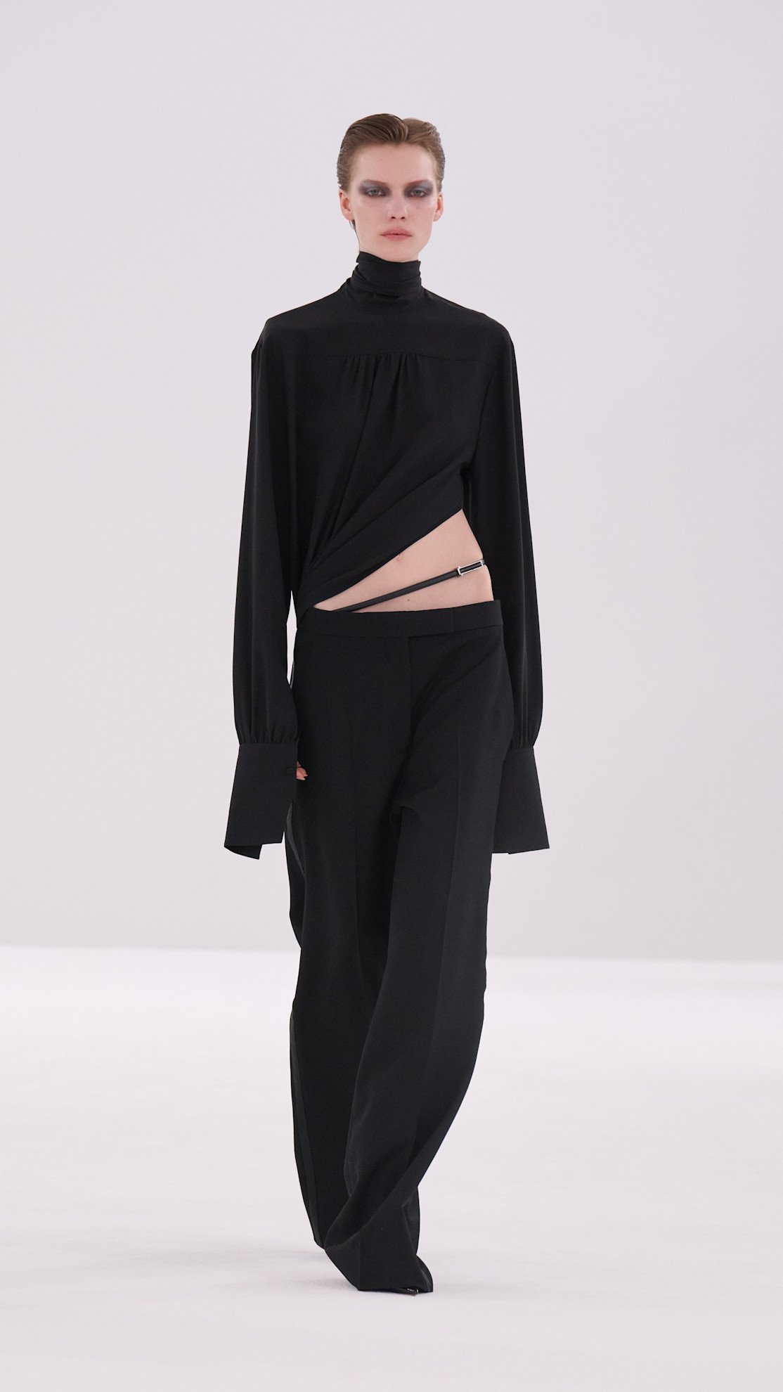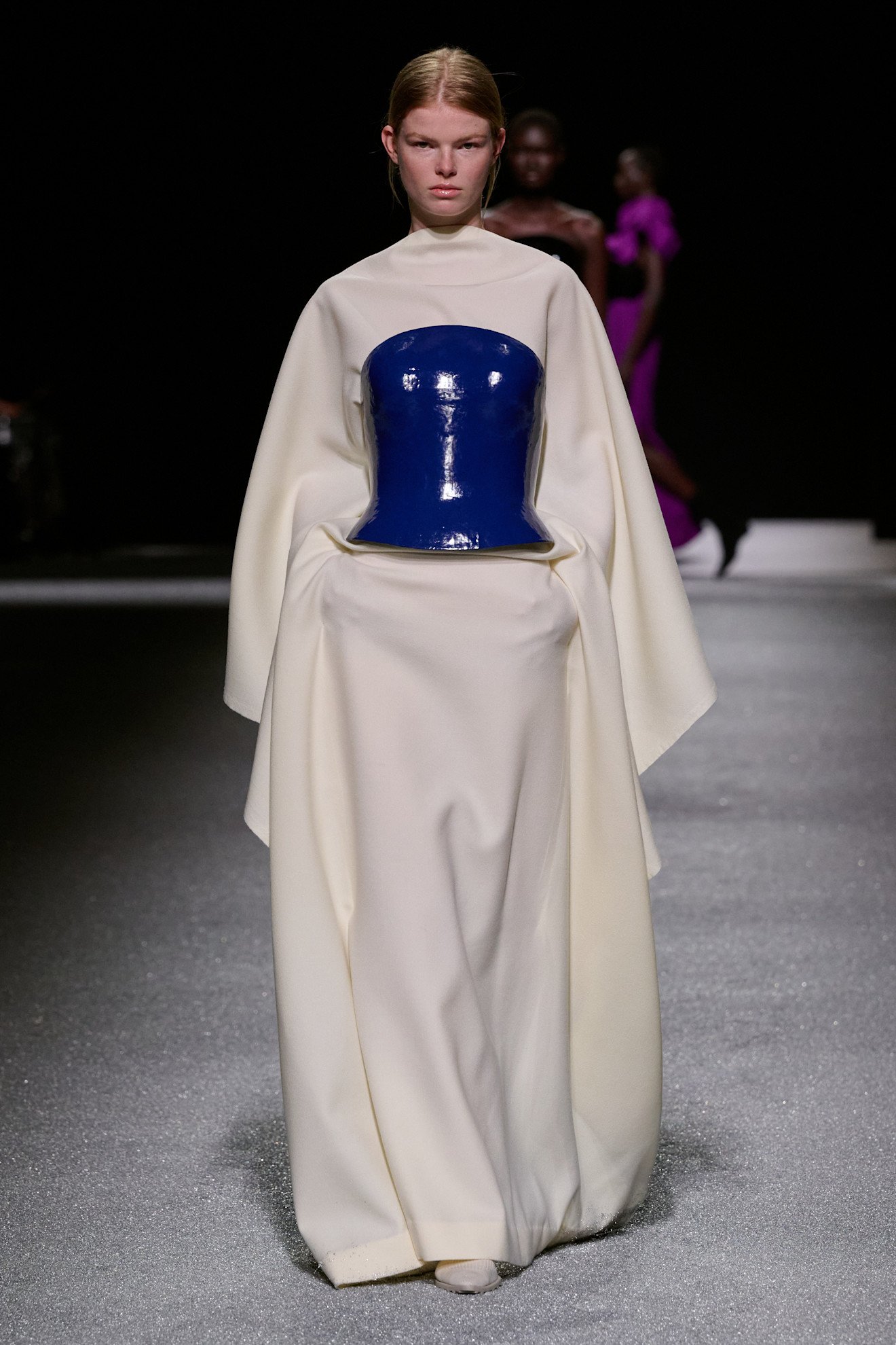 近藤悟史による「イッセイ ミヤケ(ISSEY MIYAKE)」は、「Creating, Allowing ー つくる、つくらない ー」をテーマに、ブランドがこれまでに取り組んできた「一枚の布と身体の関係性」を新たなアプローチで探求。造形を着用者の身体に委ねる、まるで仕立てられていないような「余白」を通して、衣服と一枚の布の境界を探る試みも見られた。漆というサステナブルな素材を通して、三宅一生の「ボディワークス」の概念を現代的に拡張する、「URUSHI BODY」も発表。近藤らしい身体と布・服との関係性の探求が行われた。