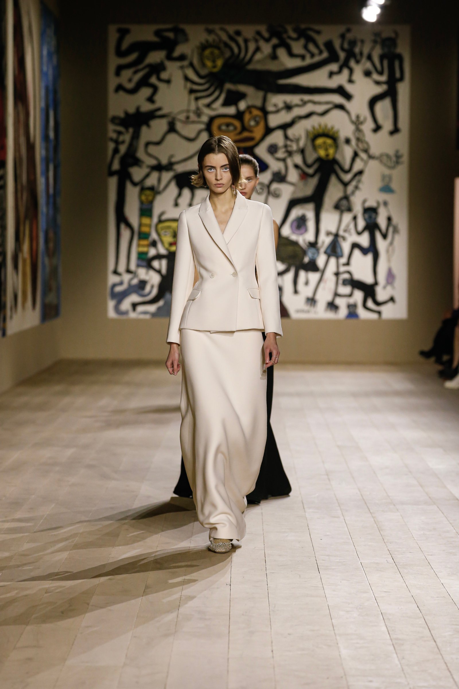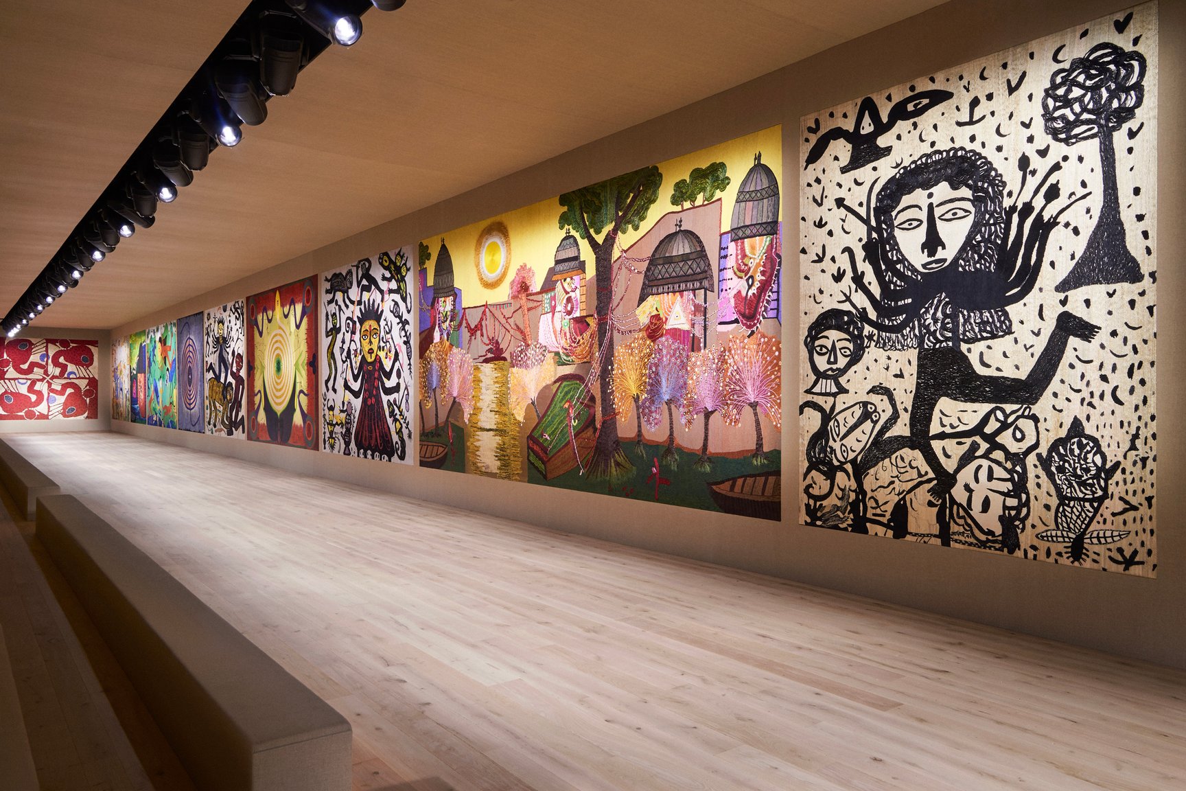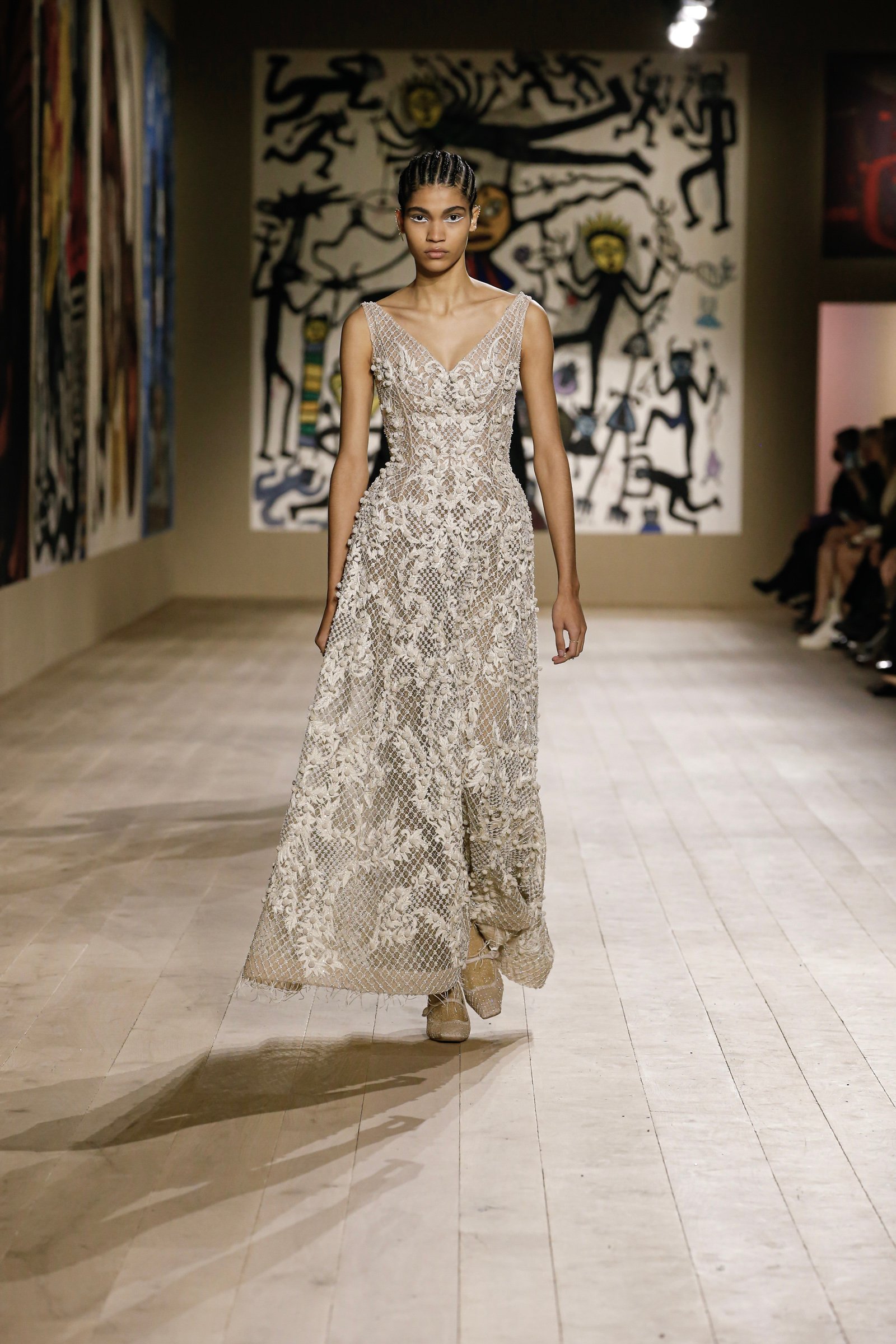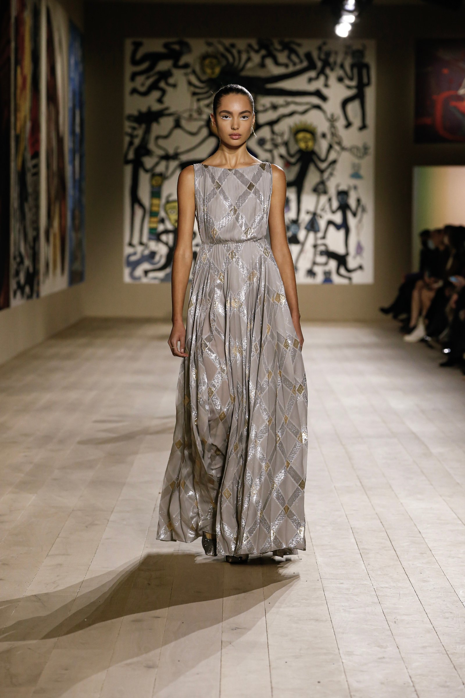 オートクチュール初日の目玉となったのは、マリア・グラツィア・キウリ(Maria Grazia Chiuri)が手掛けるディオール。ショー会場の壁一面を埋め尽くすカラフルな刺繍の舞台装飾は、インド人アーティストのマドヴィ・パレク(Madhvi Parekh)とメヌ・パレク(Manu Parekh)の作品をベースにしたもの。メゾンが支援するインドのチャーナキヤ工房およびチャーナキヤ工芸学校の職人たちの手によって生み出された。