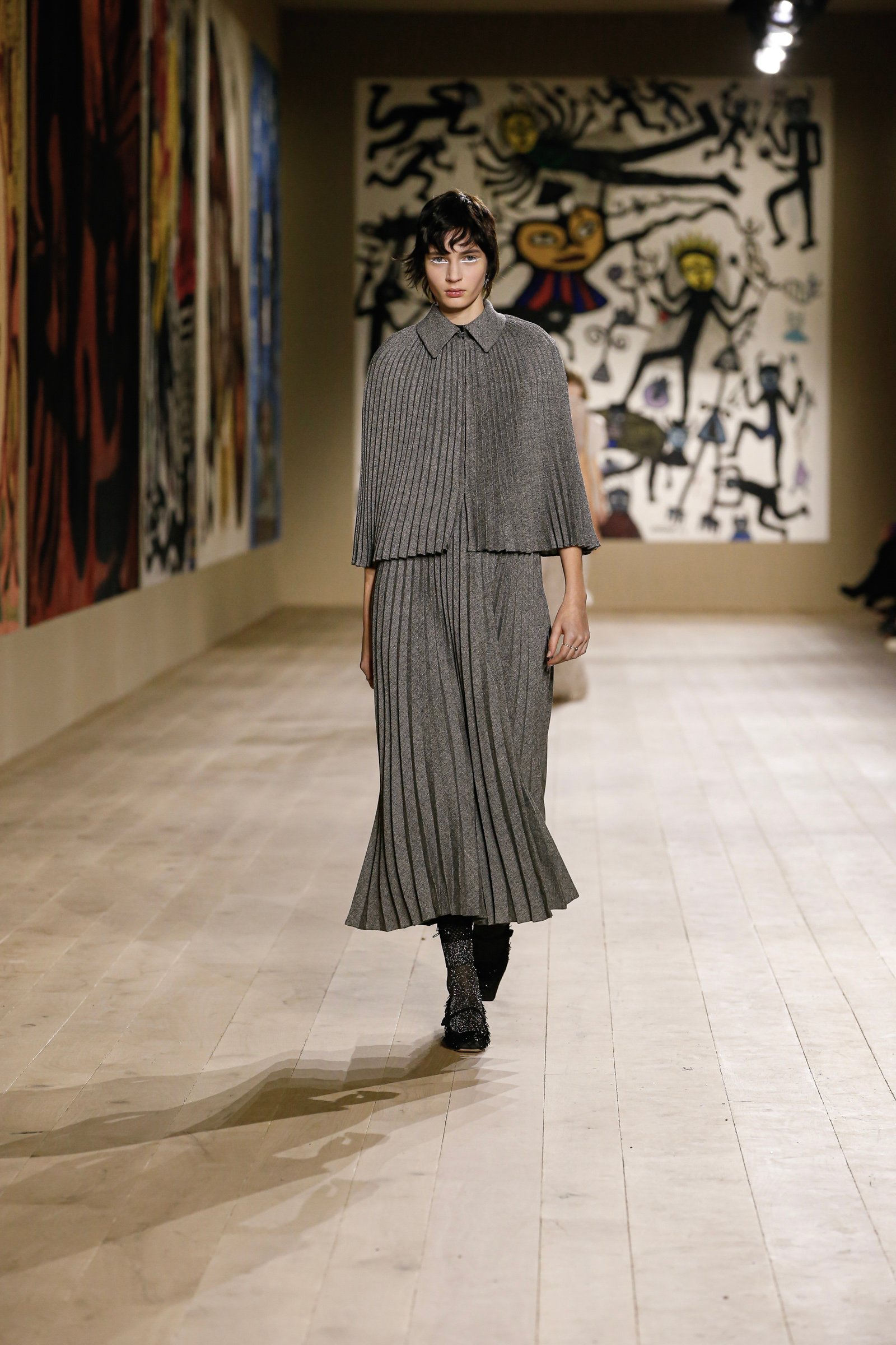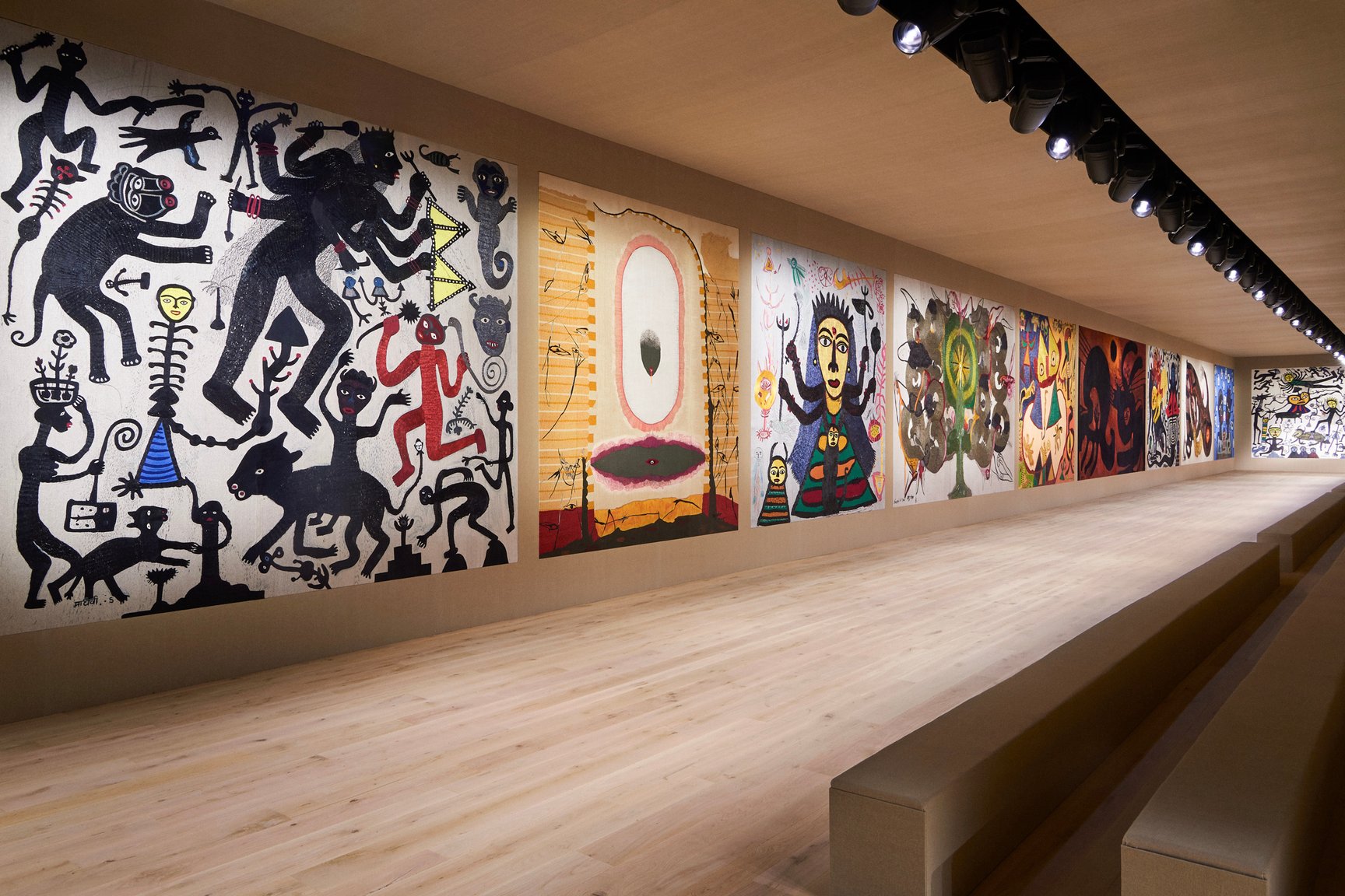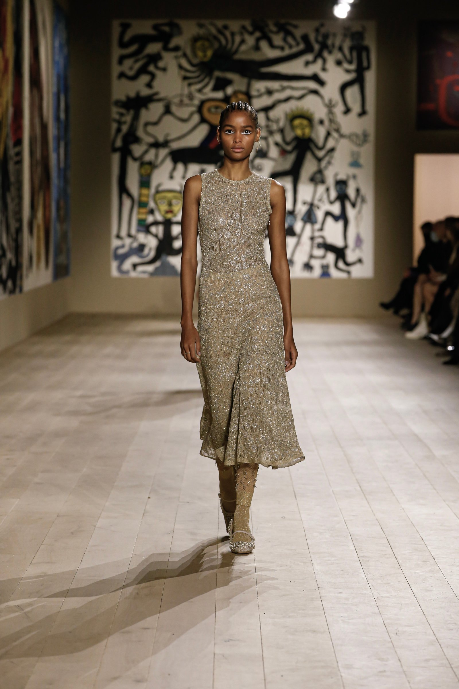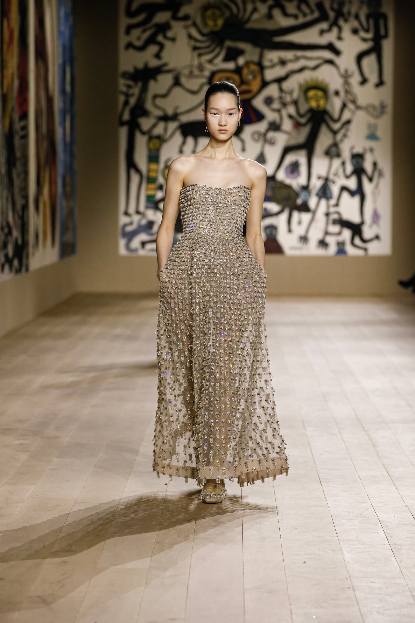 オートクチュール初日の目玉となったのは、マリア・グラツィア・キウリ(Maria Grazia Chiuri)が手掛けるディオール。ショー会場の壁一面を埋め尽くすカラフルな刺繍の舞台装飾は、インド人アーティストのマドヴィ・パレク(Madhvi Parekh)とメヌ・パレク(Manu Parekh)の作品をベースにしたもの。メゾンが支援するインドのチャーナキヤ工房およびチャーナキヤ工芸学校の職人たちの手によって生み出された。