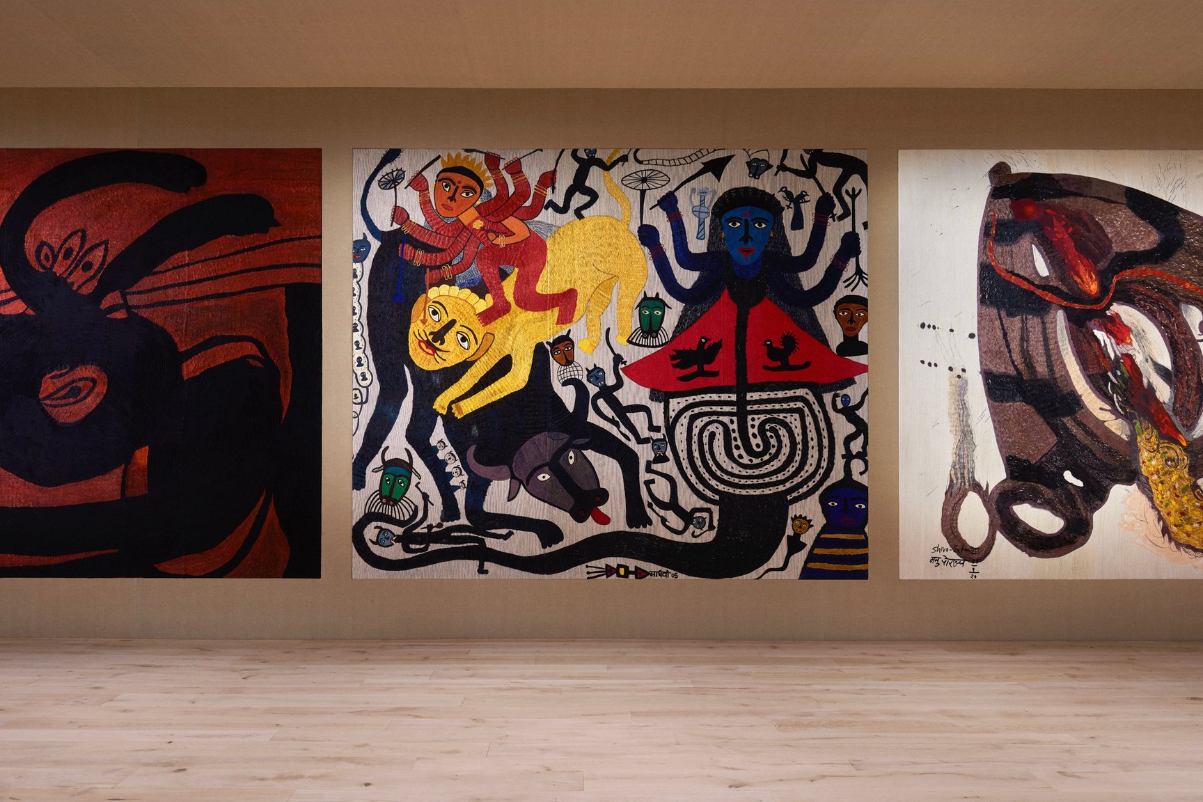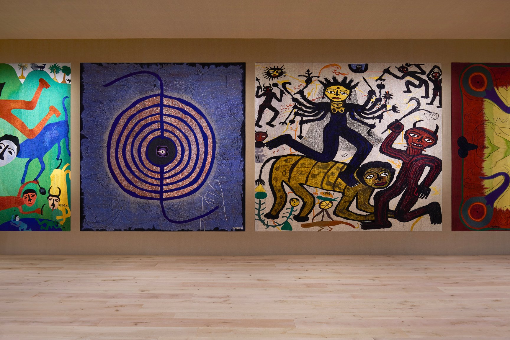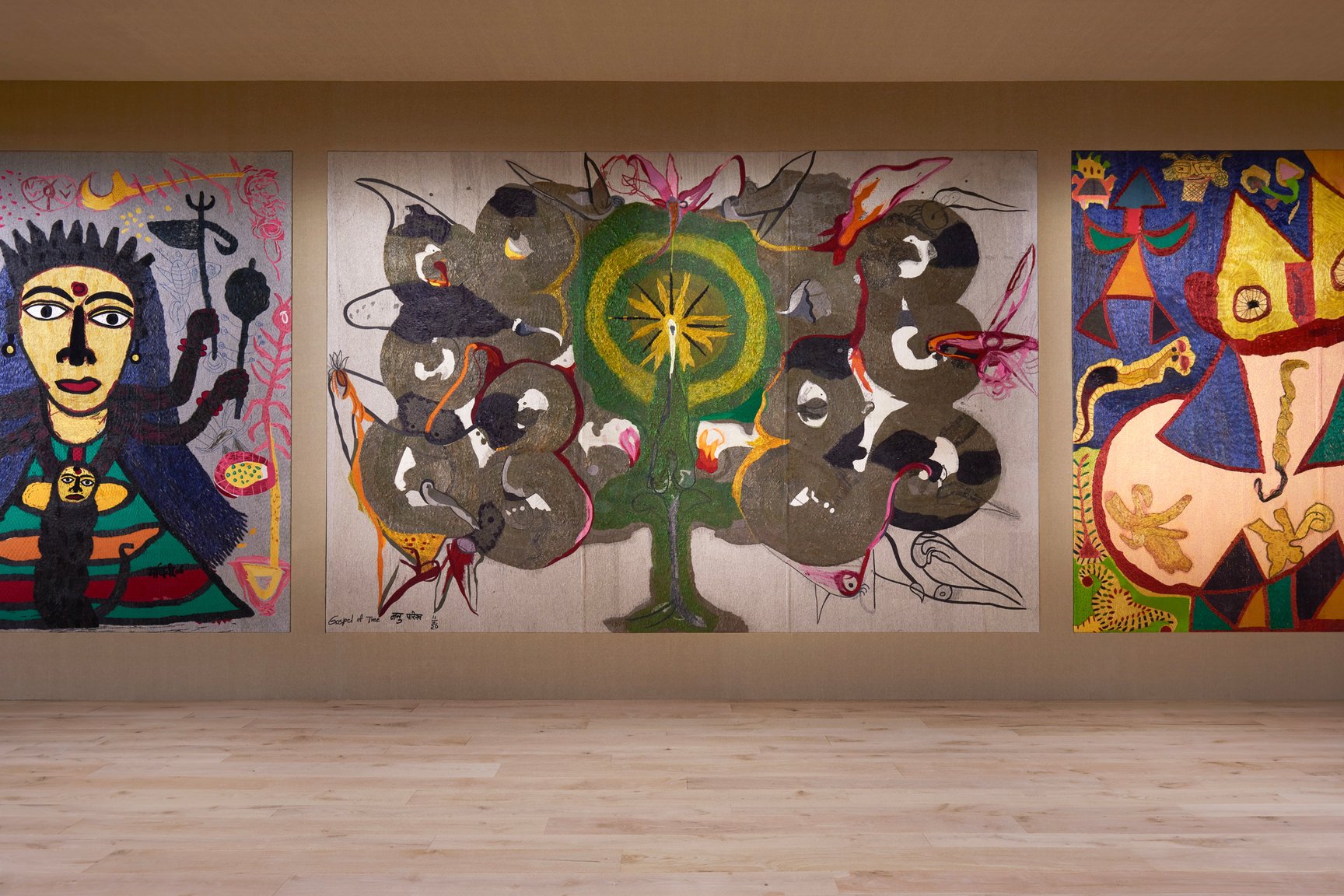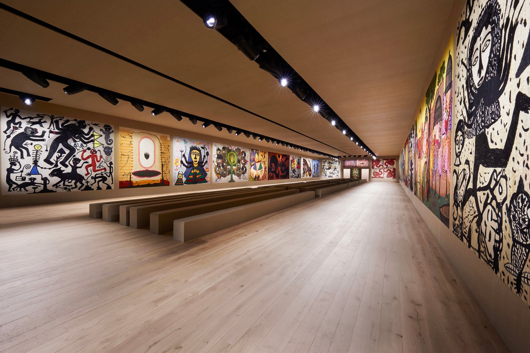 オートクチュール初日の目玉となったのは、マリア・グラツィア・キウリ(Maria Grazia Chiuri)が手掛けるディオール。ショー会場の壁一面を埋め尽くすカラフルな刺繍の舞台装飾は、インド人アーティストのマドヴィ・パレク(Madhvi Parekh)とメヌ・パレク(Manu Parekh)の作品をベースにしたもの。メゾンが支援するインドのチャーナキヤ工房およびチャーナキヤ工芸学校の職人たちの手によって生み出された。