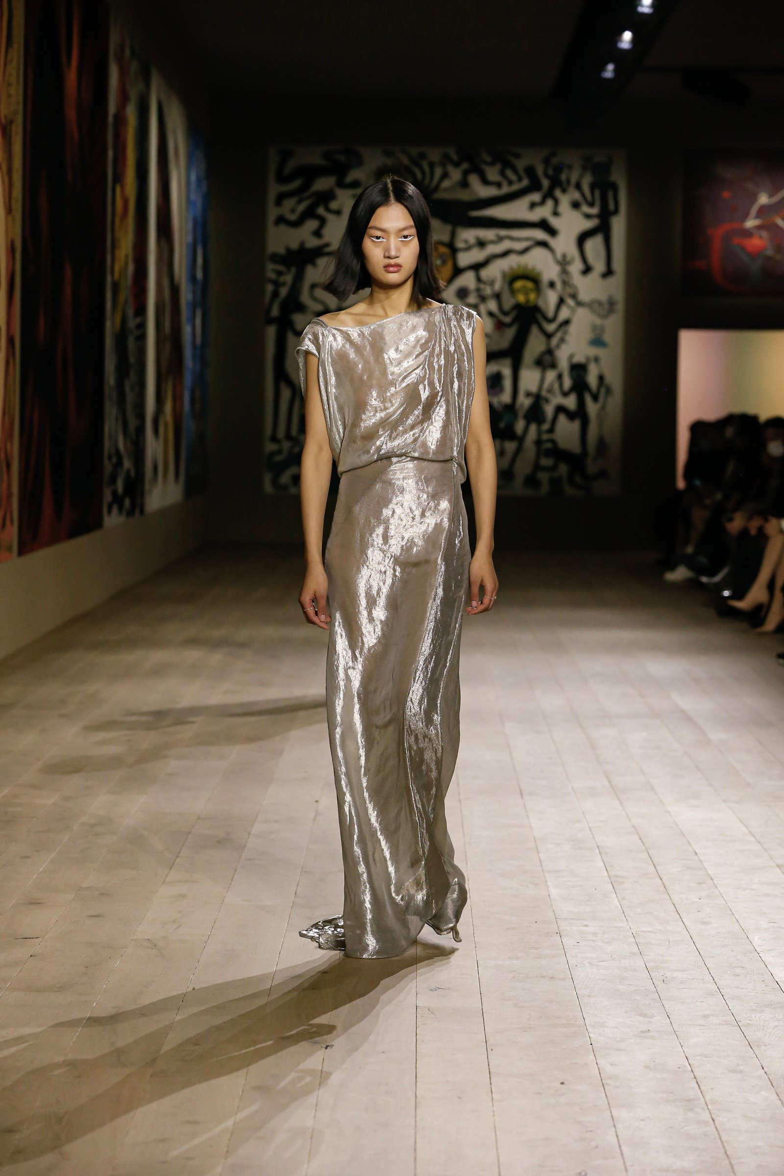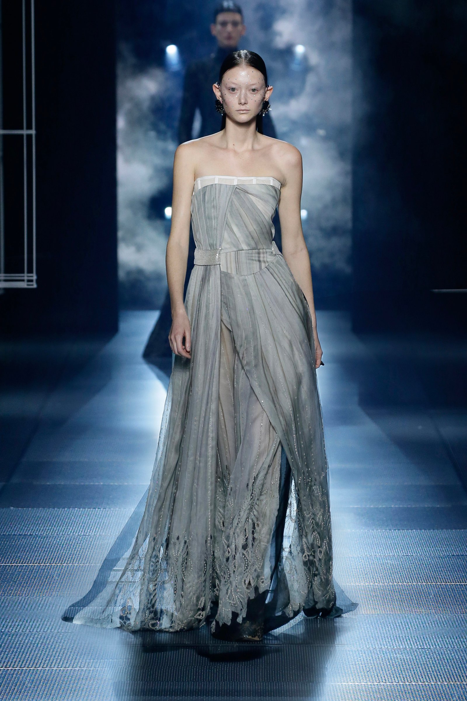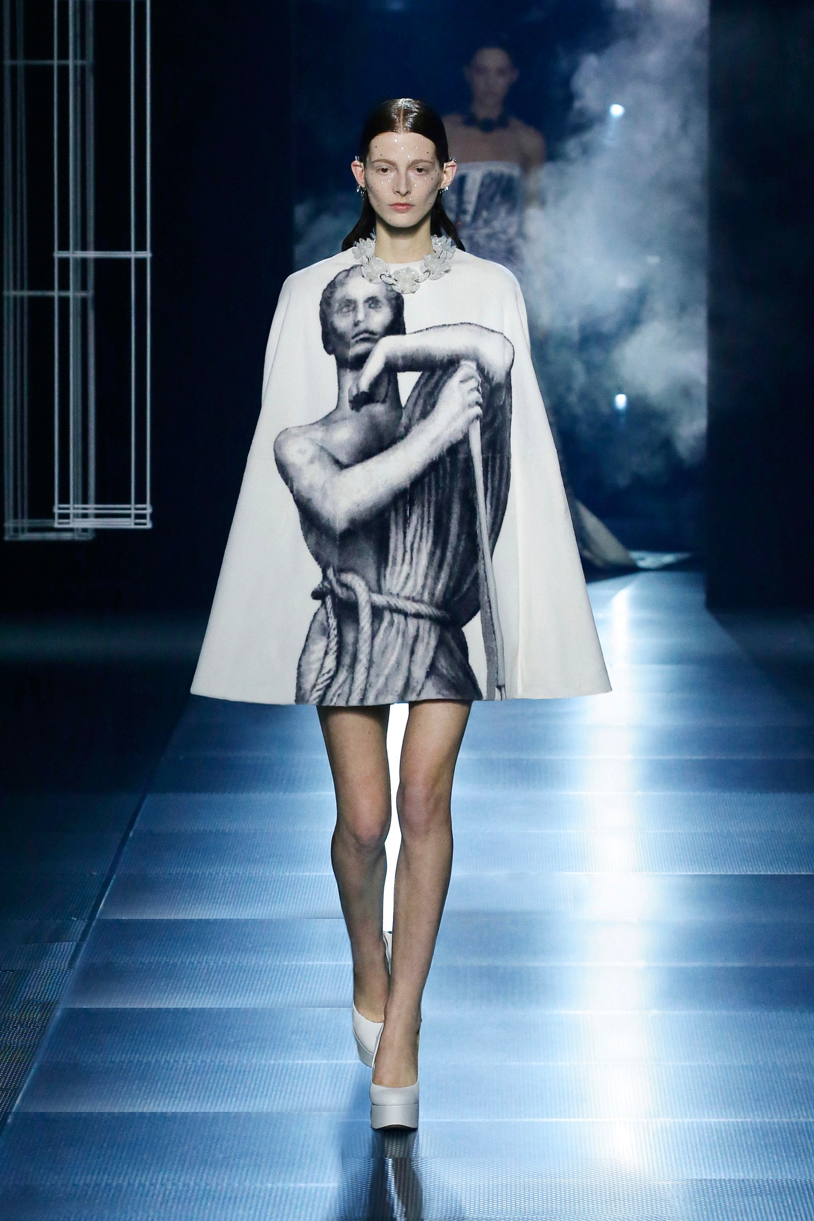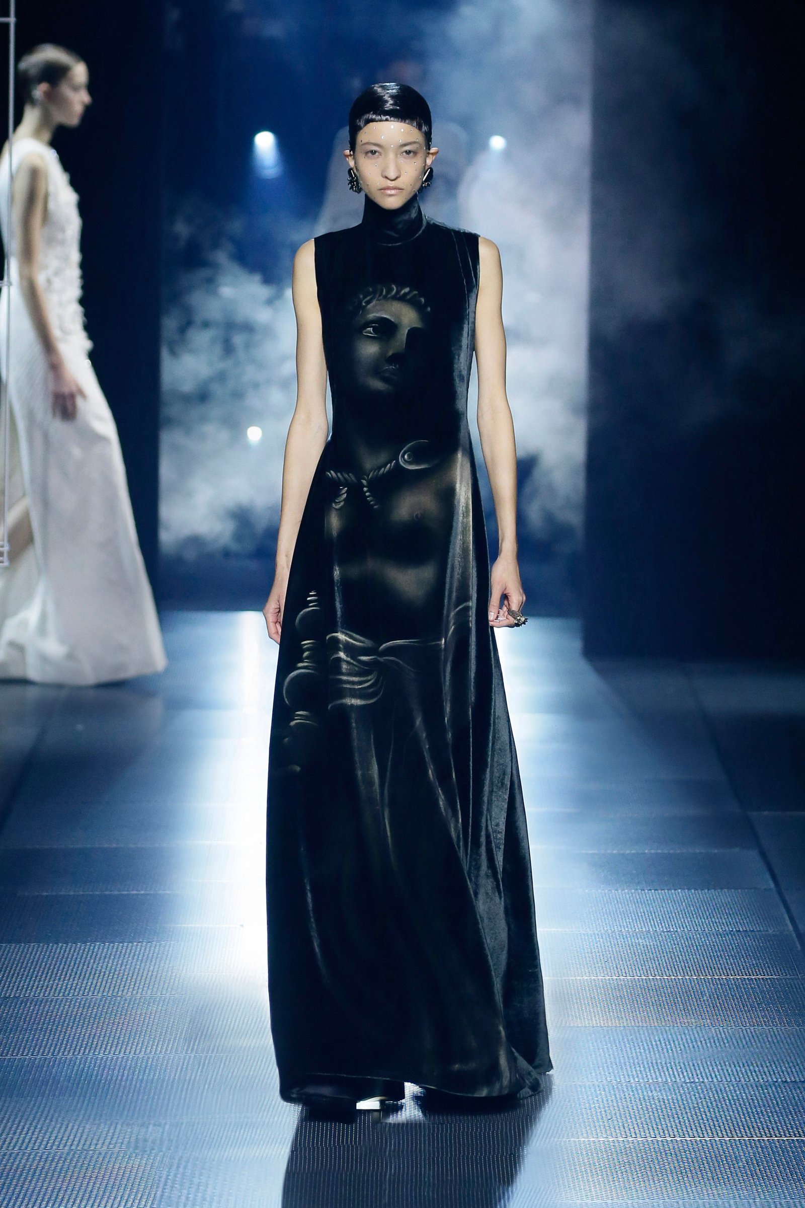コレクションのテーマは、メゾンのルーツであるローマ。古代から想像上の未来まで、ローマのさまざまな時代をクチュールで表現した。古代ギリシアの女性が着用していた長衣(ペプロス)をアレンジしたドレスをまとったモデルたちは、まるで女神のよう。
