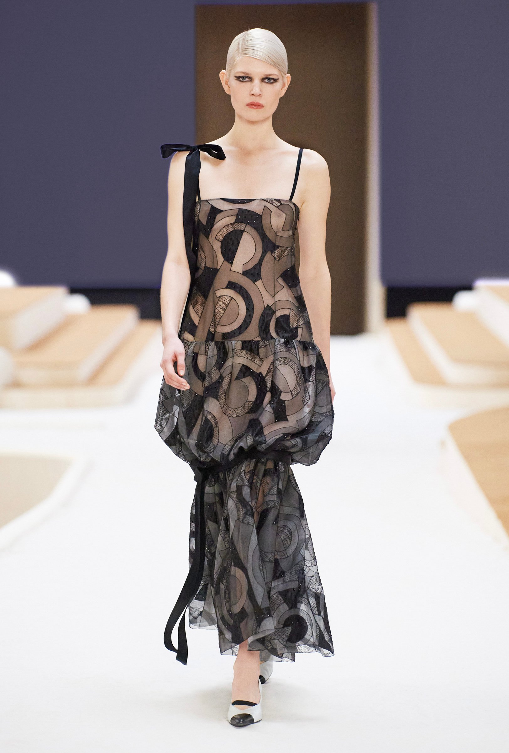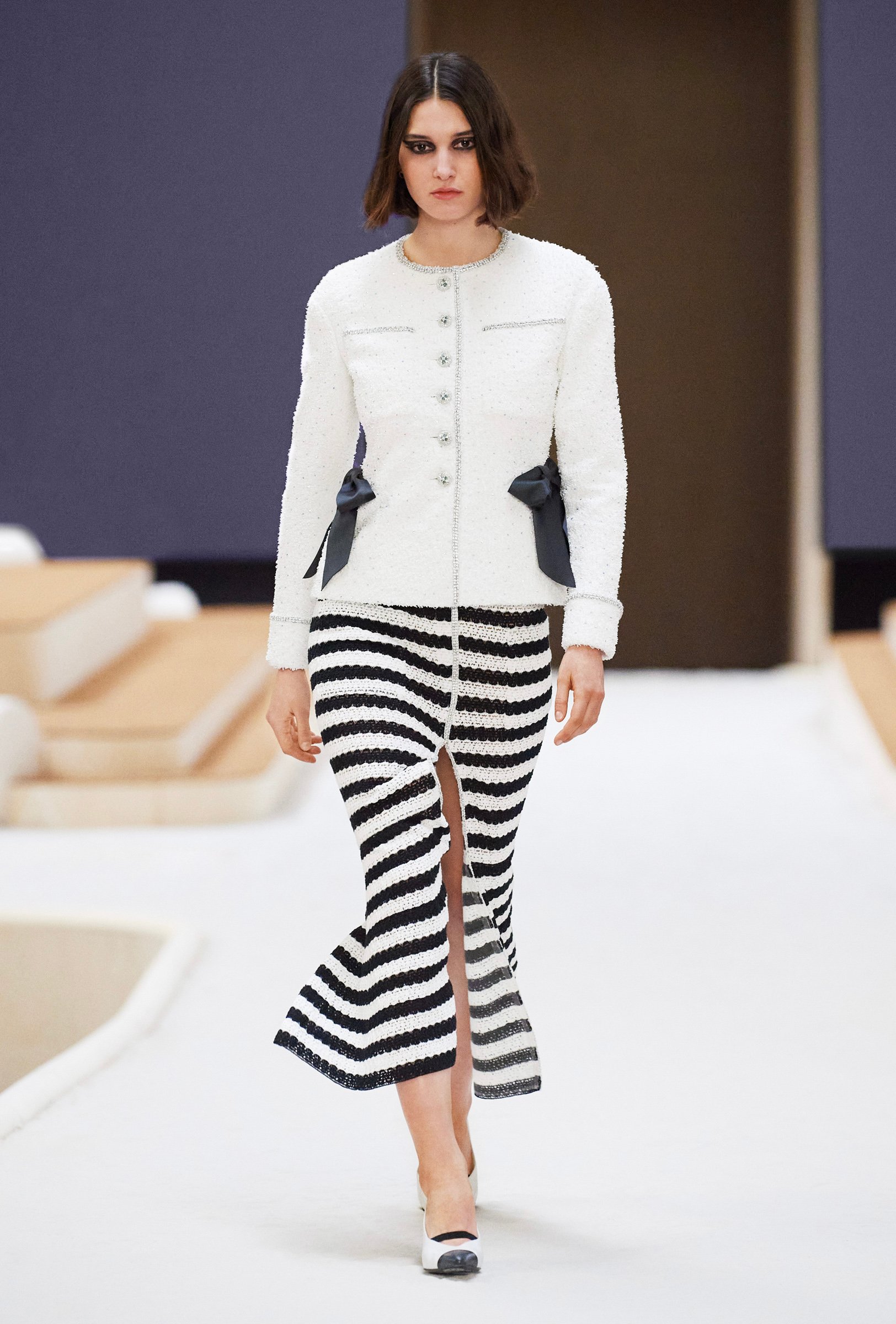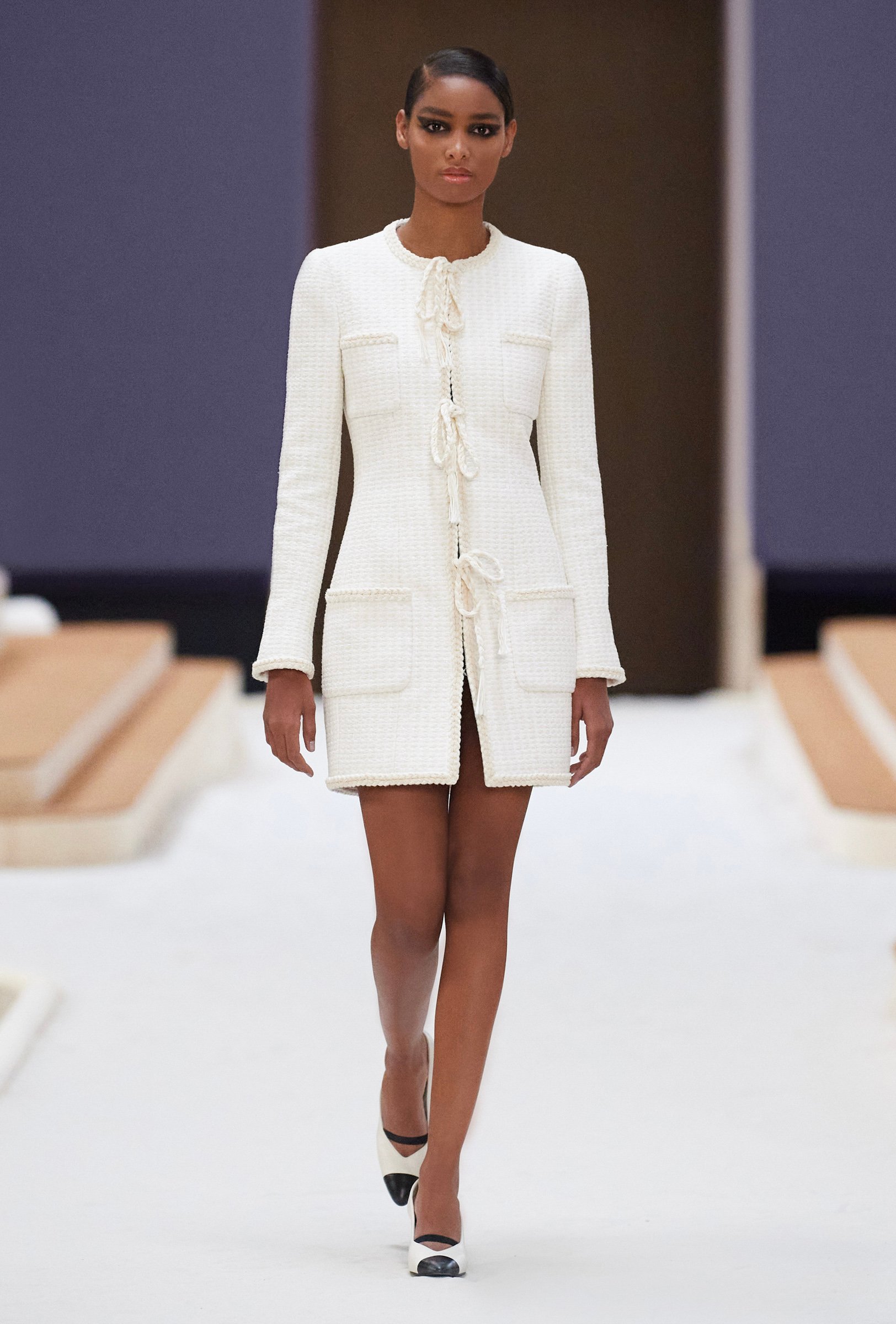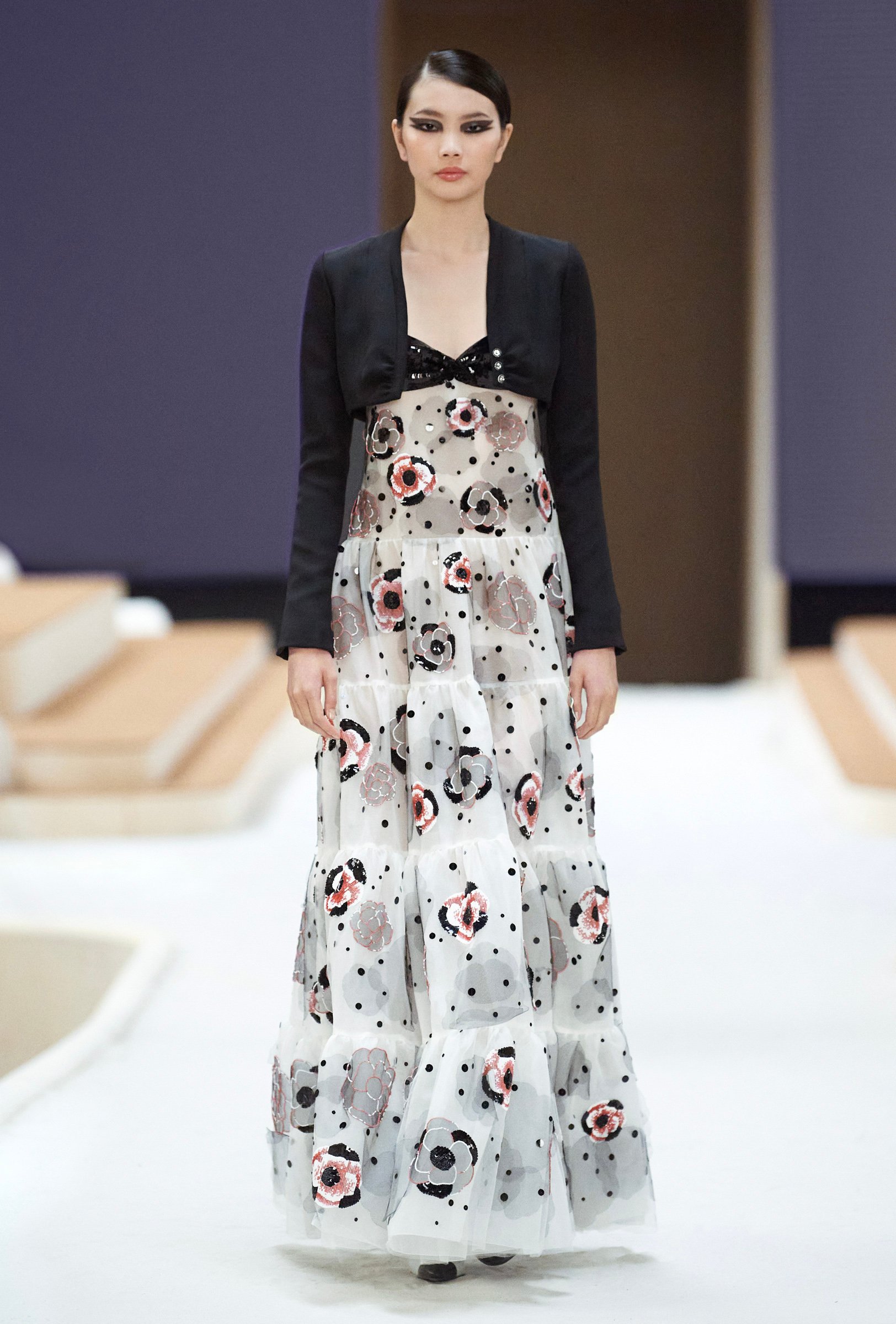 ブラック、ホワイト、コーラルのカラーパレットで彩られたコレクションは、軽快でフレッシュなムード。また、カメリアの刺繍が全面に施されたドレスは、今回のキーアイテムの一つ。アーティスティック ディレクターのヴィルジニー・ヴィアール(Virginie Viard)が「ガブリエル・シャネル(Gabrielle Chanel)との時を超えた対話」と呼んだ、リトル ブラック ジャケットもモダンな解釈が光る。片目だけスモーキーに仕上げたアイメイクも印象的だ。