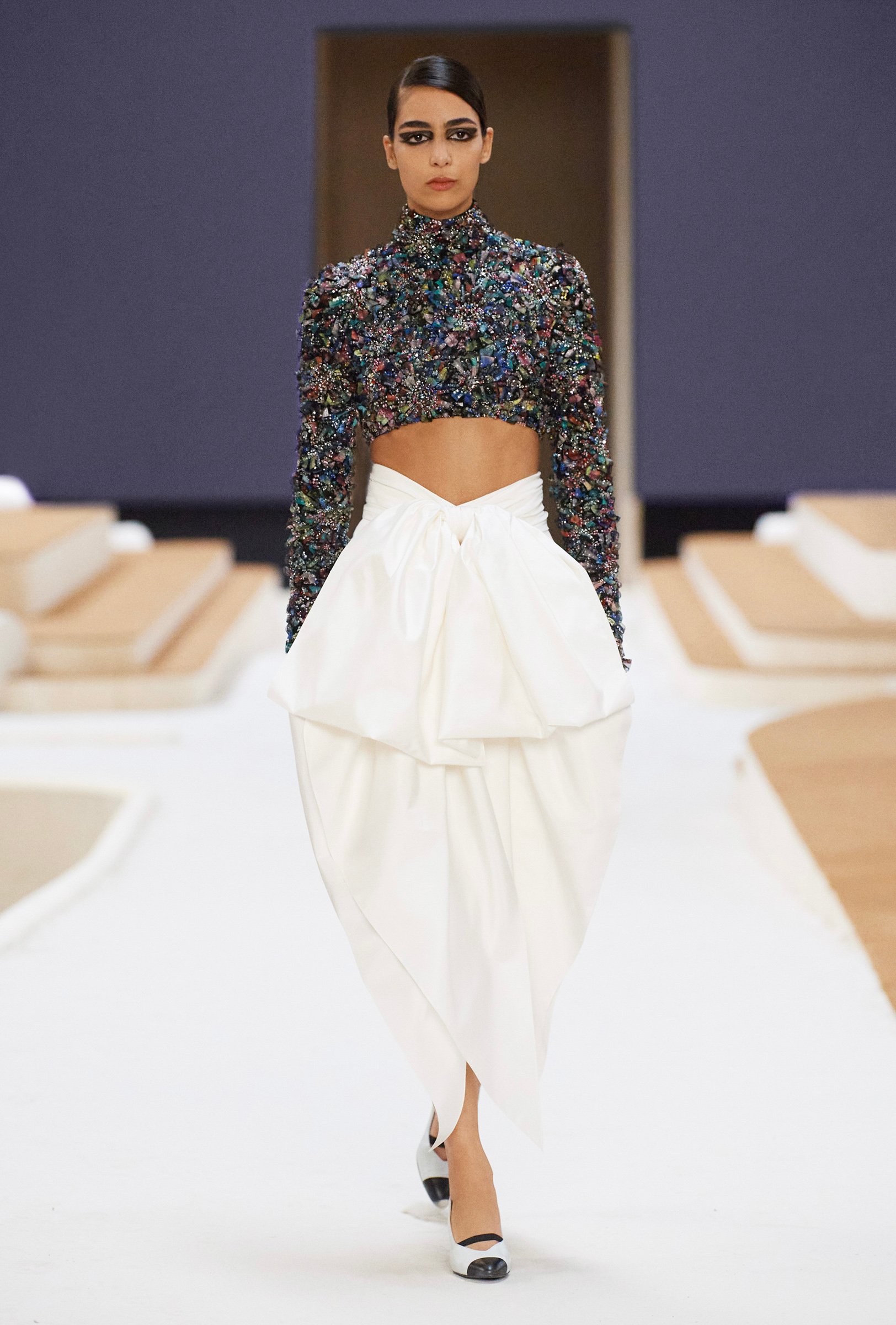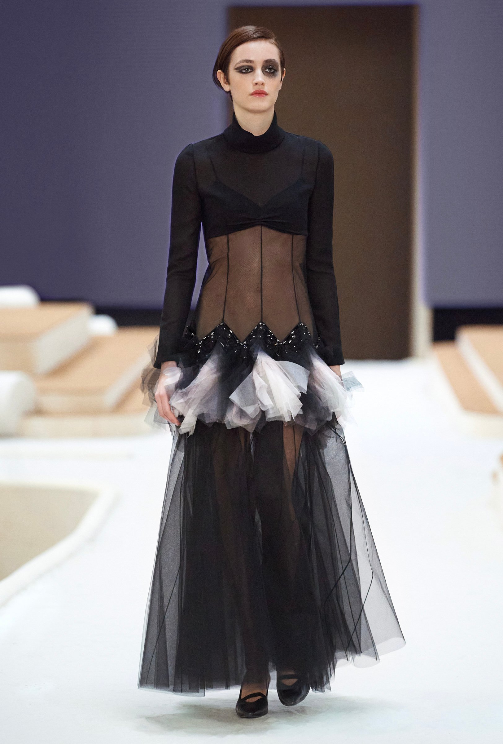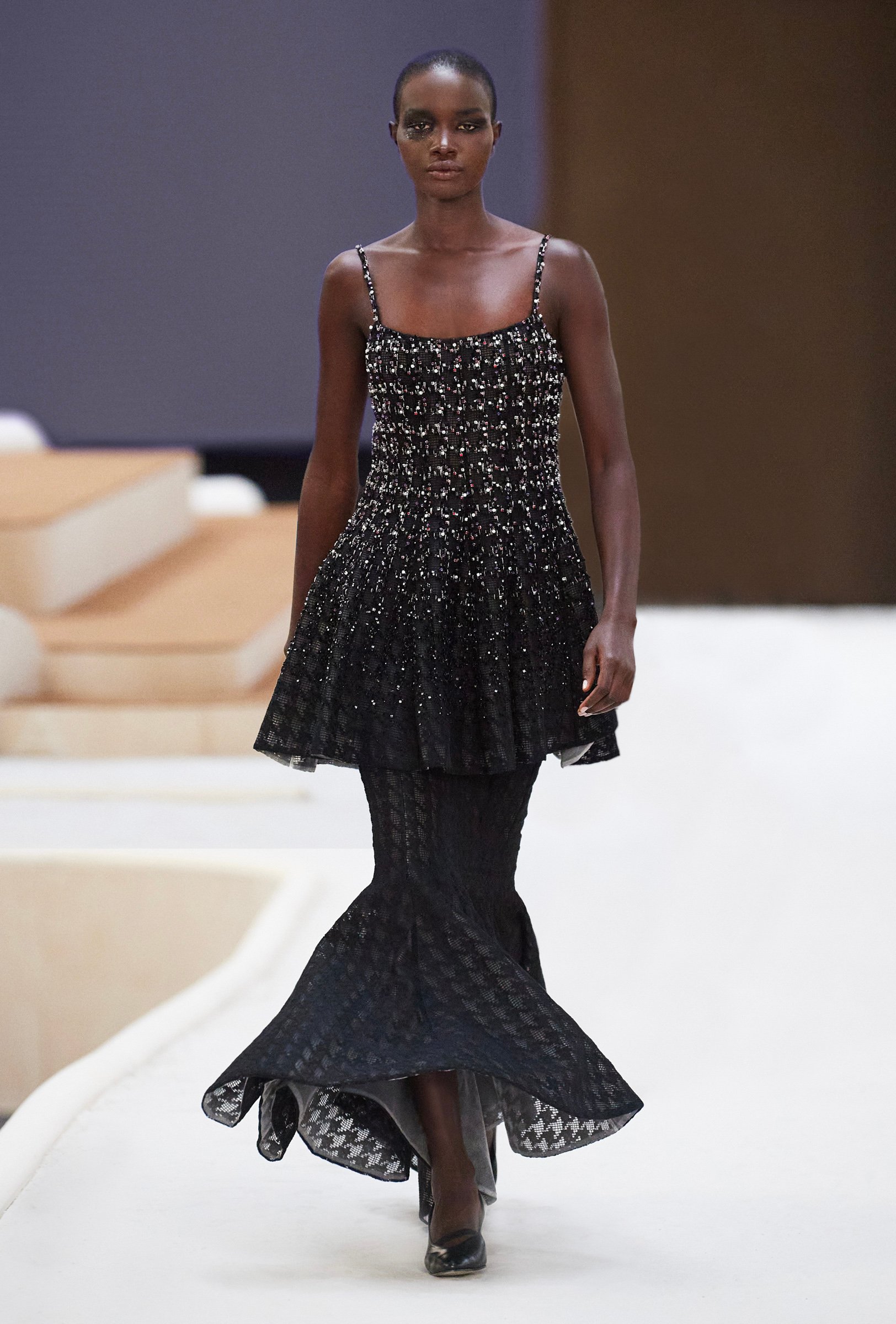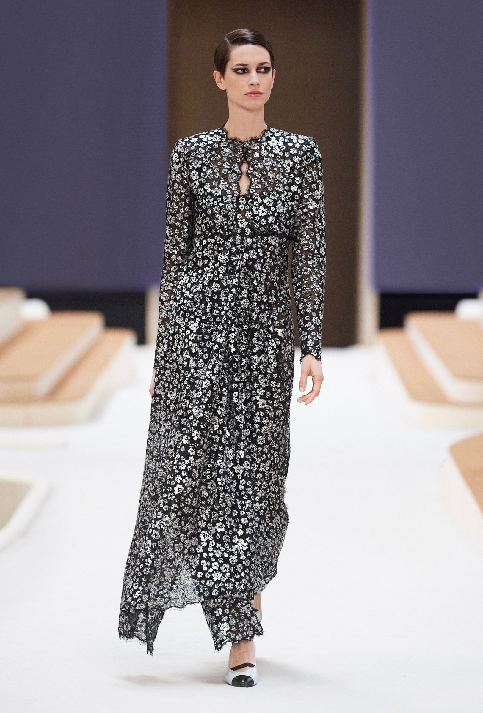 ブラック、ホワイト、コーラルのカラーパレットで彩られたコレクションは、軽快でフレッシュなムード。また、カメリアの刺繍が全面に施されたドレスは、今回のキーアイテムの一つ。アーティスティック ディレクターのヴィルジニー・ヴィアール(Virginie Viard)が「ガブリエル・シャネル(Gabrielle Chanel)との時を超えた対話」と呼んだ、リトル ブラック ジャケットもモダンな解釈が光る。片目だけスモーキーに仕上げたアイメイクも印象的だ。