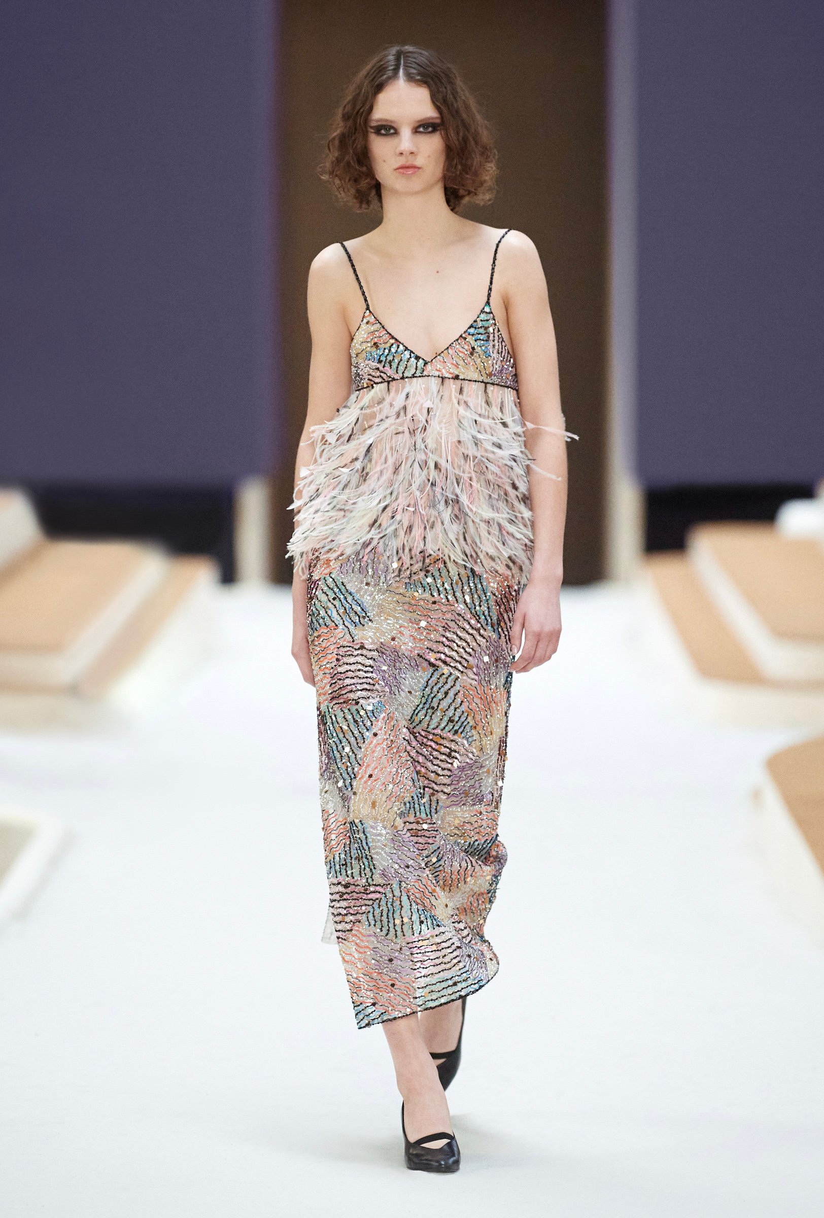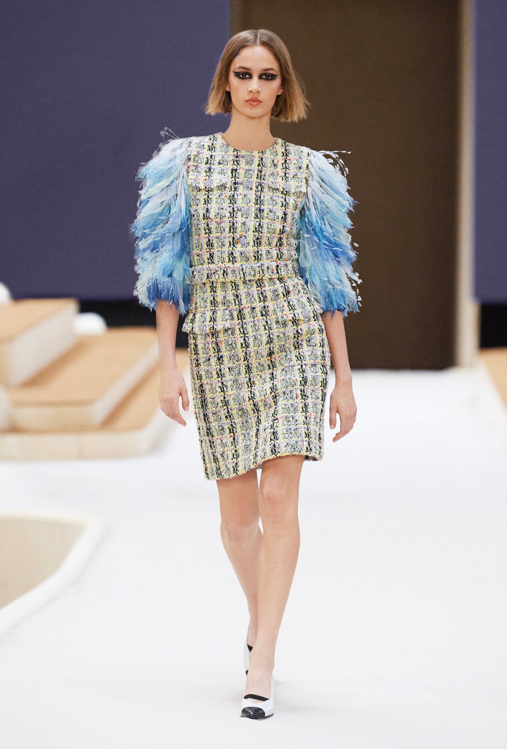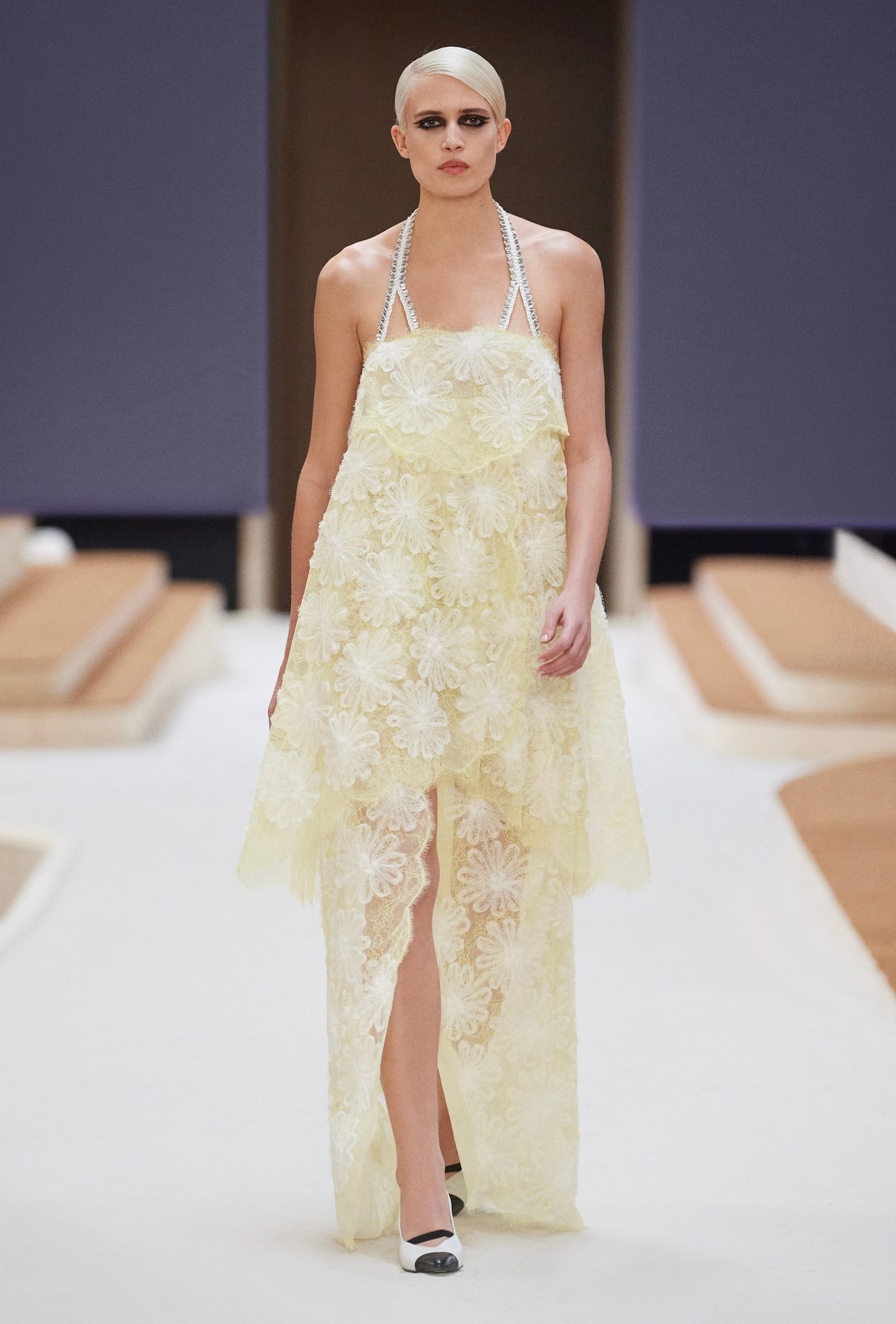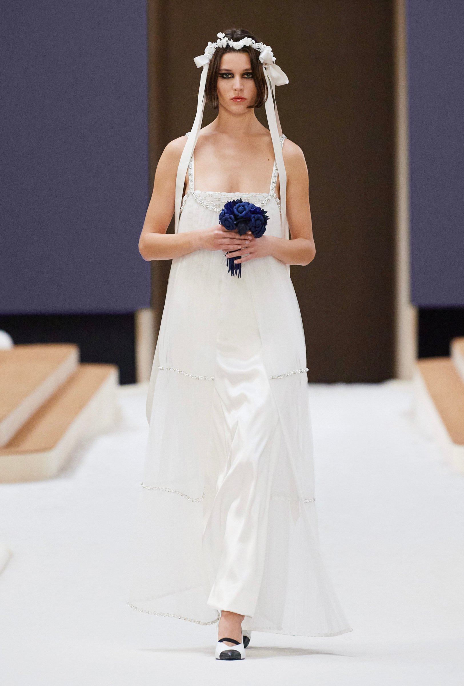ブラック、ホワイト、コーラルのカラーパレットで彩られたコレクションは、軽快でフレッシュなムード。また、カメリアの刺繍が全面に施されたドレスは、今回のキーアイテムの一つ。アーティスティック ディレクターのヴィルジニー・ヴィアール(Virginie Viard)が「ガブリエル・シャネル(Gabrielle Chanel)との時を超えた対話」と呼んだ、リトル ブラック ジャケットもモダンな解釈が光る。片目だけスモーキーに仕上げたアイメイクも印象的だ。