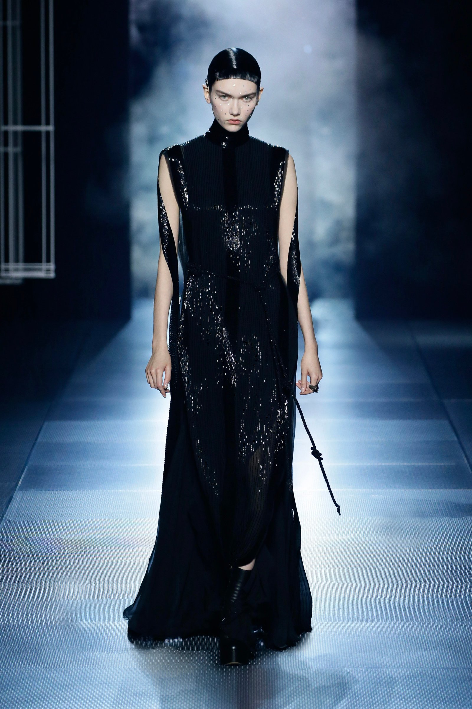 キム・ジョーンズ(Kim Jones)が手掛けるフェンディは、かつてのパリ証券取引所内に宇宙的なセットを作り上げた。天井から吊り下げられた黒い地球儀や光るアーチ、スモークといった演出はドラマチックでSF映画さながら。